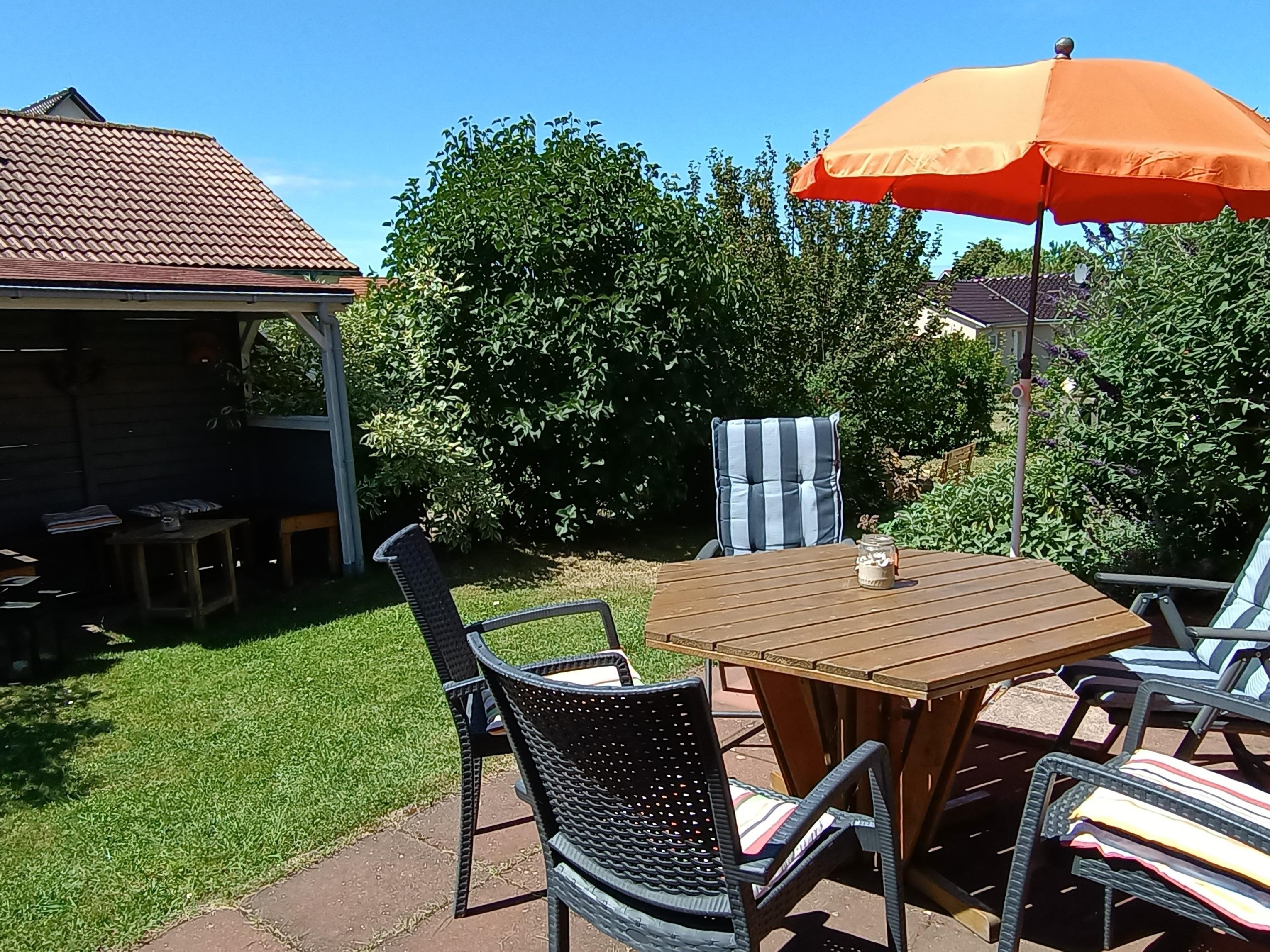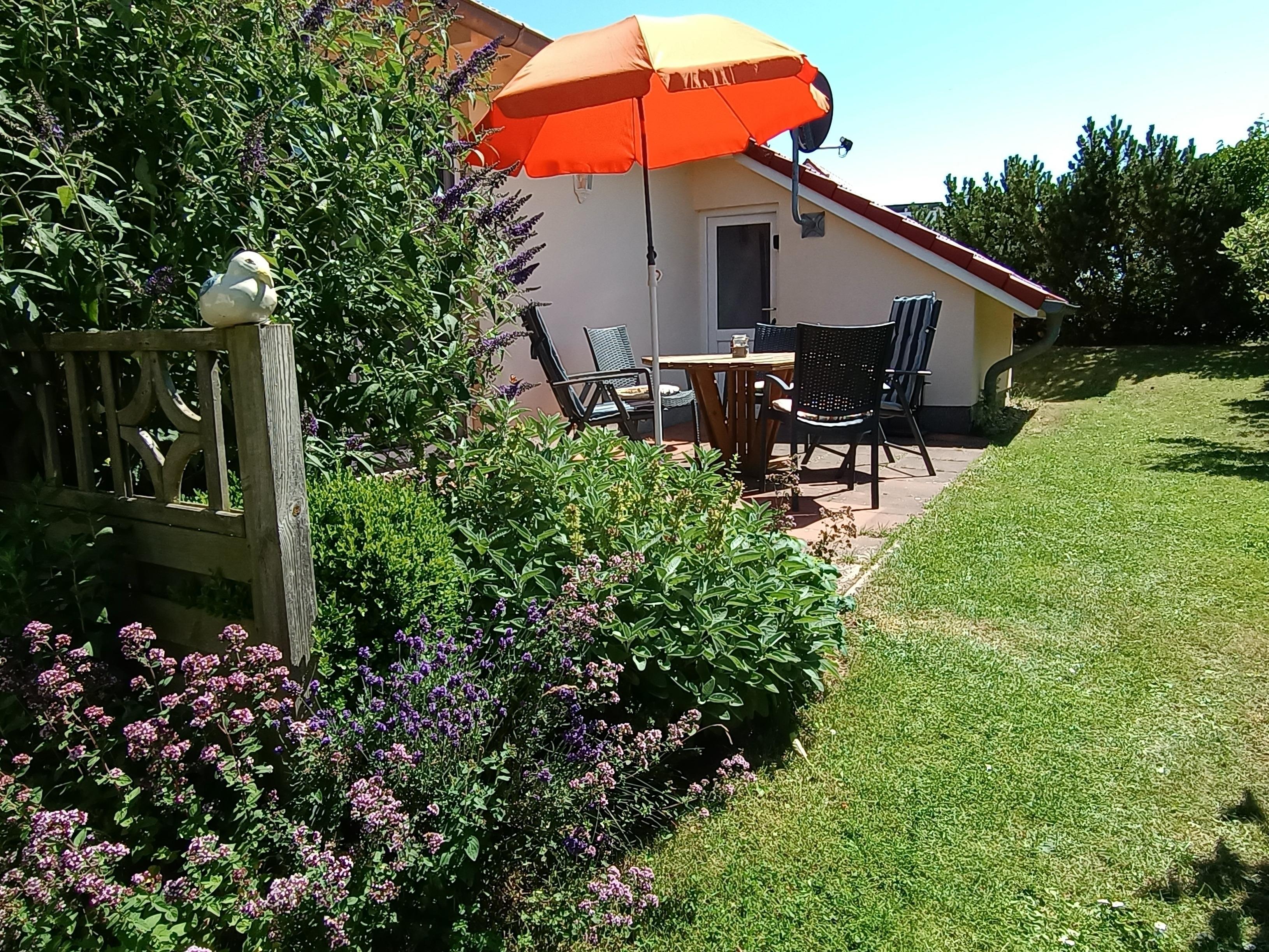 "Rieke" liegt auf einem mit blühenden Sträuchern, Blumeninseln und bunt blühendem Terrassenbeet liebevoll angelegten Grundstück. Es ist nicht eingezäunt. Rasen, Bolzplatz, Kinderrutsche und Sandkiste lassen Kindern viel Platz zum Spielen. Ein hauseigener Grillplatz mit Gartenpavillon rundet das Grundstück ab.