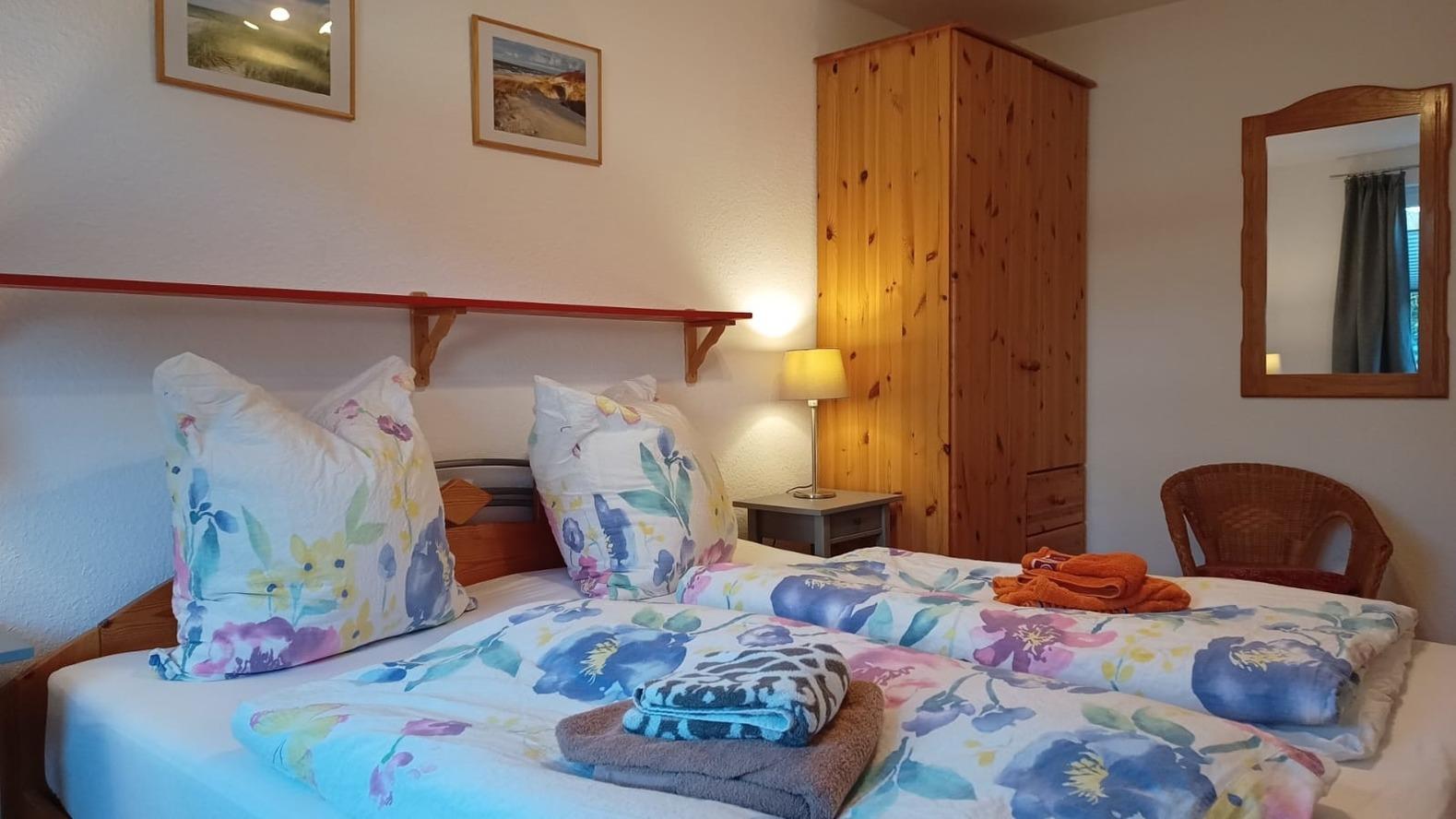 An das Ferienhaus grenzt in Süd-West-Lage die Terrasse an, die durch einen Anbau für Gartenmöbel und Fahrräder sichtgeschützt ist. "Rieke" hat ebenerdig zwei Schlafzimmer, das eine mit bequemen Doppelbett (180x200 m), das zweite mit zwei Einzelbetten (je 90x200m). Der dritte Schlafraum ist ein Schlafboden (über eine Raumspartreppe erreichbar) mit ebenfalls zwei Einzelbetten und einem Spielbereich mit Legosteinen für Kinder.