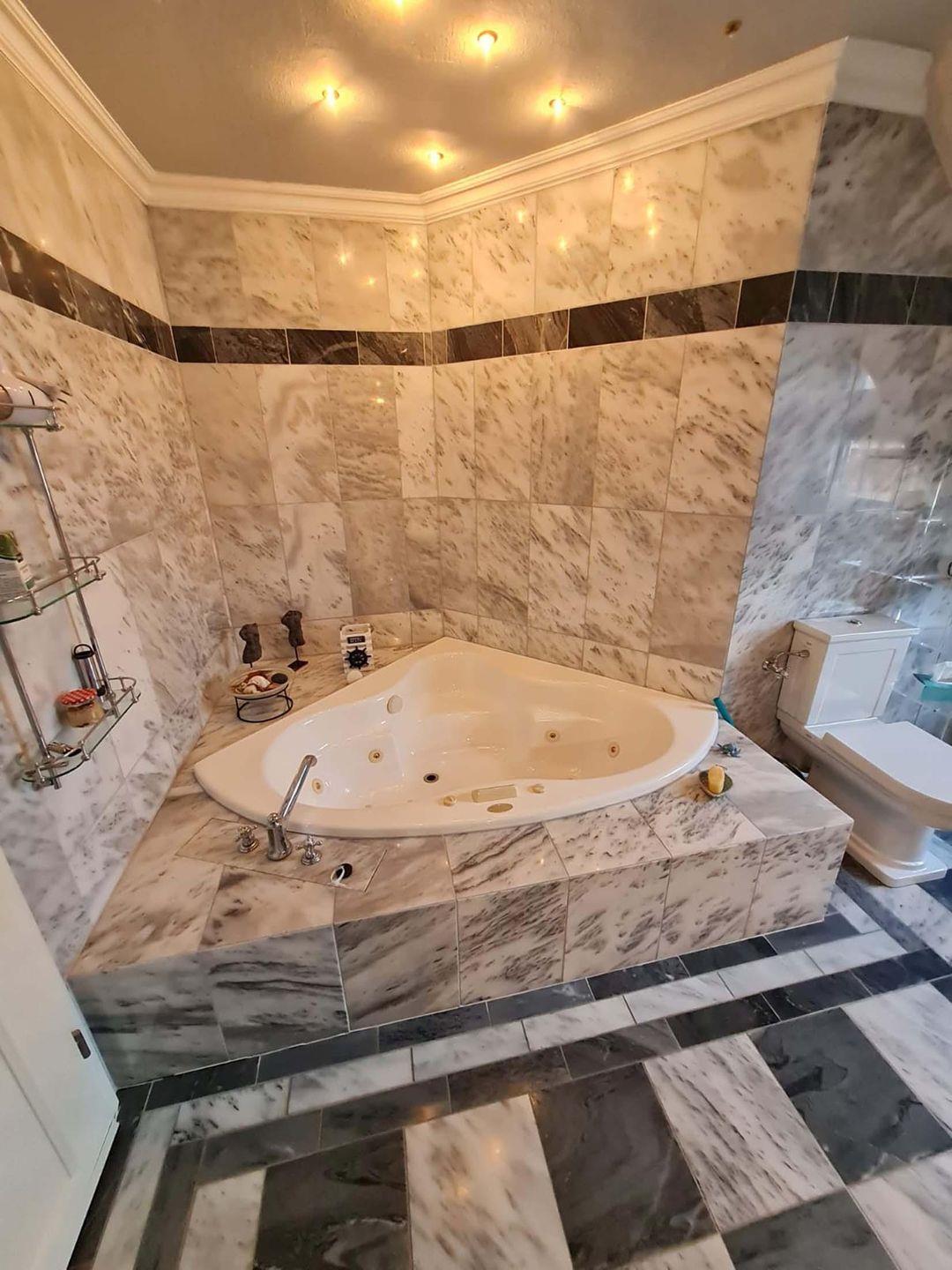die imposante Wirkung von dem Eckwhirlpool, zwei Säulen-Waschtische,
