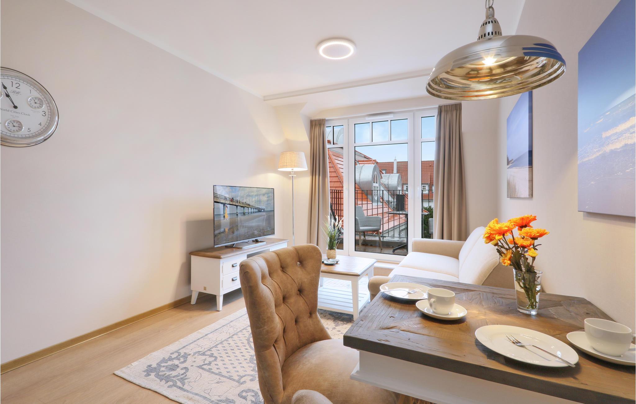 Ihr Wohlfühl-Apartment ist mit einem Doppelbett und Sauna ausgestattet und überzeugt durch elegante Einrichtung im modernen Landhausstil, gemütliche Naturmaterialien und maritime Details.