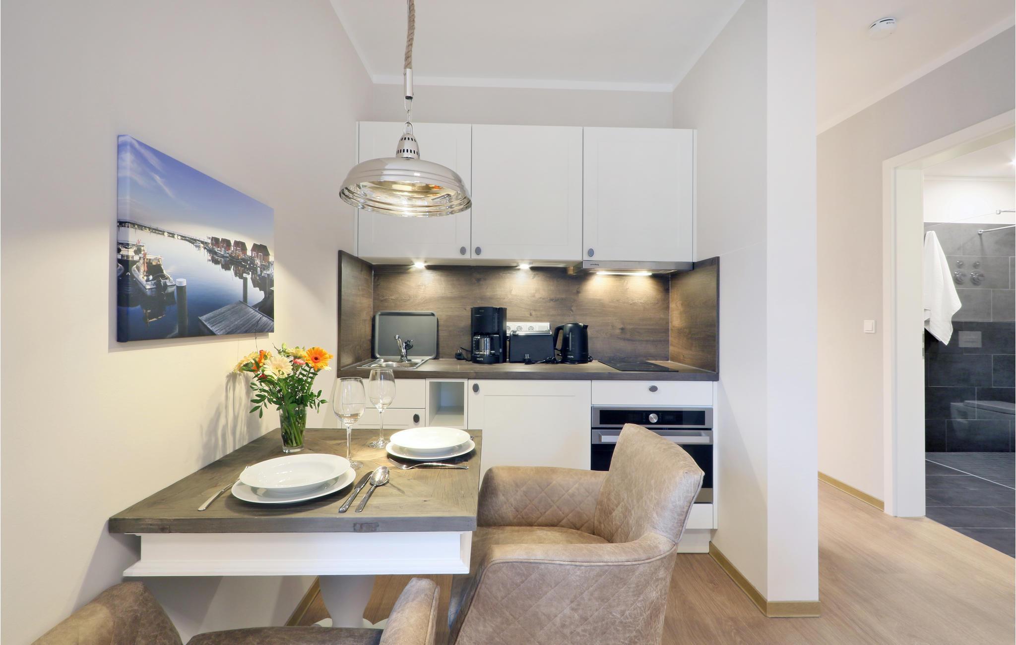 Ihr Wohlfühl-Apartment ist mit einem Doppelbett ausgestattet und überzeugt durch elegante Einrichtung im modernen Landhausstil, gemütliche Naturmaterialien und maritime Details.