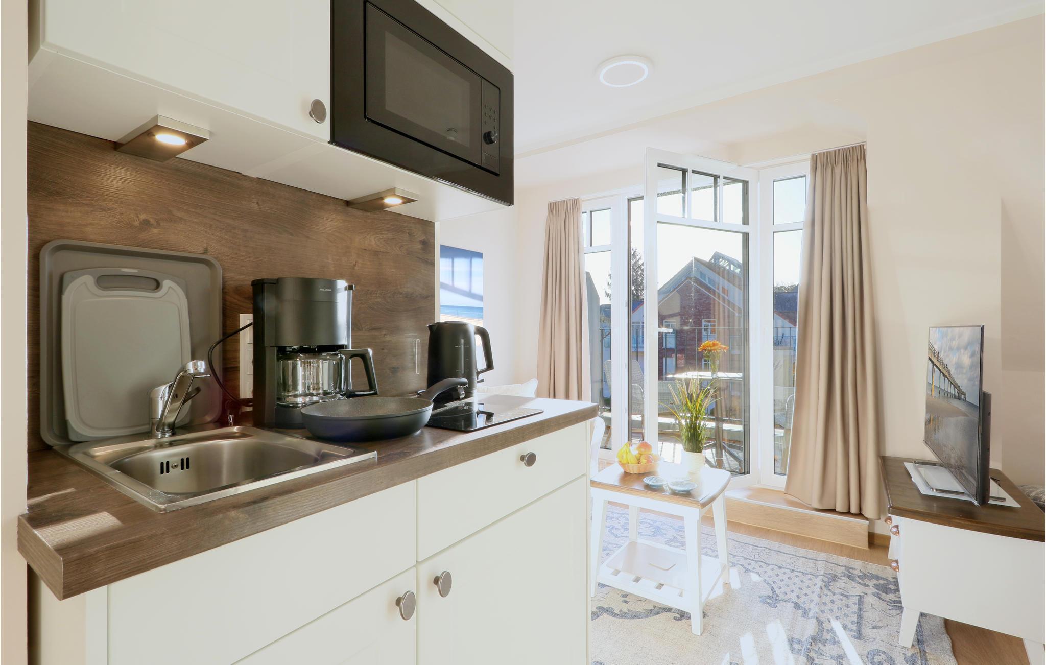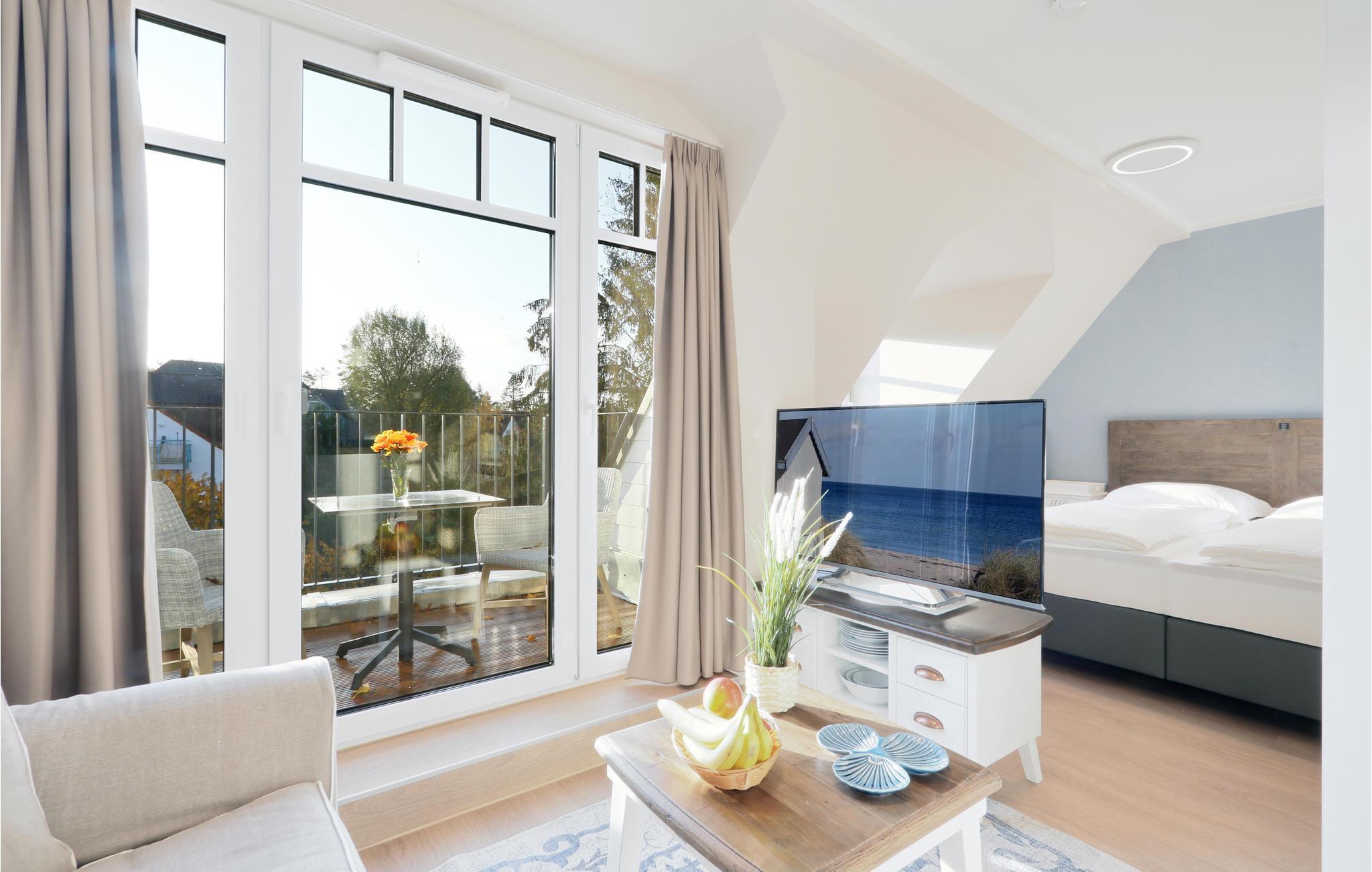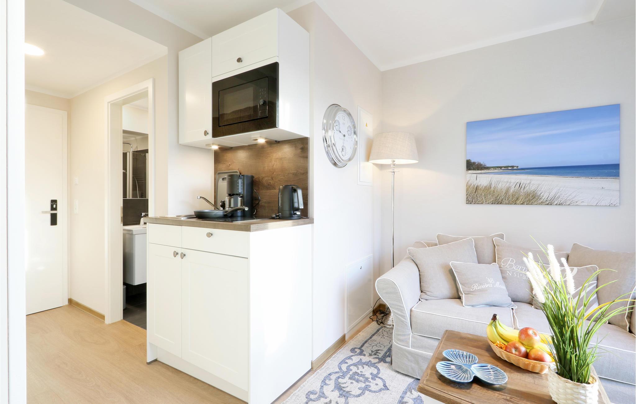 Ihr Wohlfühl-Apartment überzeugt durch elegante Einrichtung im modernen Landhausstil, gemütliche Naturmaterialien und maritime Details. Das bequeme Doppebett befindet sich im kombinierten Wohnbereich mit Küche. Mahlzeiten können nur auf dem Sofa oder dem Balkon eingenommen werden, da kein Esstisch vorhanden ist.