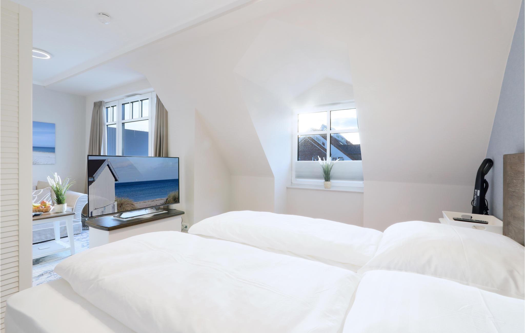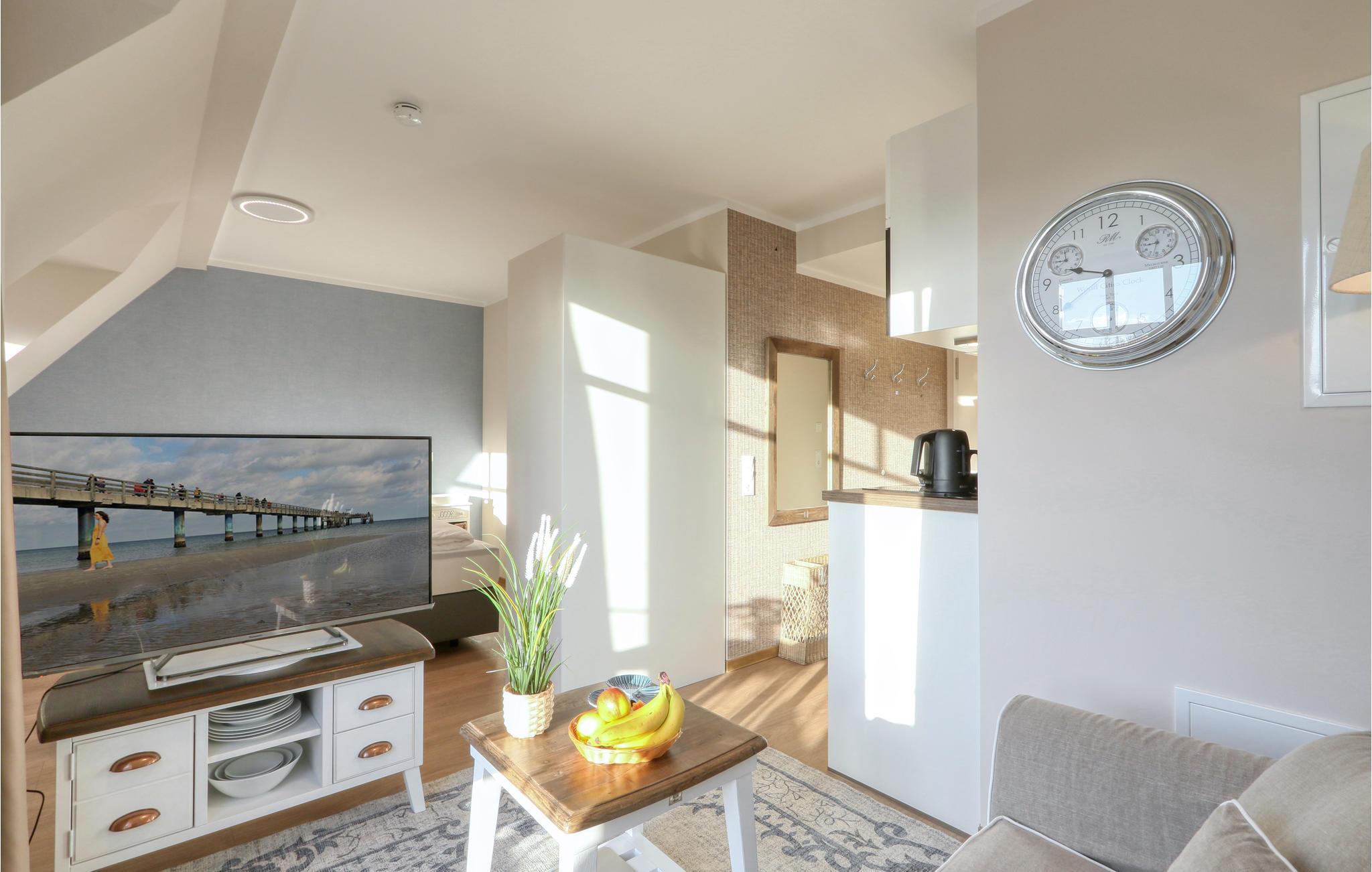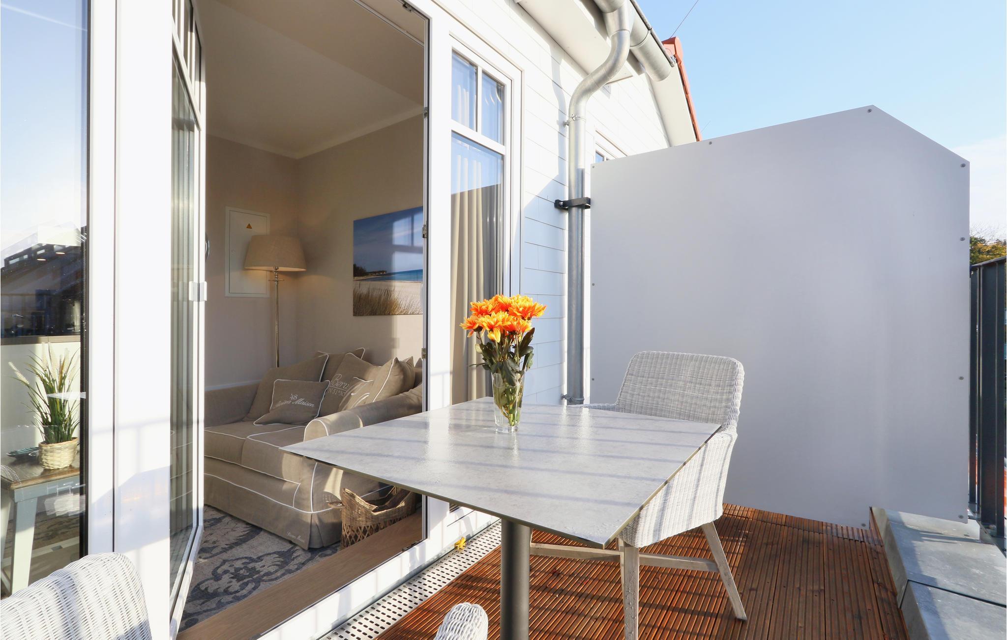 Ihr Wohlfühl-Apartment überzeugt durch elegante Einrichtung im modernen Landhausstil, gemütliche Naturmaterialien und maritime Details. Das bequeme Doppebett befindet sich im kombinierten Wohnbereich mit Küche. Mahlzeiten können nur auf dem Sofa oder dem Balkon eingenommen werden, da kein Esstisch vorhanden ist.
