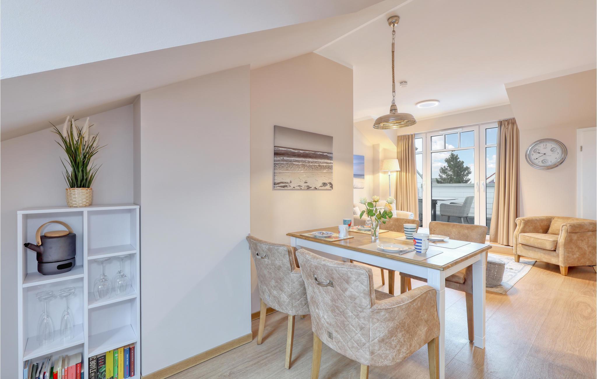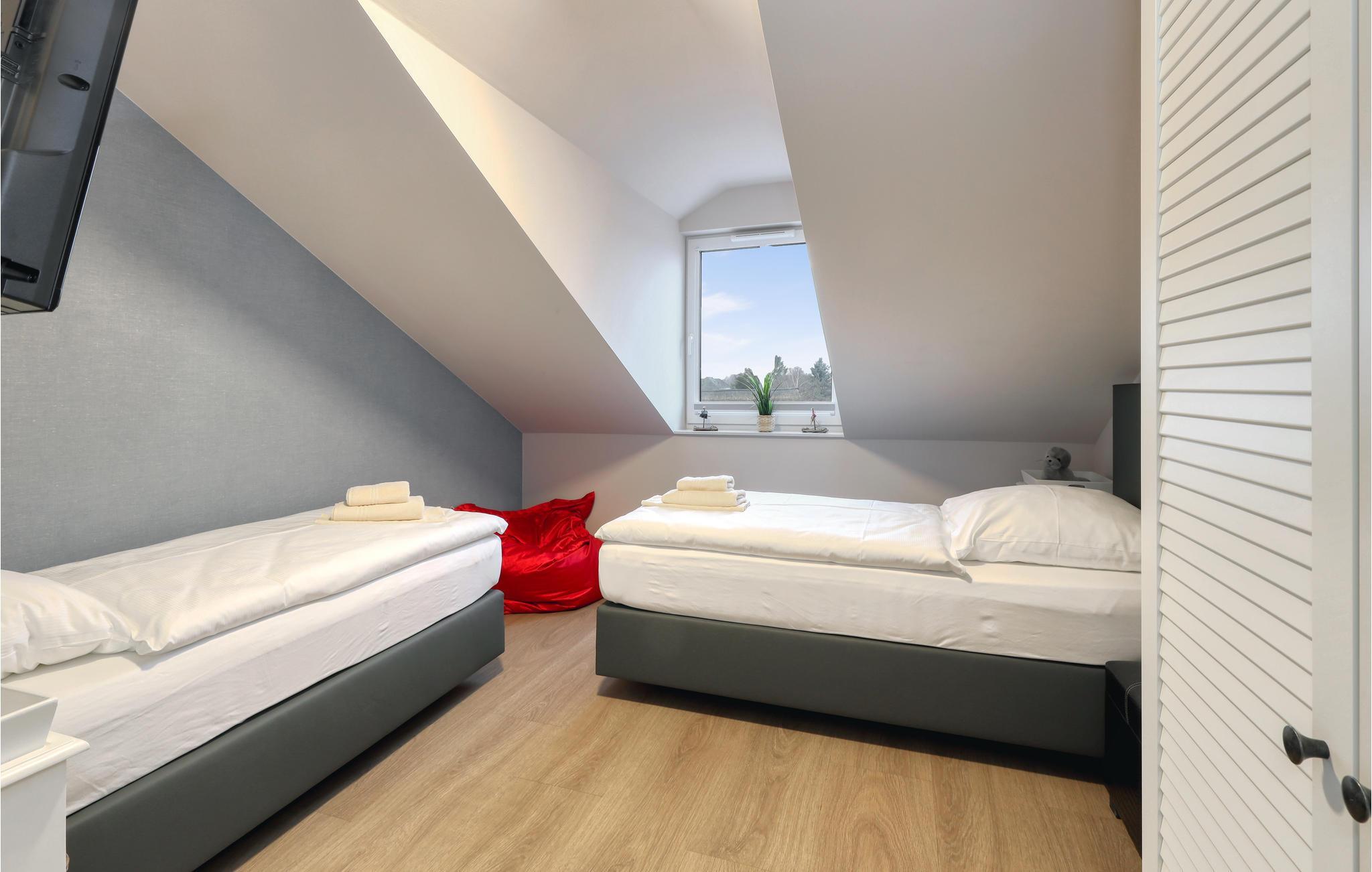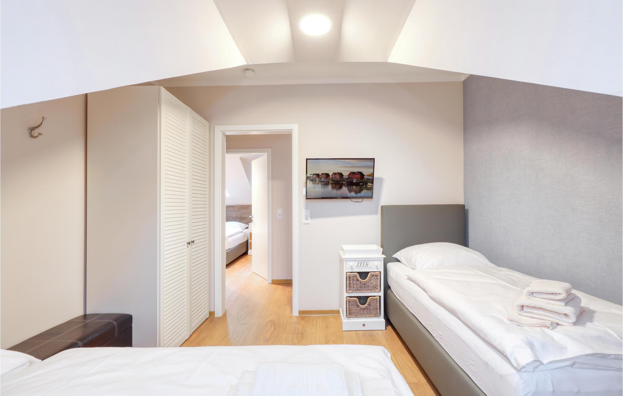 Ihr Wohlfühl-Apartment ist mit einem Doppelbett und zwei Einzelbetten sowie 2 Bädern (Badewanne/WC und Dusche/WC) ausgestattet. Es überzeugt durch elegante Einrichtung im modernen Landhausstil, gemütliche Naturmaterialien und maritime Details.