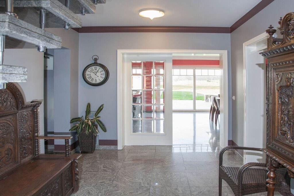 Parterre: (Wohnzimmer(TV, DVD-Spieler, Radio, CD-Spieler, Spielzeug), Küche(Herd, Kochplatte, Wasserkocher, Toaster, Kaffeemaschine, Backofen, Mikrowelle, Spülmaschine, Kühlschrank, Tiefkühlschrank, , ), Schlafzimmer(Doppelbett, TV), Schlafzimmer(Doppelbett, TV, Fliegenfenster), Badezimmer(Dusche)) In der 1. Etage: (Schlafzimmer(, , , , Doppelbett, TV, Fliegenfenster), Badezimmer(Toilette, Badewanne, Dusche)) , , , , drying room(, Trockner, Waschmaschine), Garage, Internet, Internet, Erste-Hilfe-Station, Trockner, Waschmaschine, Balkon(Gartenmöbel), Heizung, Terrasse(Grill, Gartenmöbel), Garten(Liegen, Pool, Sandkasten), Bügelbrett, Bügeleisen, Trockenschrank, Ladestation für Elektroautos, Wäschepaket gegen Gebühr