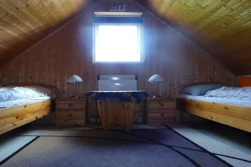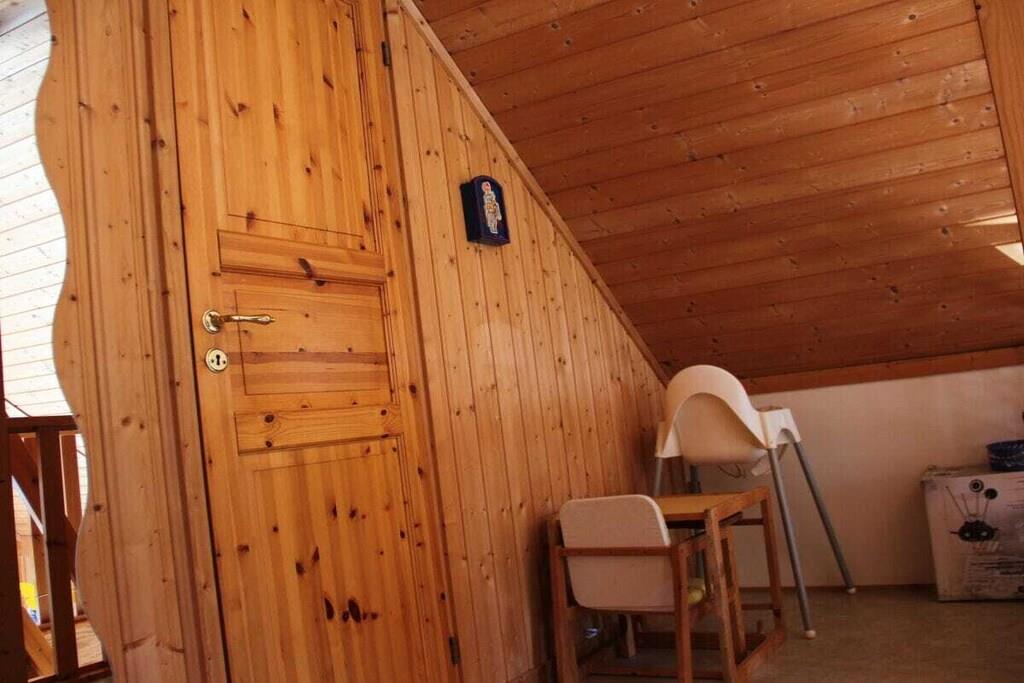 Parterre: (Wohnzimmer(, , , , , Bibliothek, Schlafcouch 1 Pers., TV, Kaminofen, DVD-Spieler, CD-Spieler, Stereoanlage, Rutsche, Hochstuhl, Fliegenfenster), Küche(, , Kochnische, Esstisch, Herd, Kochplatte, Wasserkocher, Toaster, Kaffeemaschine, Backofen, Grill, Mikrowelle, Spülmaschine, Kühlschrank, Tiefkühlschrank, ), Schlafzimmer(, , Doppelbett, Radio), Schlafzimmer(, , Einzelbett, Einzelbett, Radio), Schlafzimmer(, , Einzelbett, Einzelbett), Badezimmer(, Dusche, Waschbecken, Toilette)) Dachgeschoss: (Galerieschlafzimmer(, Radio, Babybett, Babybett, Hochstuhl, Spielzeug)) , , , Erste-Hilfe-Station, Terrasse(, Liegewiese, Grill, Gartenmöbel, Liegen), Garten(Zentraler Grill, Liegewiese, Gartenmöbel, Liegen), Parkplatz, Bügelbrett, Bügeleisen, Trockenschrank
