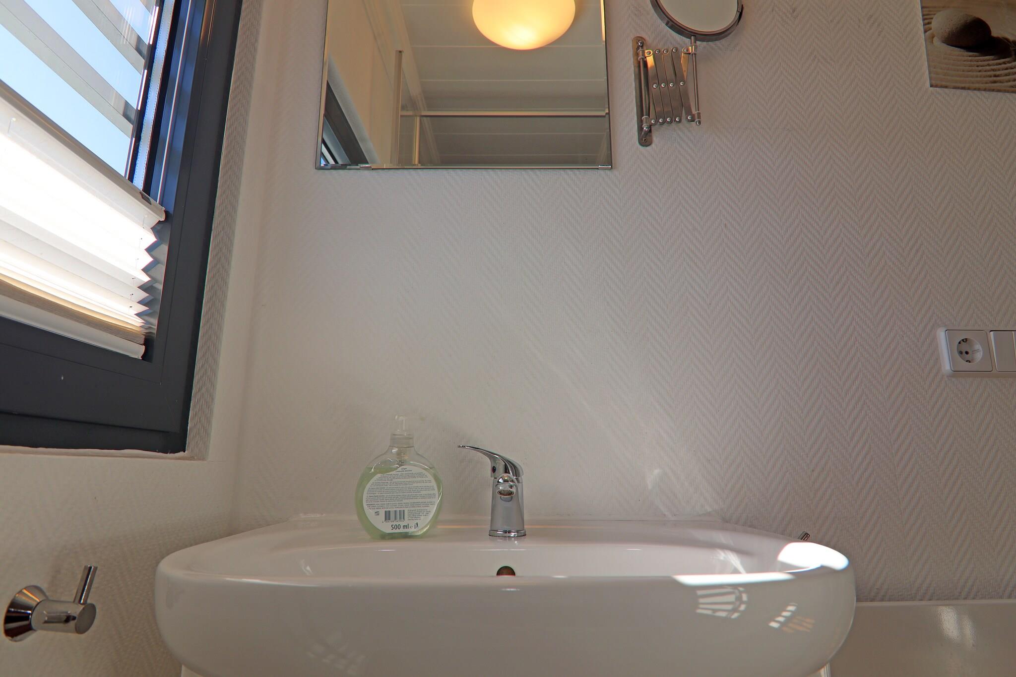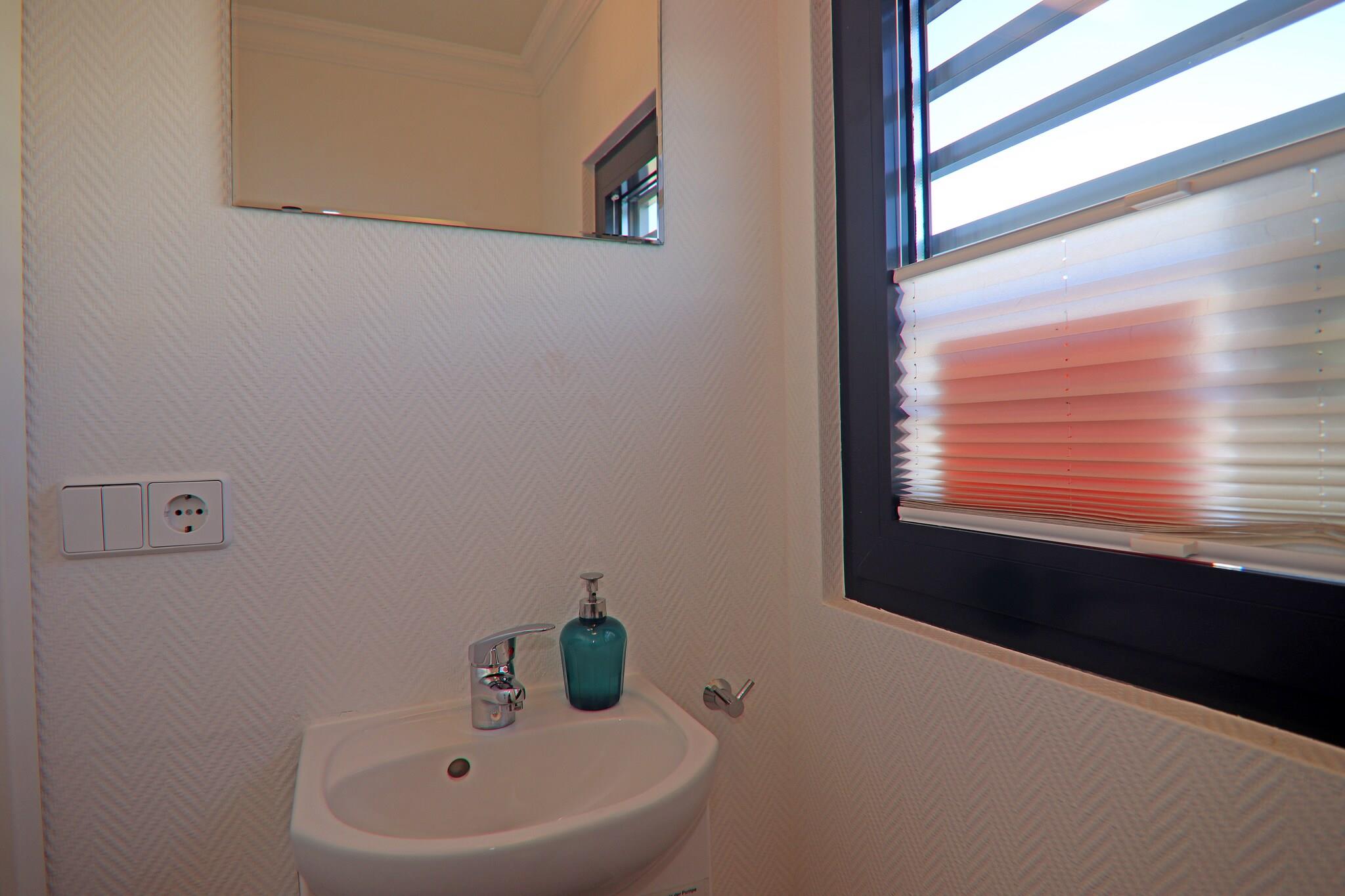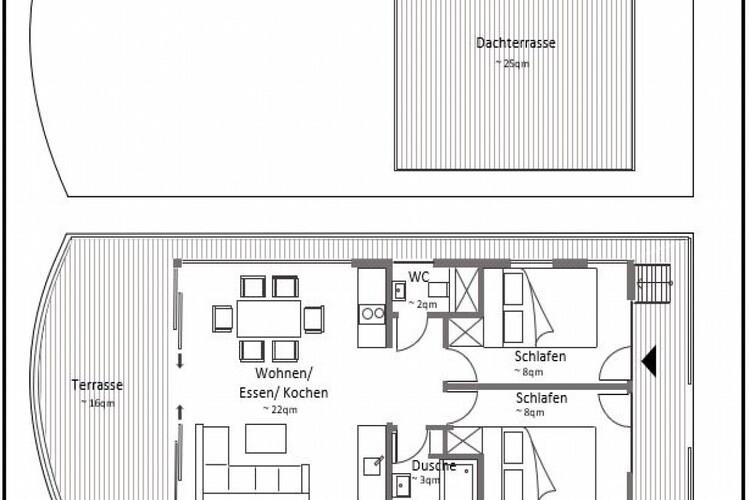 Parterre: (offene Küche(Kochplatte(2 Kochplatten, Ceranfeld), Wasserkocher, Toaster, Kaffeemaschine, Mikrowelle, Spülmaschine, Kühlschrank), Wohn/Esszimmer(TV(Flatscreen, Satellit), Esstisch, Sitzecke, Radio), Schlafzimmer(Doppelbett), Schlafzimmer(Doppelbett), Badezimmer(Dusche, Waschbecken), Toilette(Waschbecken, Toilette)) Brötchenservice, Herd, Heizung(durch Klimaanlagen), Terrasse(16 m2), Dachterasse, Gartenmöbel, Parkplatz, Liegestühle, Wäschepaket inklusive