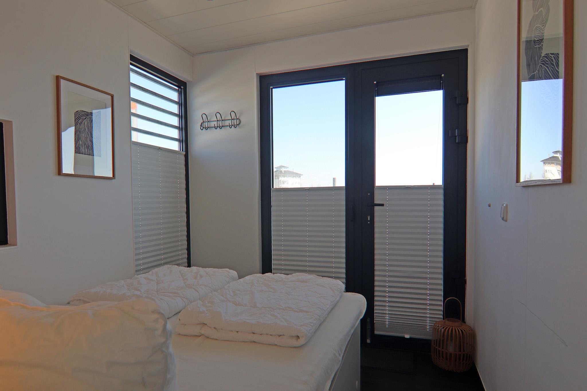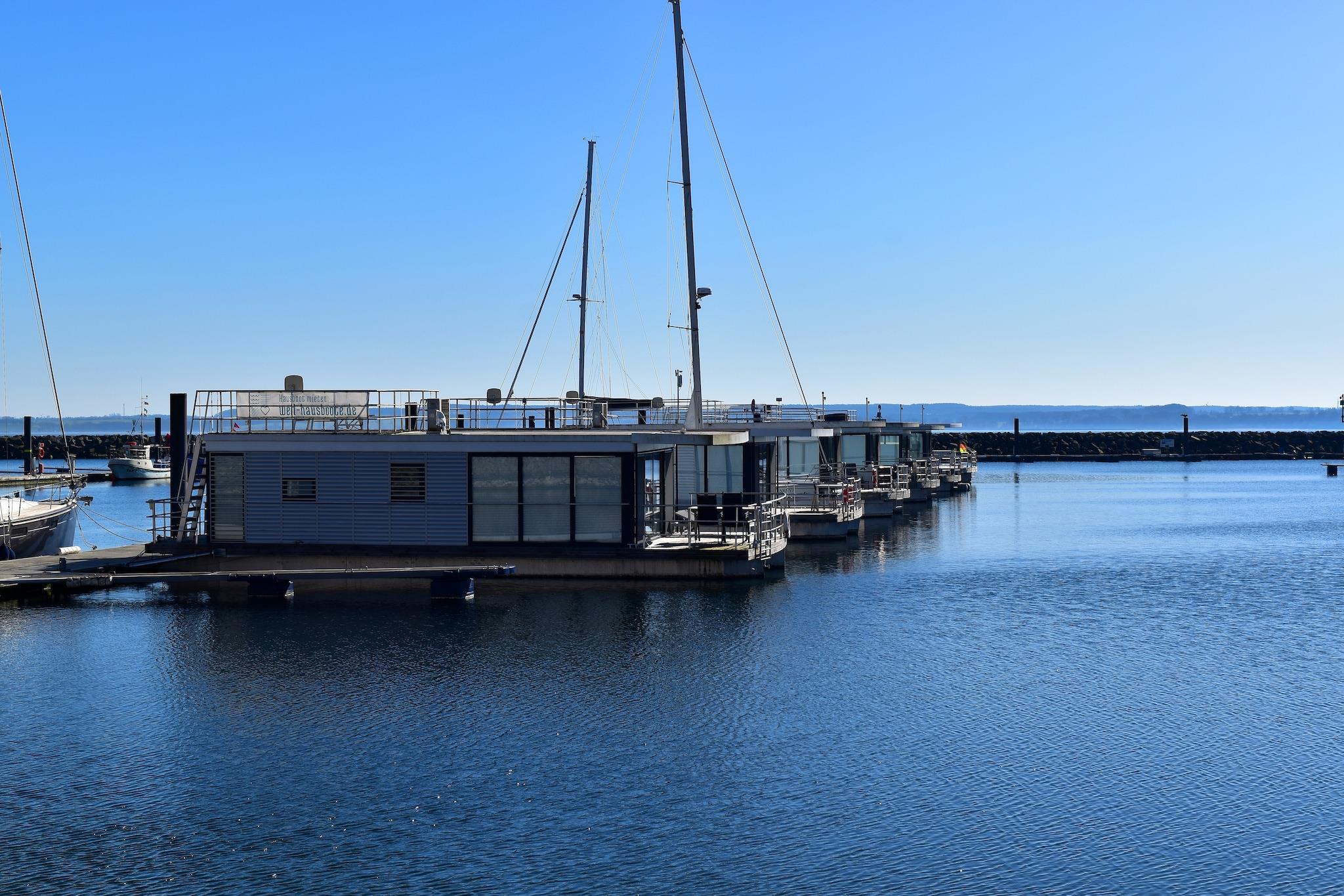 Entdecken Sie Ihr Ferienhaus auf einem komfortablen Hausboot in Boltenhagen mit direktem Meerblick und gemütlicher Dachterrasse.