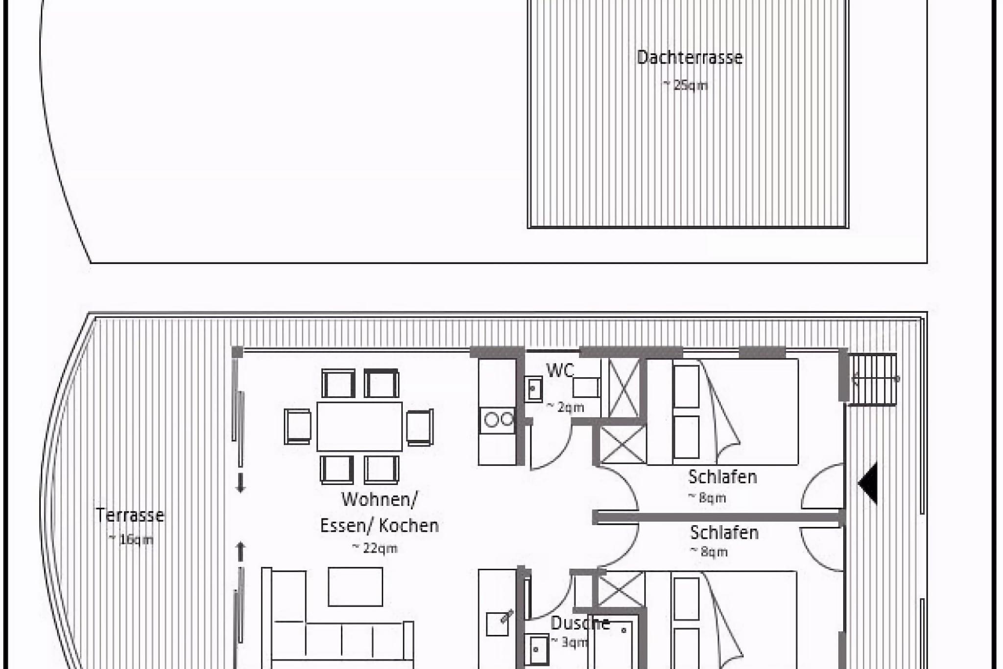 Parterre: (offene Küche(Kochplatte(2 Kochplatten, Ceranfeld), Wasserkocher, Toaster, Kaffeemaschine, Mikrowelle, Spülmaschine, Kühlschrank), Wohn/Esszimmer(TV(Flatscreen, Satellit), Esstisch, Sitzecke, Radio), Schlafzimmer(Doppelbett), Schlafzimmer(Doppelbett), Badezimmer(Dusche, Waschbecken), Toilette(Waschbecken, Toilette)) Brötchenservice, Heizung(durch Klimaanlagen), Terrasse(16 m2), Dachterasse, Gartenmöbel, Parkplatz, Liegestühle, Wäschepaket inklusive