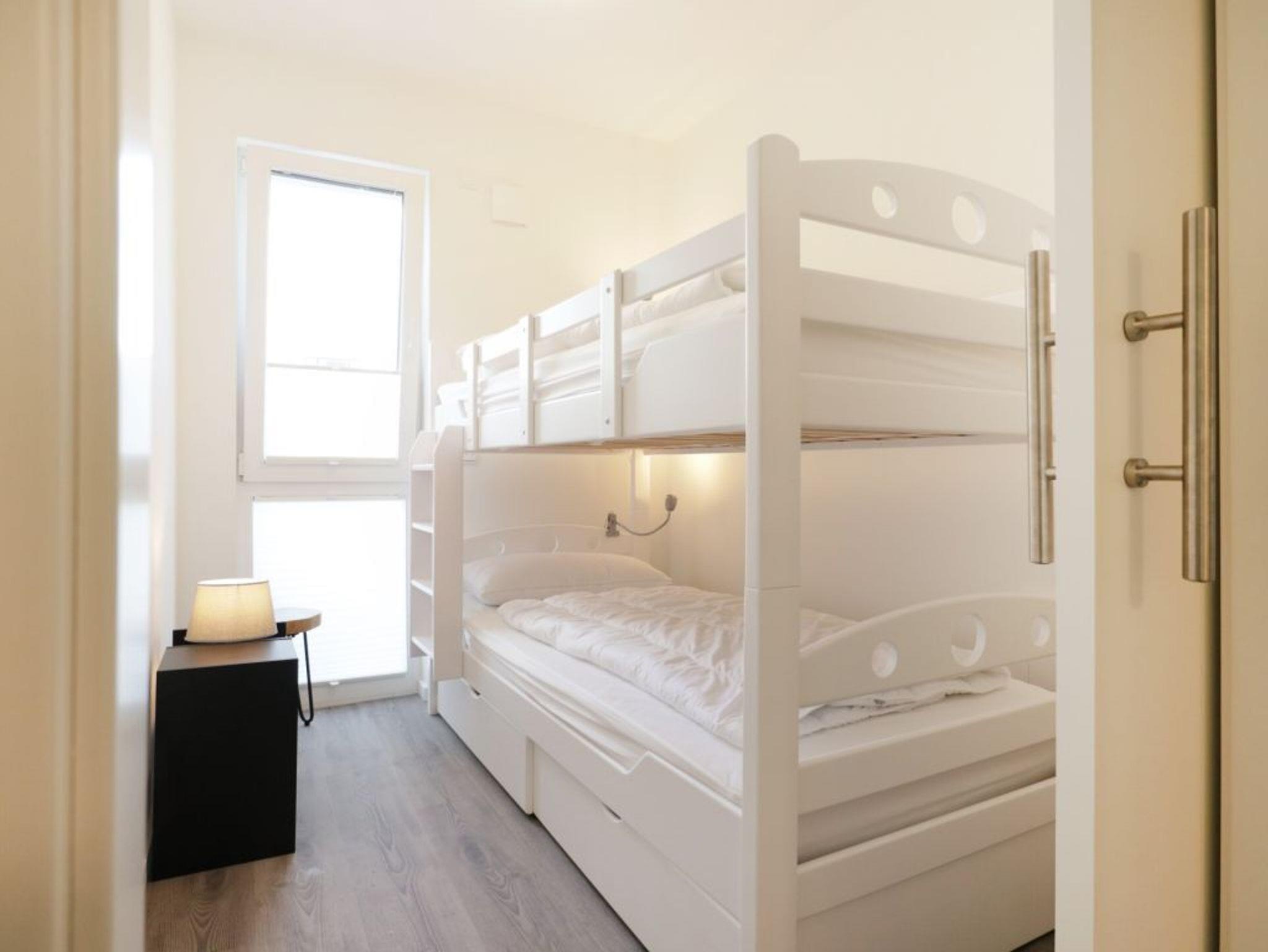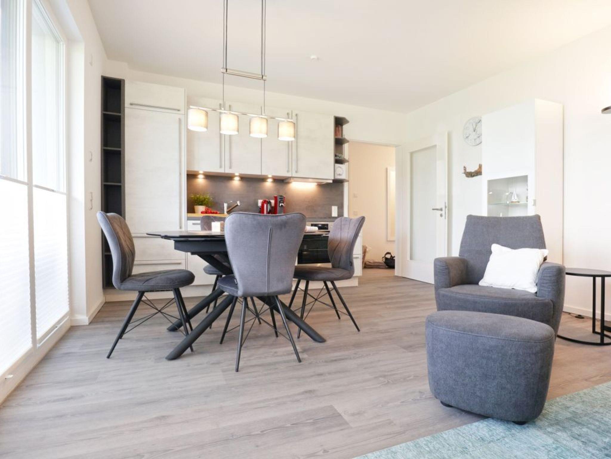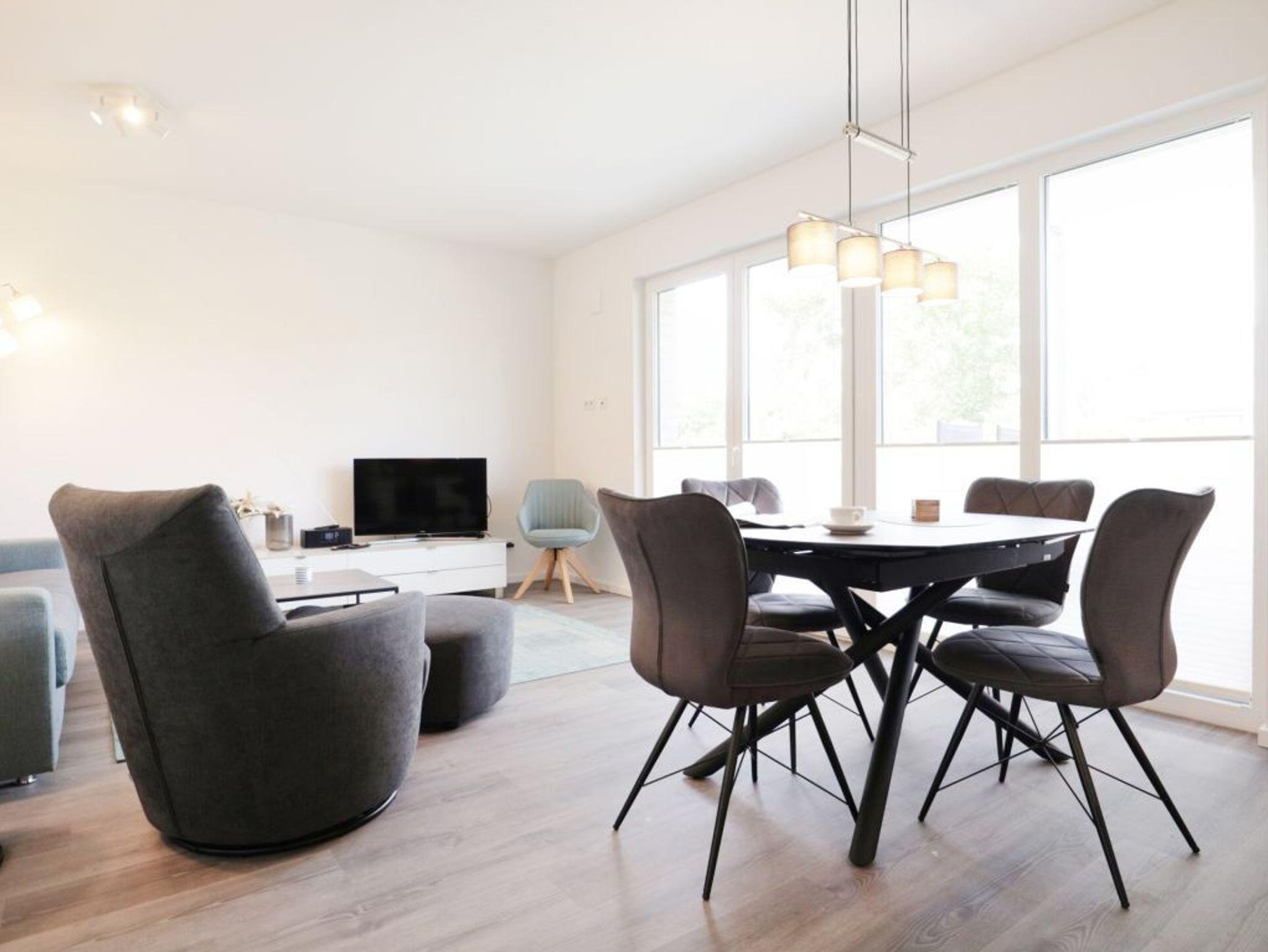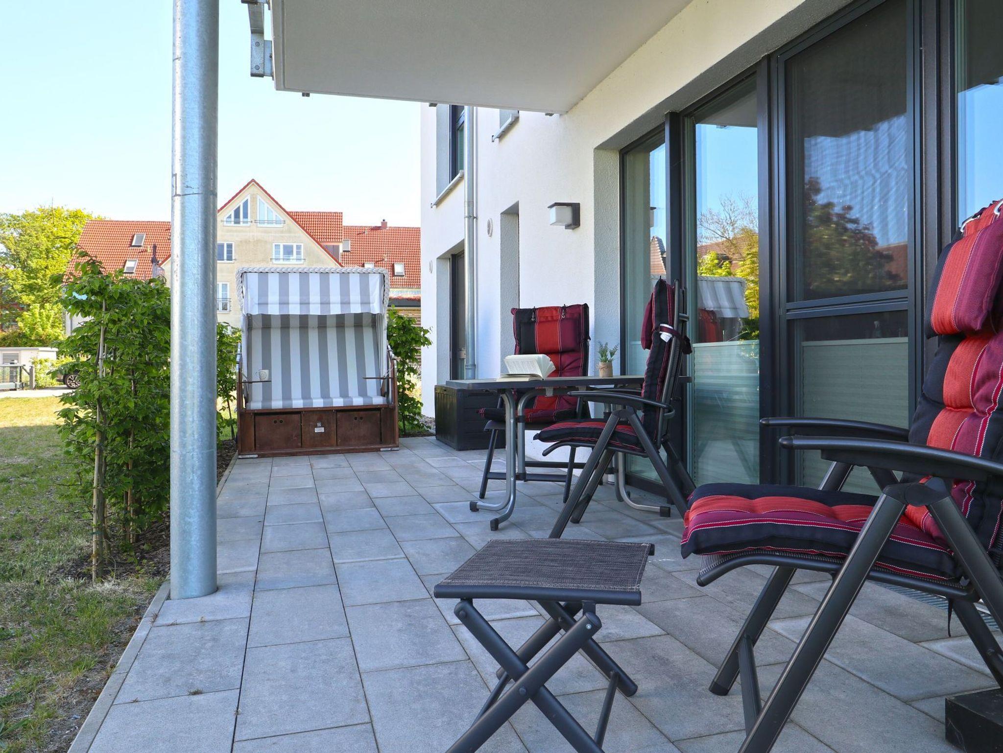 Die freundlich helle 3-Zimmer-Erdgeschosswohnung bietet auf großzügigen 68qm Wohnfläche den idealen Rahmen für erholsame Urlaubstage. Bis zu vier Personen finden hier komfortabel Platz. Ein besonderer Vorzug ist die teilweise überdachte Terrasse mit Strandkorb ? perfekt für entspannte Stunden im Freien. Der modern und stilvoll eingerichtete Wohn- und Essbereich heißt Sie mit einem bequemen Sofa, einem Relax Sessel mit Beinablage sowie einem Esstisch mit vier Stühlen willkommen. Für Unterhaltung sorgen ein Fernseher, eine Musikanlage und kostenfreies WLAN. Die hochwertige, offen integrierte Küchenzeile lässt keine Wünsche offen: Herd, Backofen, Dunstabzugshaube, Kühlschrank, Kaffeemaschine, Wasserkocher, Toaster und weitere praktische Küchenutensilien ermöglichen eine komfortable Selbstversorgung. Genießen Sie Ihre Mahlzeiten am Esstisch oder in den wärmeren Monaten auf der saisonal möblierten Terrasse, wo Sie es sich im Strandkorb gemütlich machen können. Zwei separate Schlafzimmer sorgen für erholsame Nächte. Das Hauptschlafzimmer ist mit einem komfortablen Boxspring-Doppelbett, einem Kleiderschrank und einem Schreibtisch ausgestattet. Im zweiten Schlafzimmer befindet sich ein hochwertiges Etagenbett (je 0,90 m x 2,00 m), das dank seiner komfortablen Maße auch für erwachsene Gäste geeignet ist. Der Urlaubstag beginnt in einem modernen, geräumigen Badezimmer mit ebenerdiger Dusche, Waschtisch mit Unterschrank, WC sowie einer praktischen Handtuchheizung. Ein reservierter Außenstellplatz steht für Ihren PKW zur Verfügung. Für mitgebrachte Fahrräder gibt es abschließbare Unterstellmöglichkeiten sowie Fahrrad E-Ladestationen. Haustiere und Rauchen sind in der Wohnung nicht erlaubt.