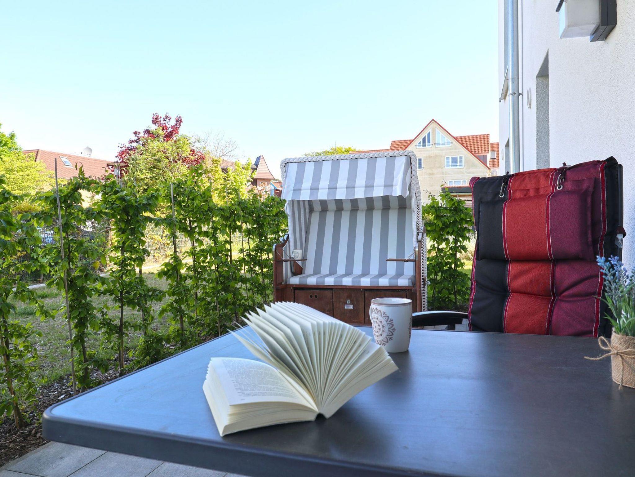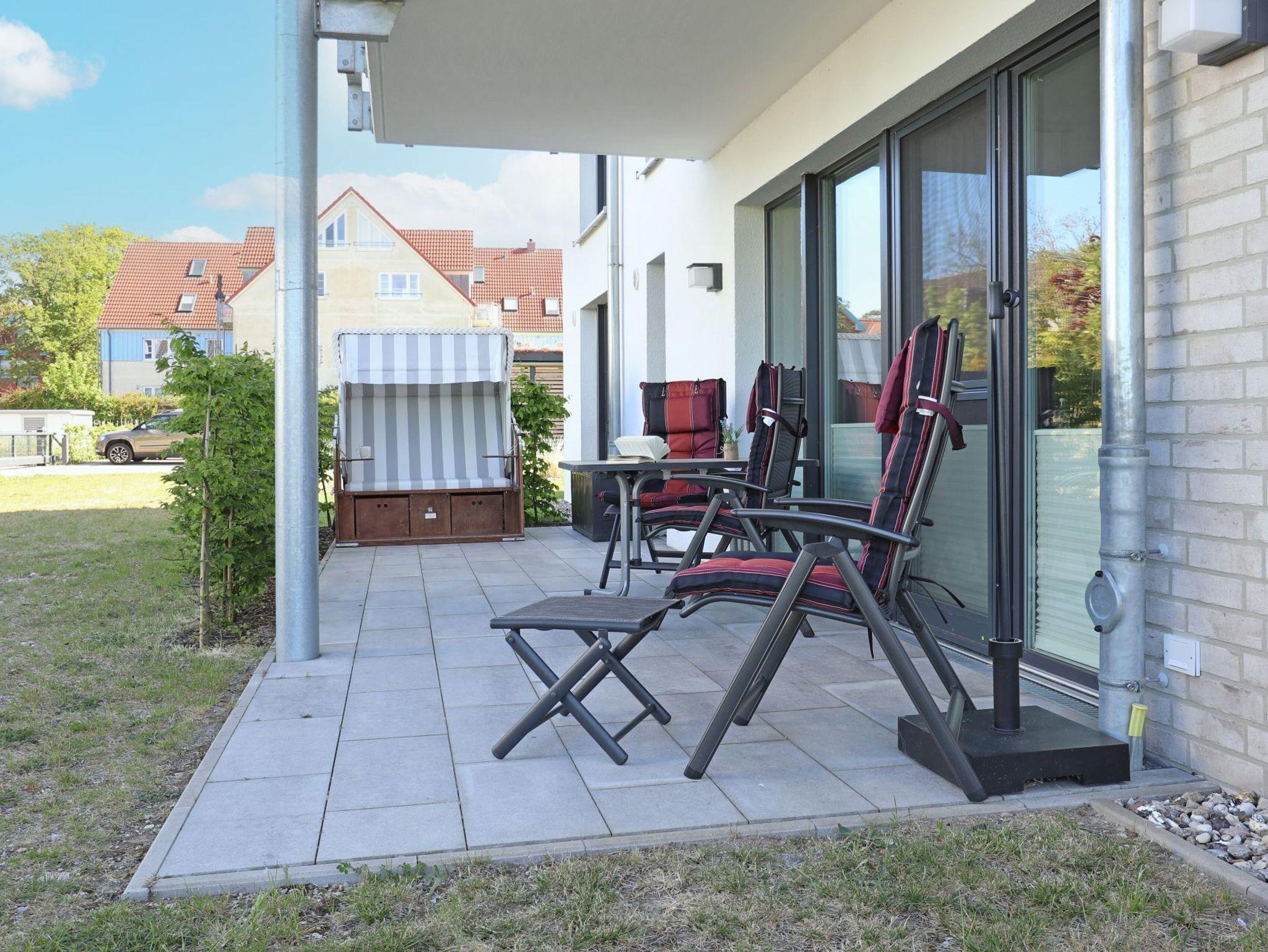 Moderne 3-Zimmer-Ferienwohnung in Boltenhagen, strandnah mit Terrasse und Strandkorb für entspannte Urlaubstage.