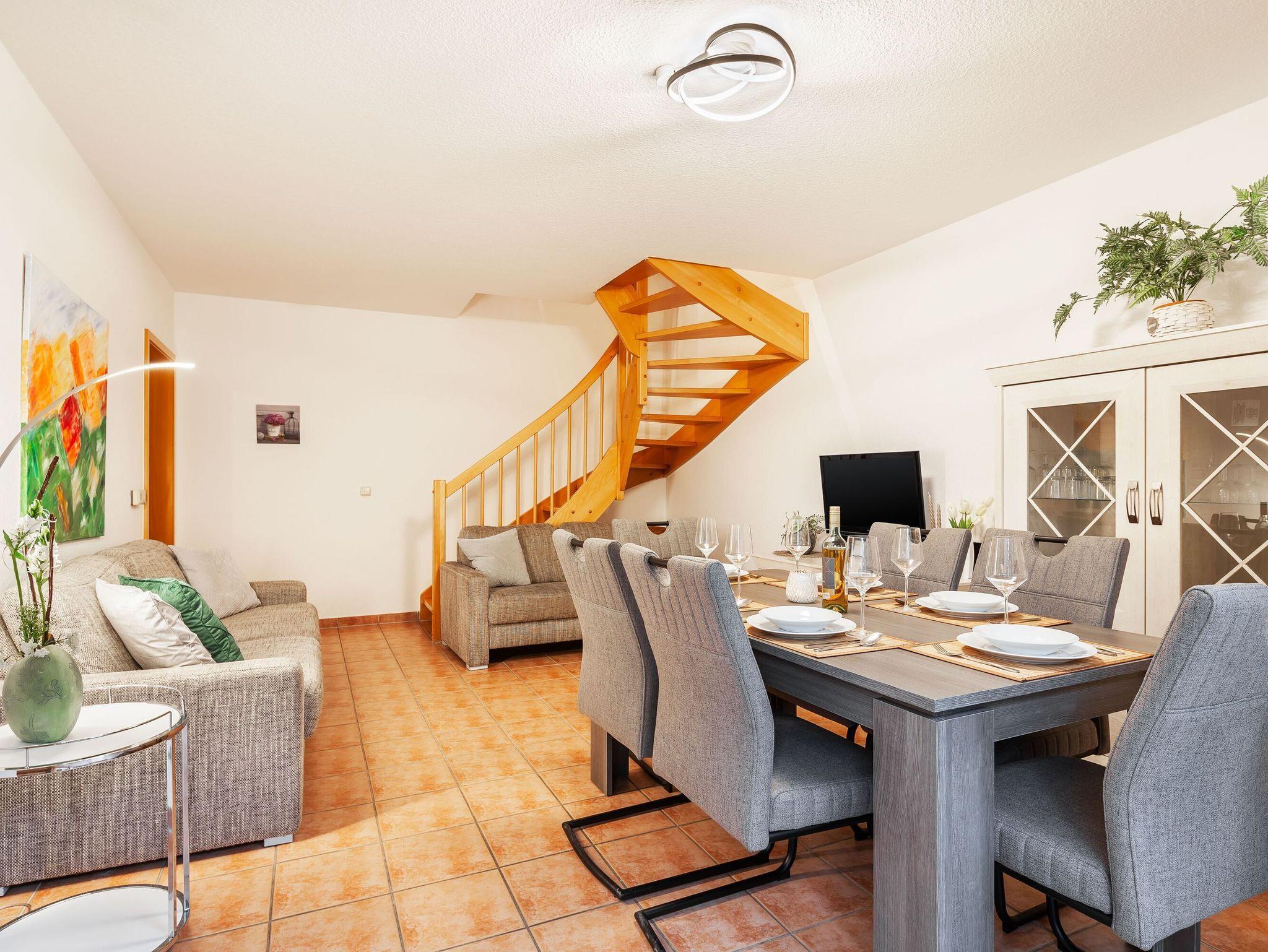 Das Wohn- und Esszimmer ist offen gestaltet und bietet durch bodentiefe Fenster viel Licht. Von hier aus gelangt man auf die sonnige Terrasse, die zum Entspannen und Genießen einlädt. Die Ausstattung des Ferienhauses umfasst unter anderem eine Waschmaschine, einen Kinderhochstuhl und ein Kinderbett.