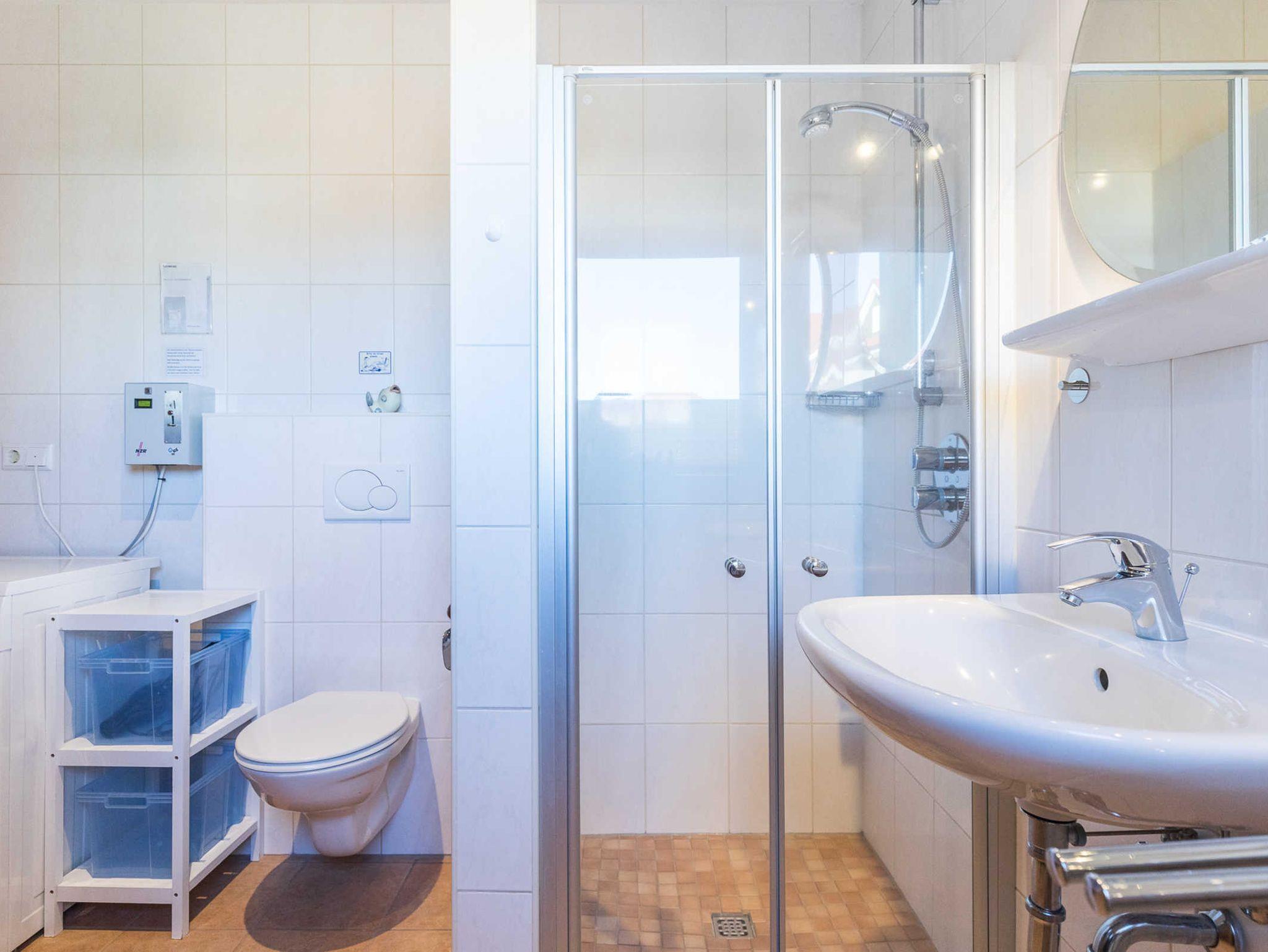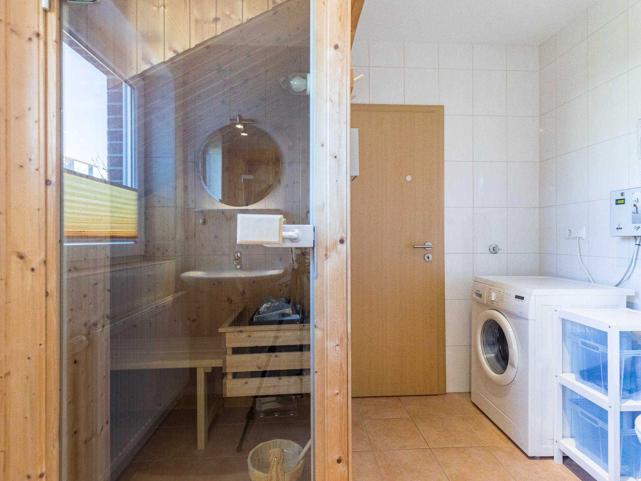 Das Bad mit Tageslicht ist mit einer ebenerdigen Dusche, WC und Münz-Waschmaschine ausgestattet. Ebenso finden Sie hier eine Sauna, welche Sie gern jederzeit gegen Gebühr nutzen können.