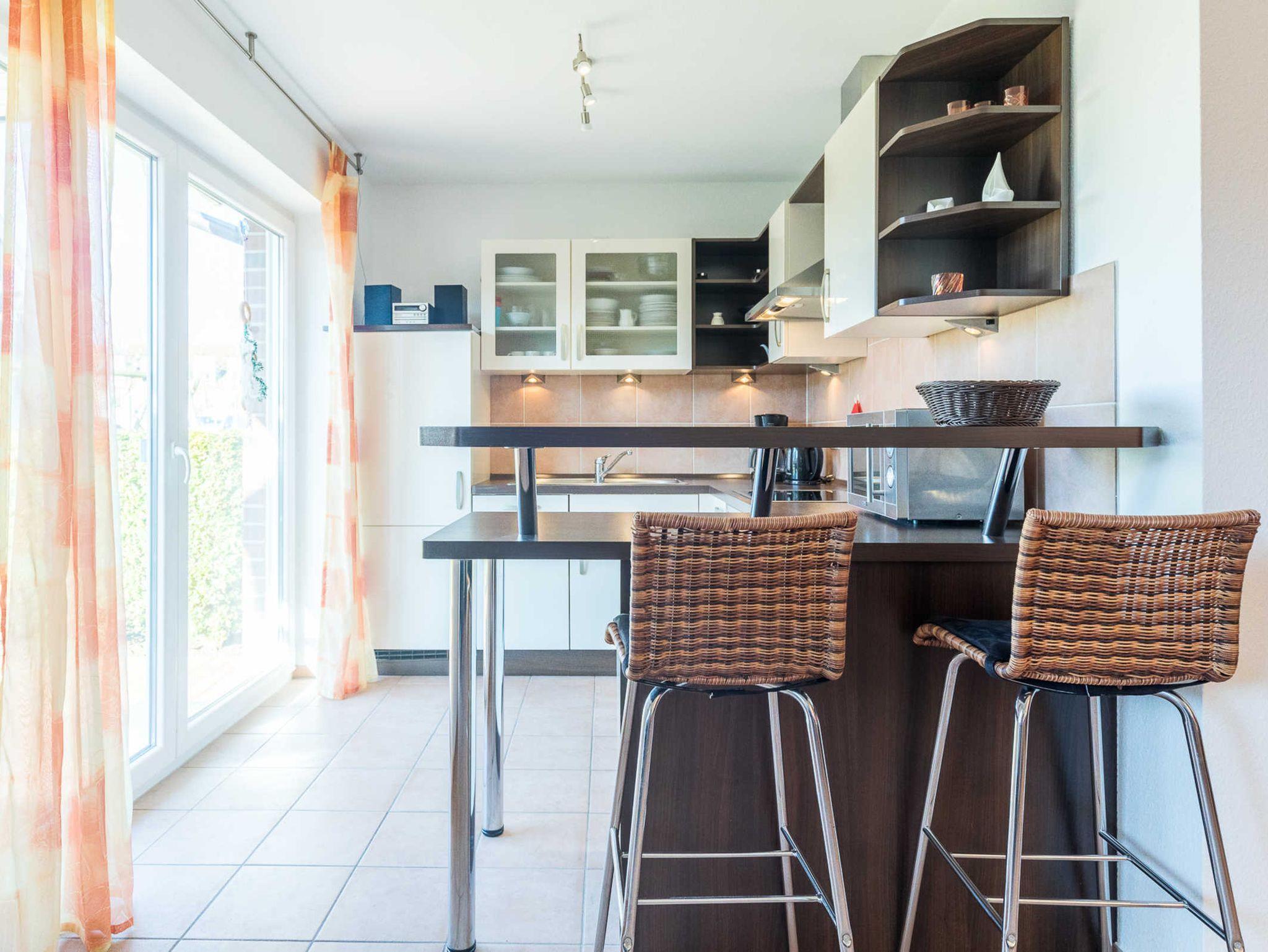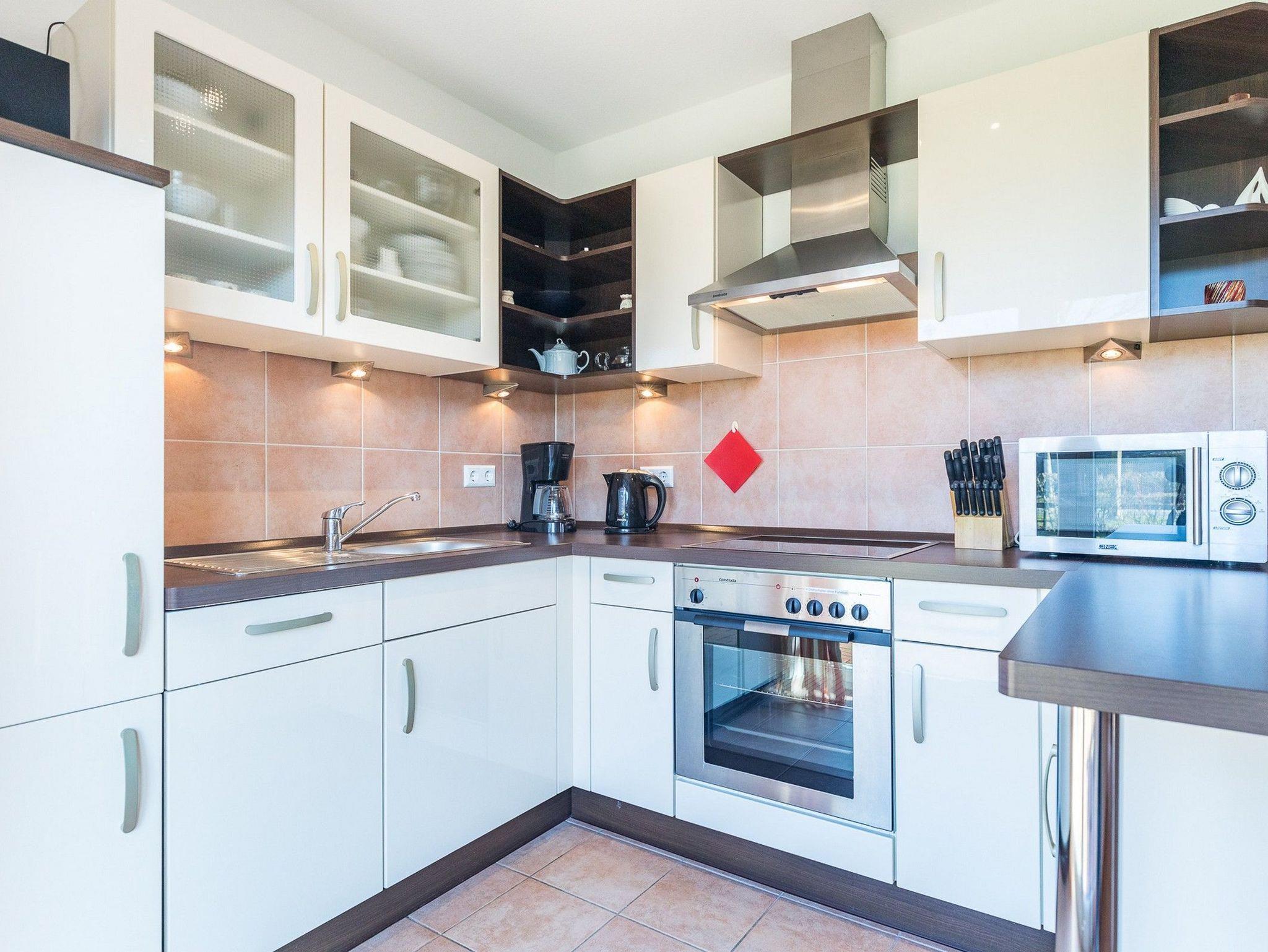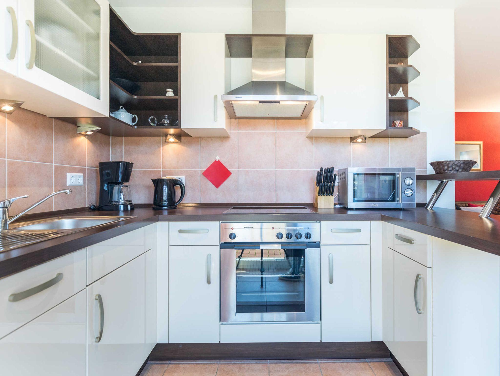 Die offene Küche beinhaltet neben einem Geschirrspüler und einer Mikrowelle viele weitere nützliche Geräte. Nehmen Sie Ihre Mahlzeiten bequem an der Essecke ein.