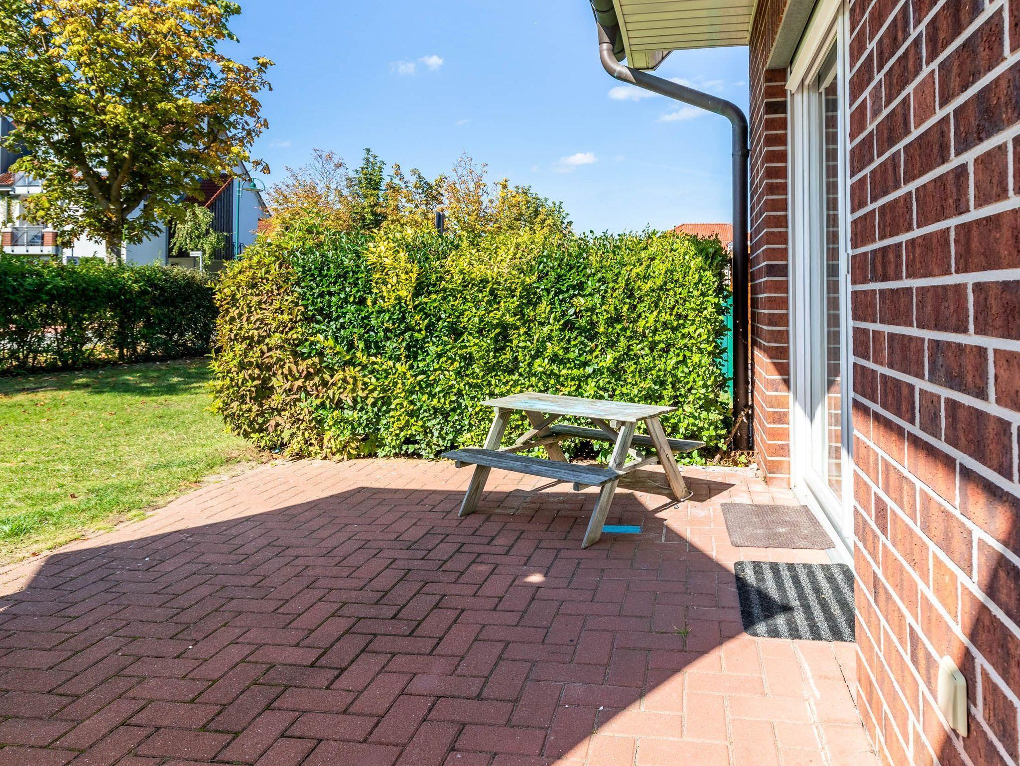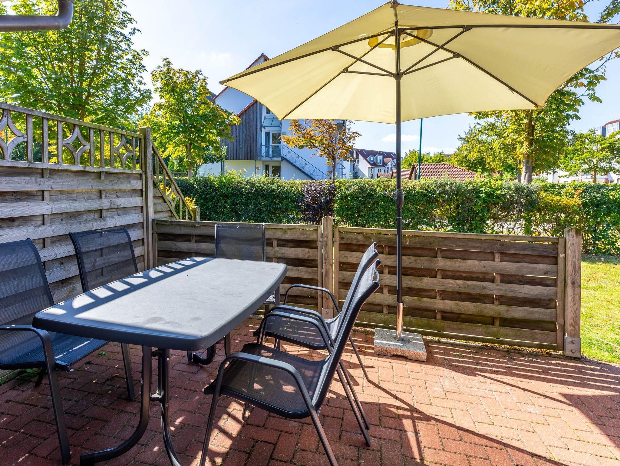 Die möblierte Südwest-Terrasse können Sie vom Wohnbereich aus erreichen. Eine kleine Hecke umrahmt den Gemeinschafts-Garten. Zusätzlich ist die möblierte Terrasse teilweise mit einem Sichtschutz zum Grundstück sowie einer Trennwand zur Nachbar-Terrasse aus Holz ausgestattet.