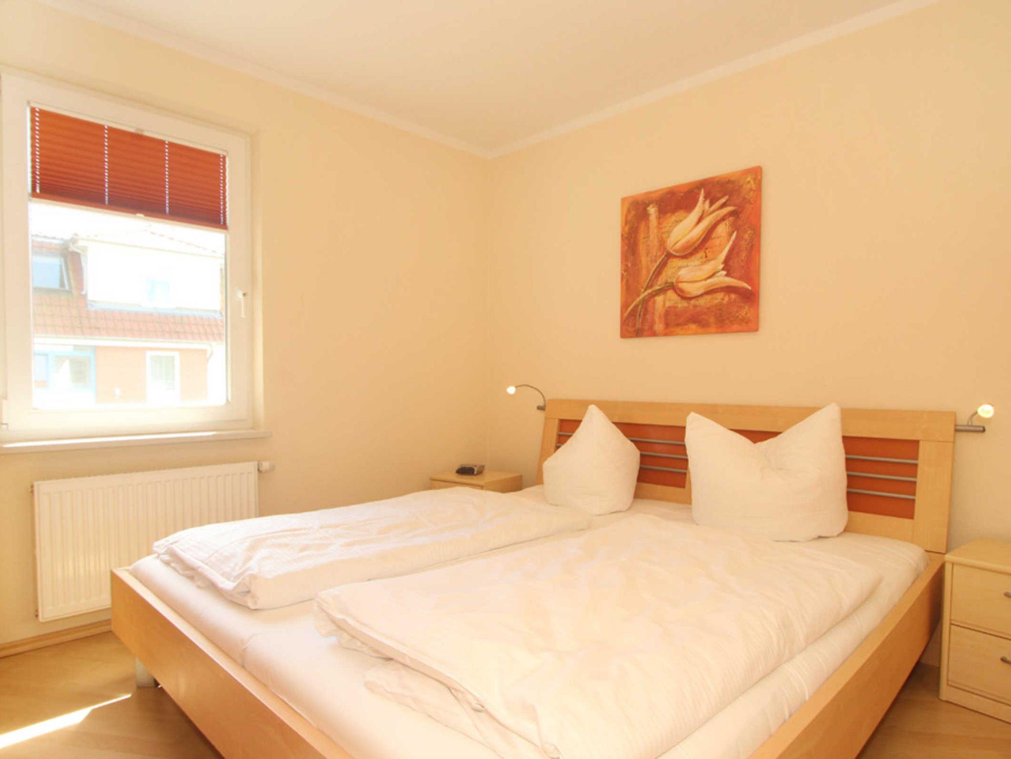 Das Schlafzimmer bietet ein bequemes Doppelbett (180x200cm/ Höhe 44,5cm) mit elektrisch verstellbaren Lattenrosten und einen geräumigen Kleiderschrank. Am Fenster befindet sich ein Verdunklungs-Plissee sowie Fliegenschutz.