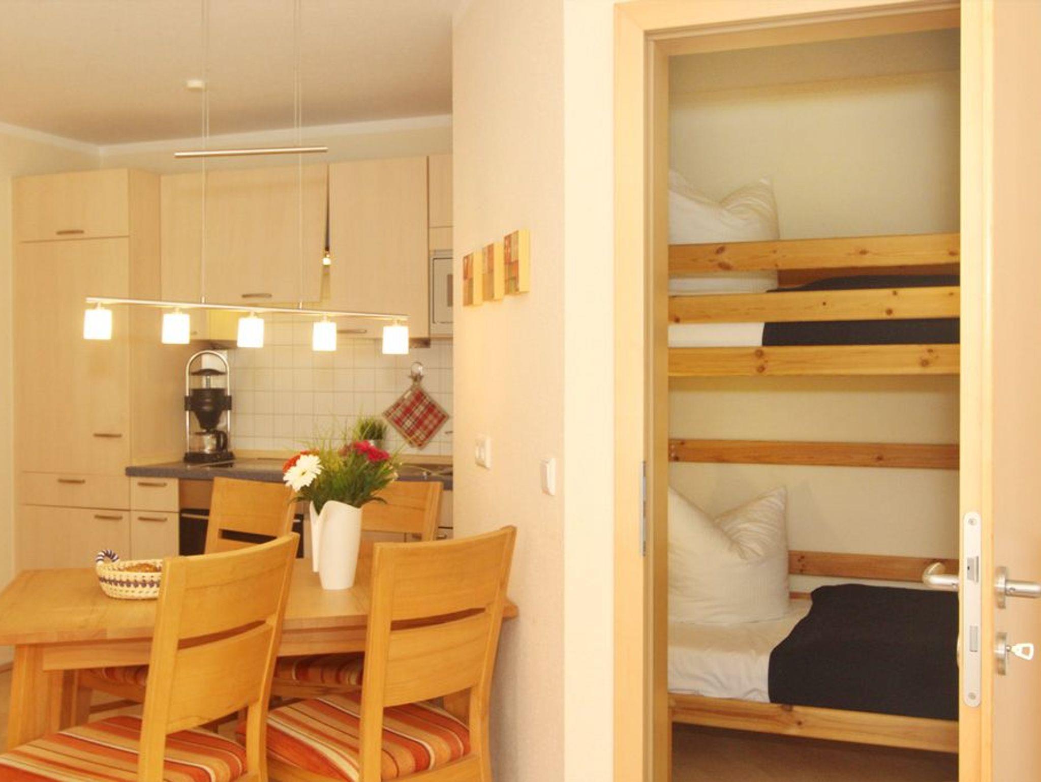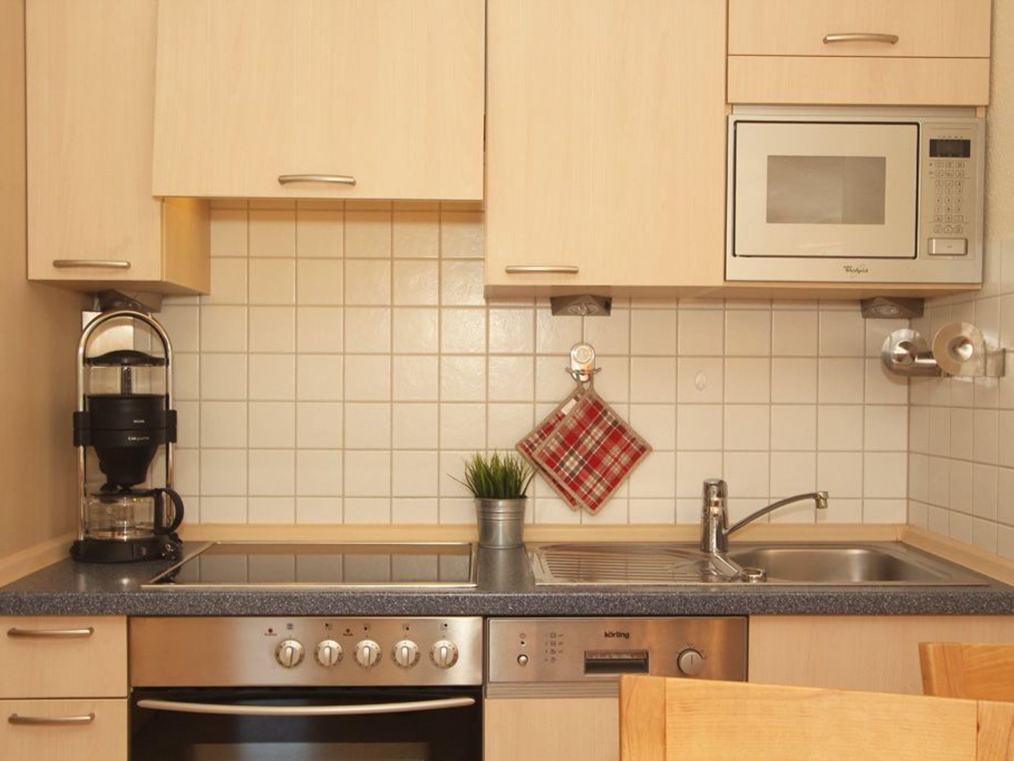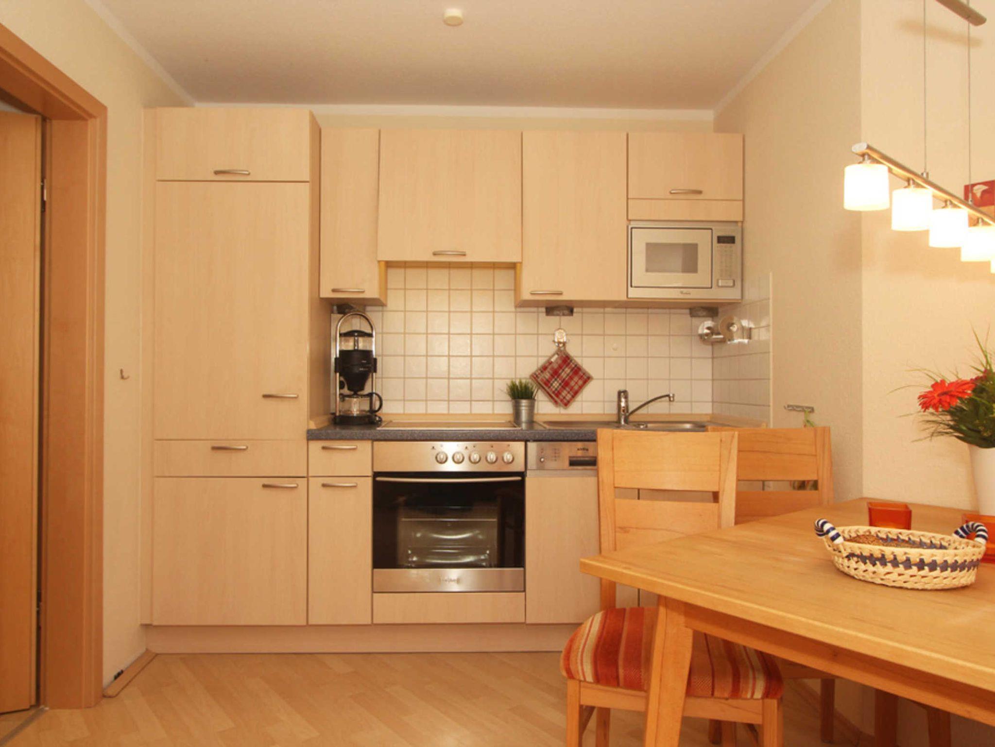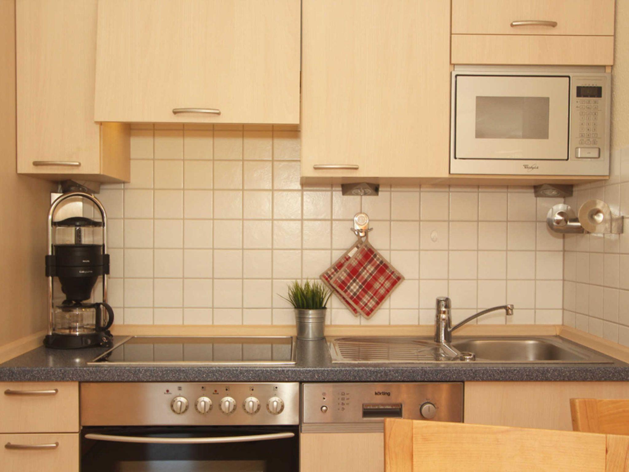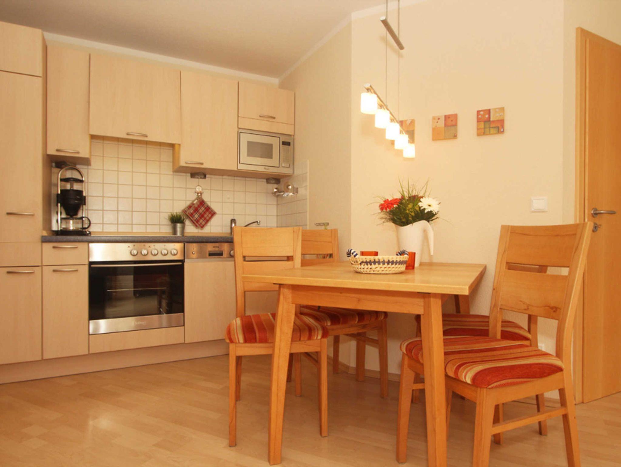 In der offenen Küche stehen für Ihre Selbstverpflegung u.a. ein Kühlschrank mit Gefrierfach, Backofen, Herd mit Ceranfeld, Geschirrspüler, Mikrowelle uvm. zur Verfügung. An der separaten Essecke können Sie gemeinsam speisen.