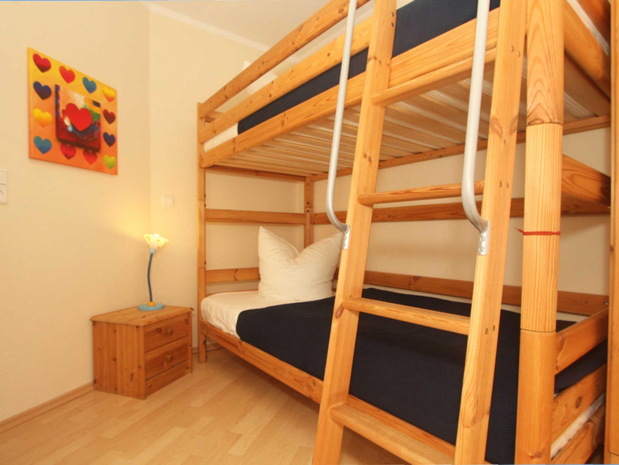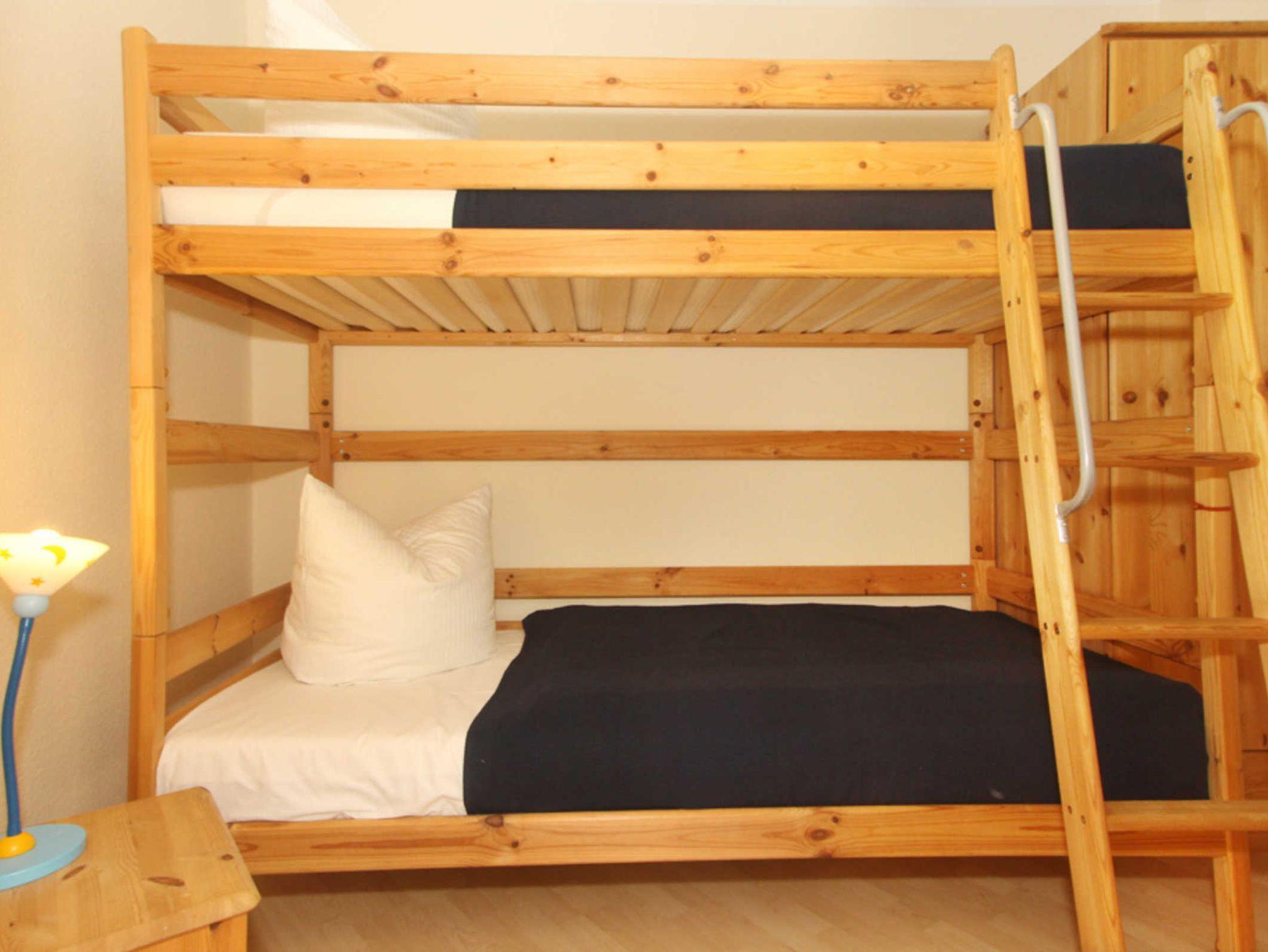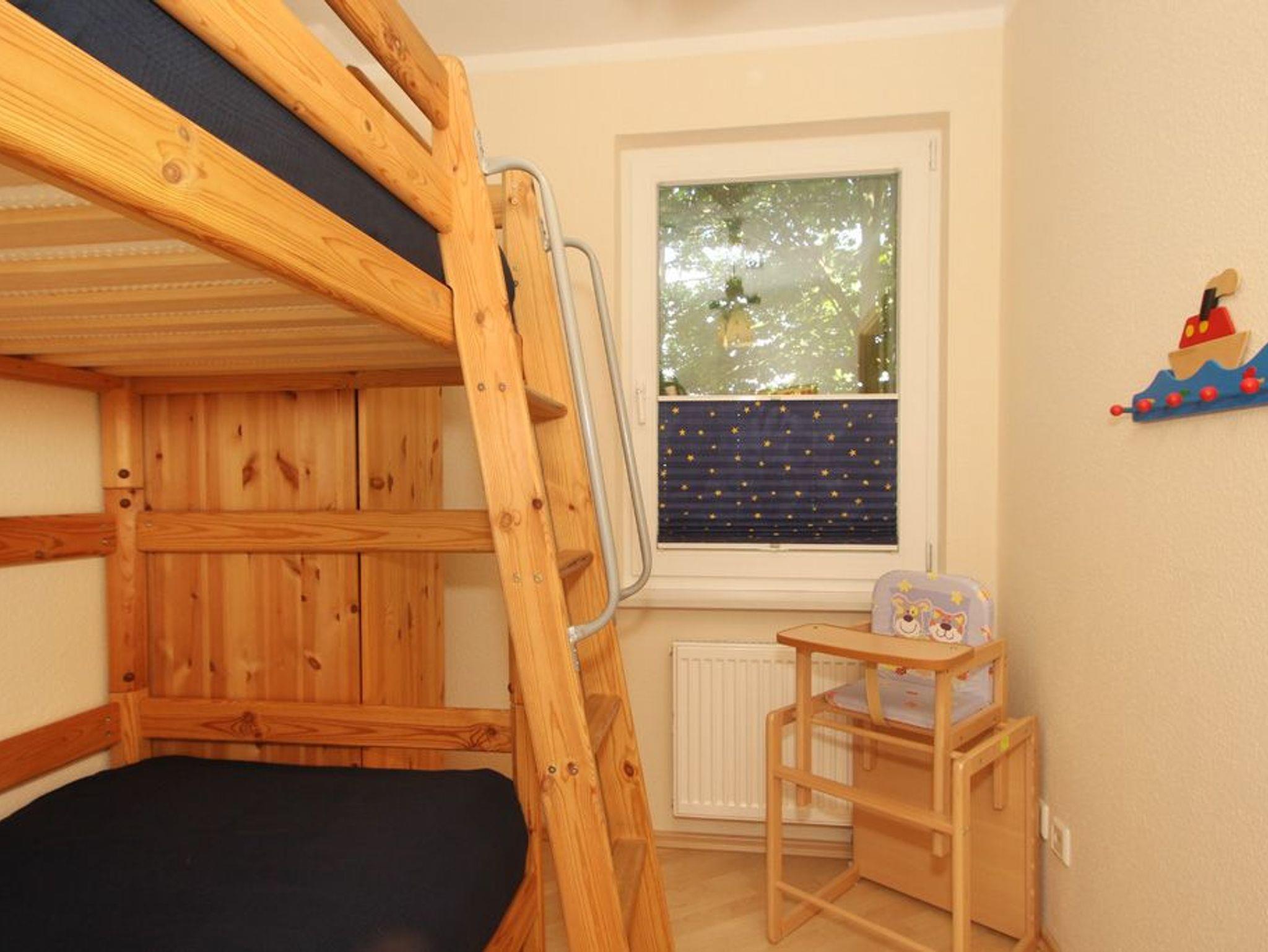 Das Gäste-/ Kinderzimmer verfügt über ein Etagenbett (je 90x 190cm/ Höhe Bett unten 41cm, Bett oben 152cm). Im kleinen Kleiderschrank kann die Urlaubsgarderobe abgelegt werden. Am Fenster befindet sich ein Verdunklungs-Plissee sowie Fliegenschutz.