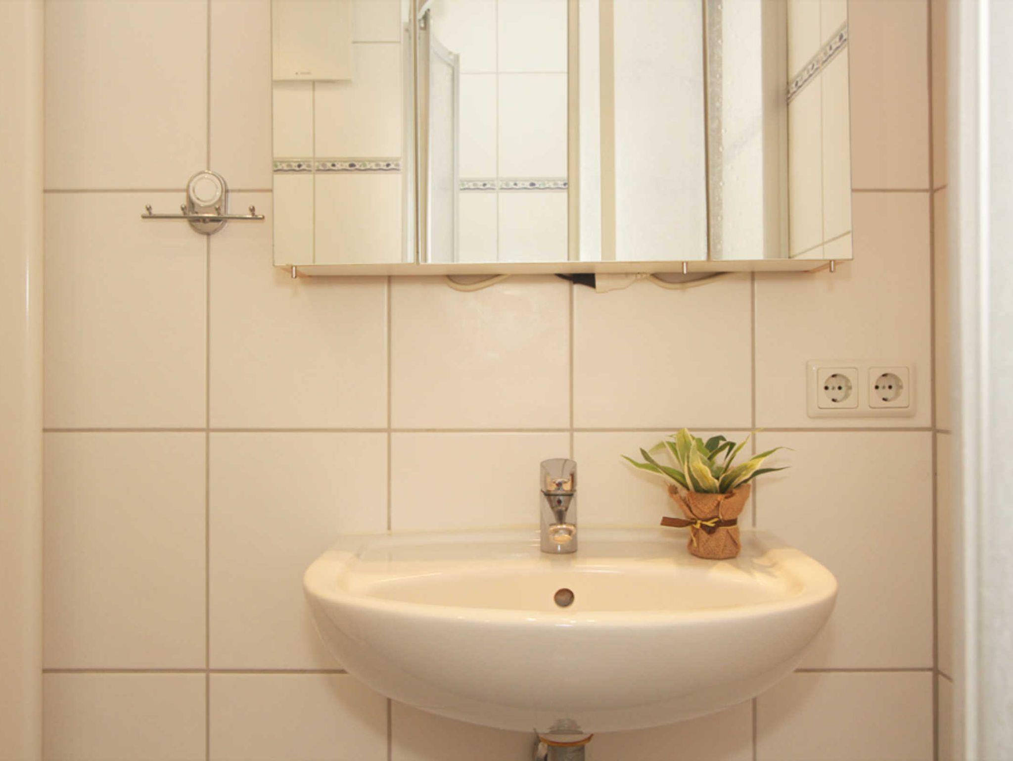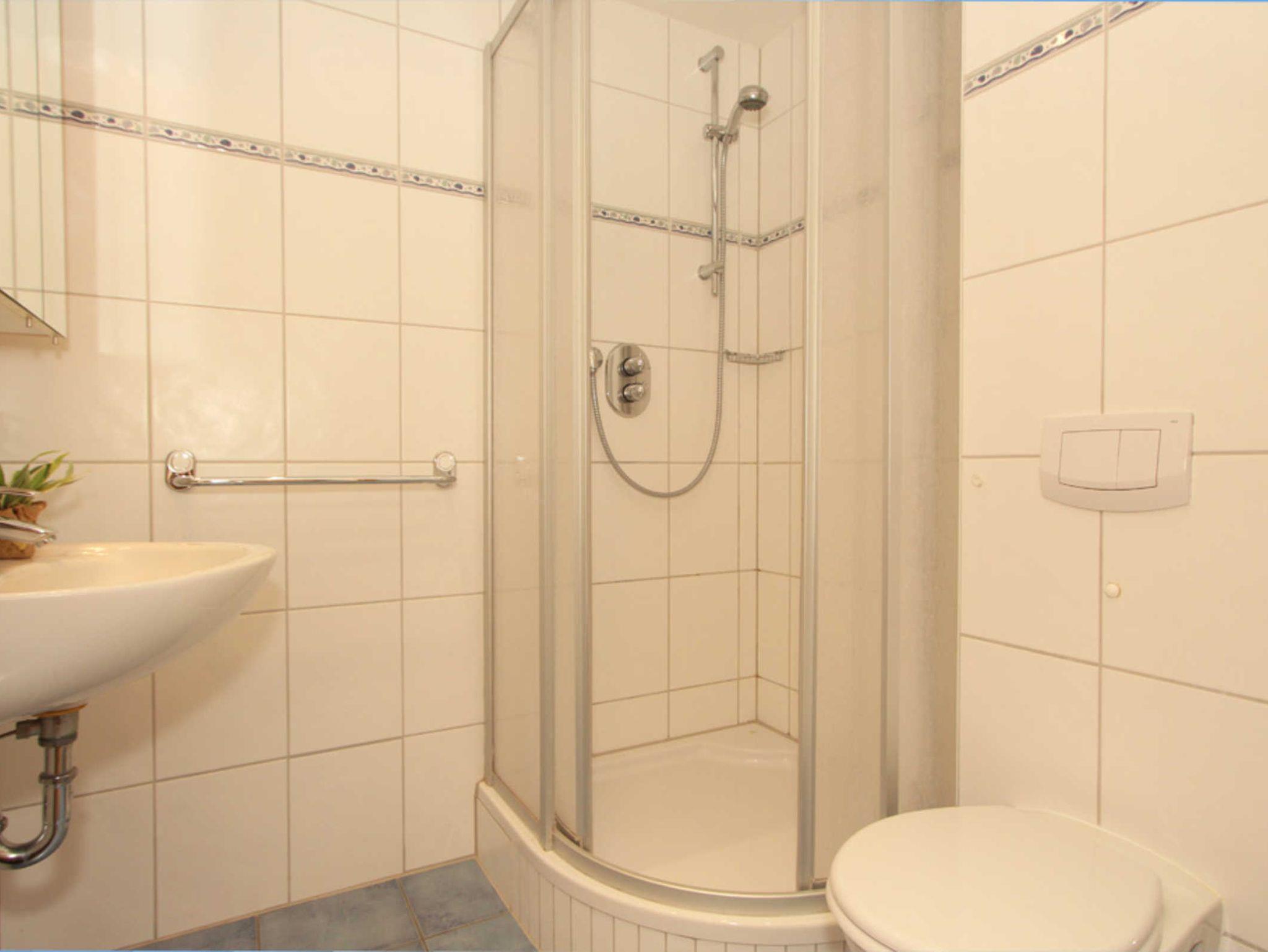 Selbstverständlich gibt es hier auch ein modernes Duschbad mit WC mit Fußbodenheizung. Eine Handtuchheizung sorgt hier auf Wunsch für mollig warme Frotteewäsche.
