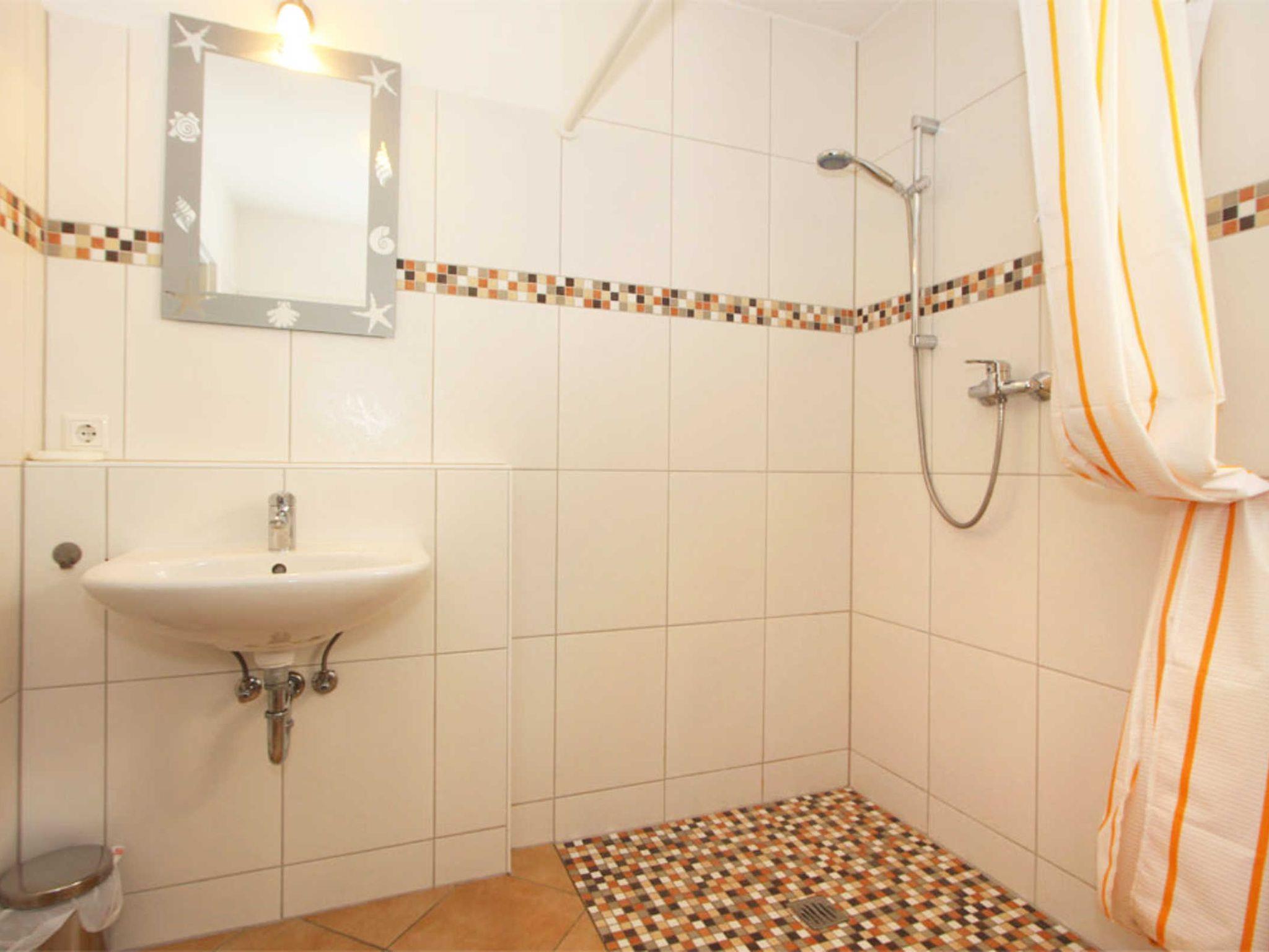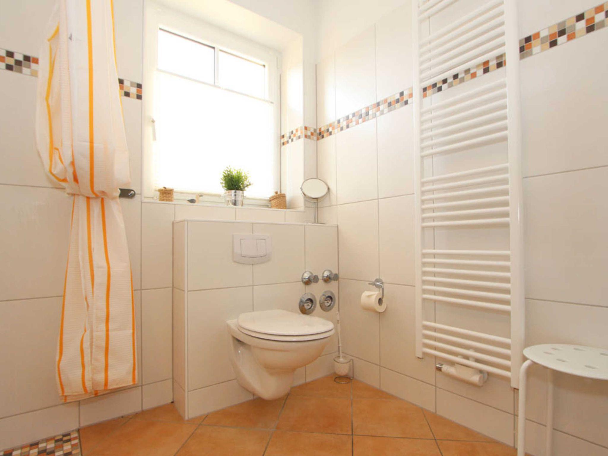 Zudem gehört ein großes Bad mit ebenerdiger Dusche und WC zum Ferienappartement. Das Fenster sorgt für angenehmes Tageslicht und hilft beim Lüften nach dem Duschen.