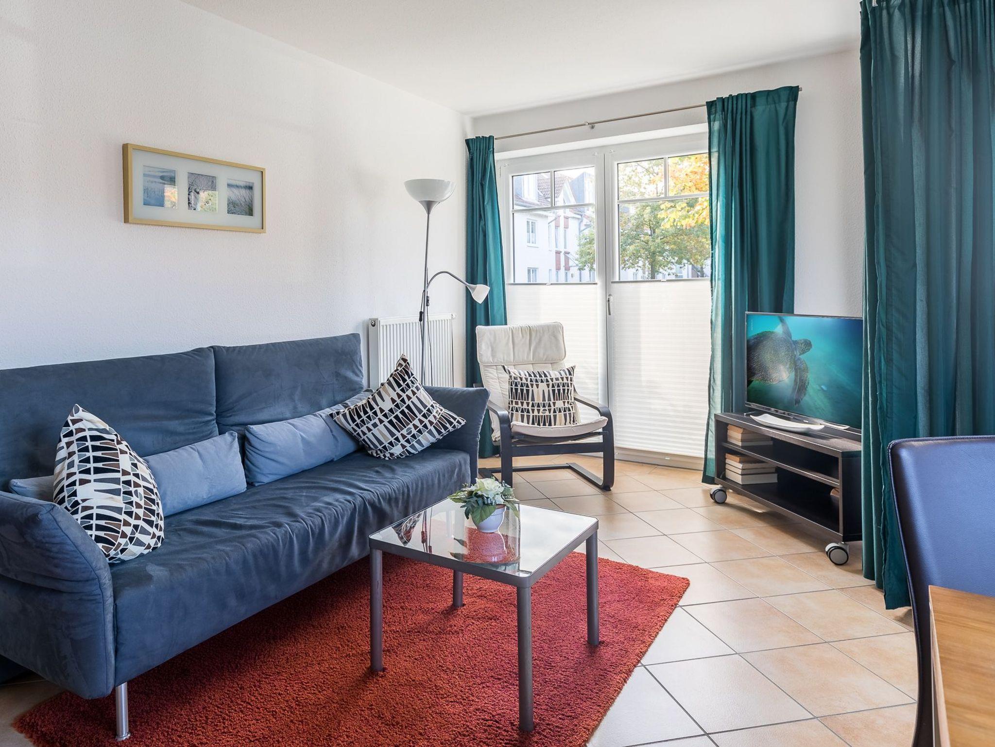 Der gemütliche Wohnbereich mit integrierter Küchenzeile, angeschlossener Essecke und Zugang zur möblierten Südwest-Sonnenterrasse bietet alle Annehmlichkeiten für einen erholsamen Aufenthalt. Der moderne Flatscreen-TV im Wohnzimmer ist bereits mit einem SAT-Receiver ausgestattet und bietet somit eine komfortable, einfache Bedienung.