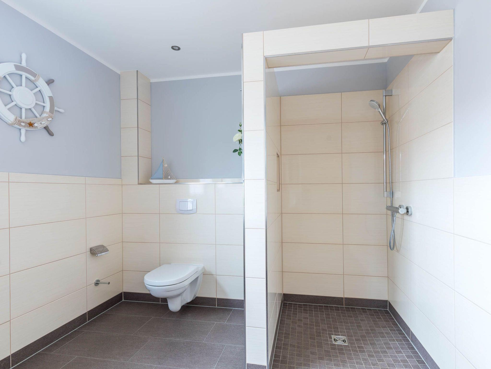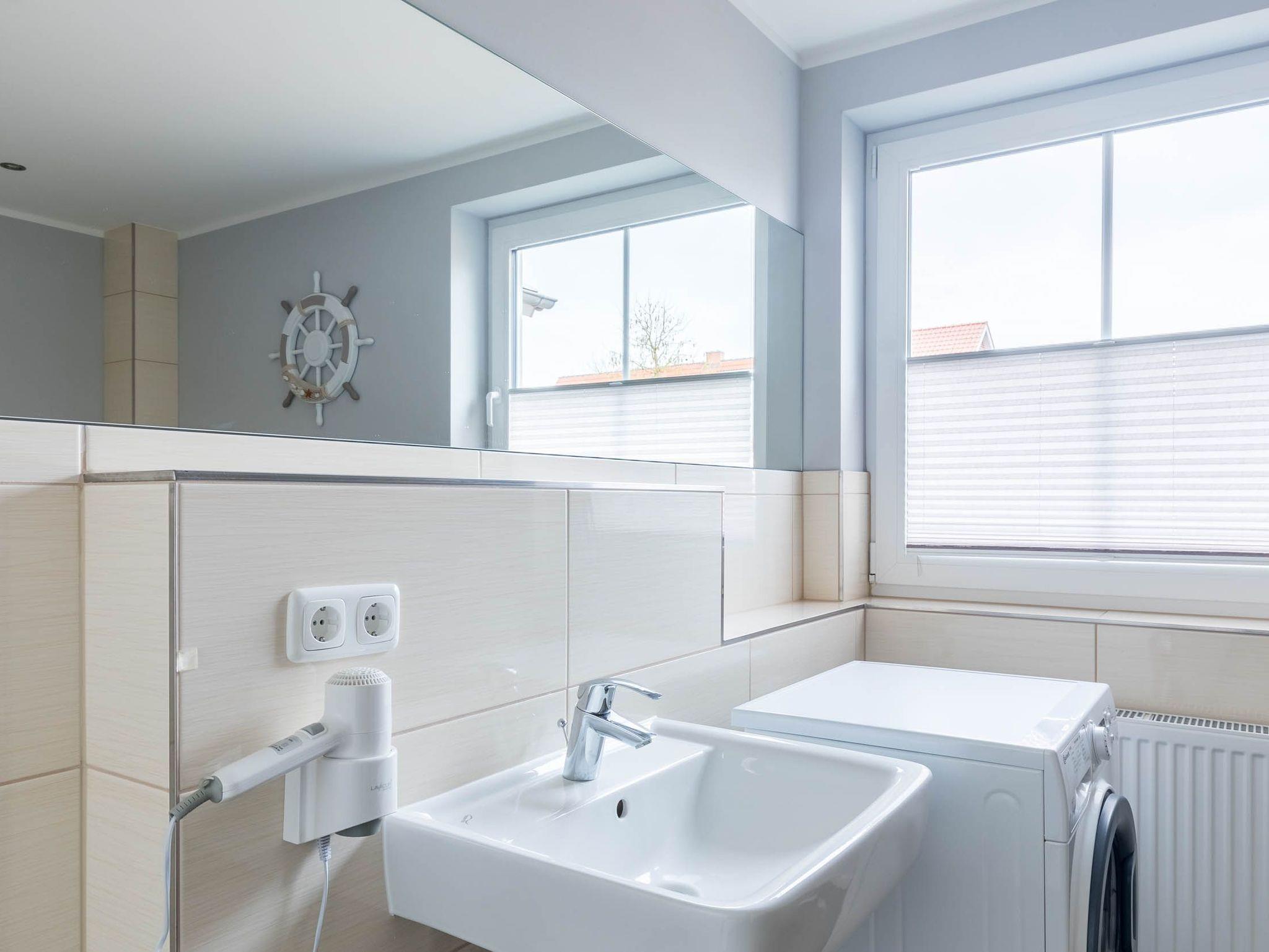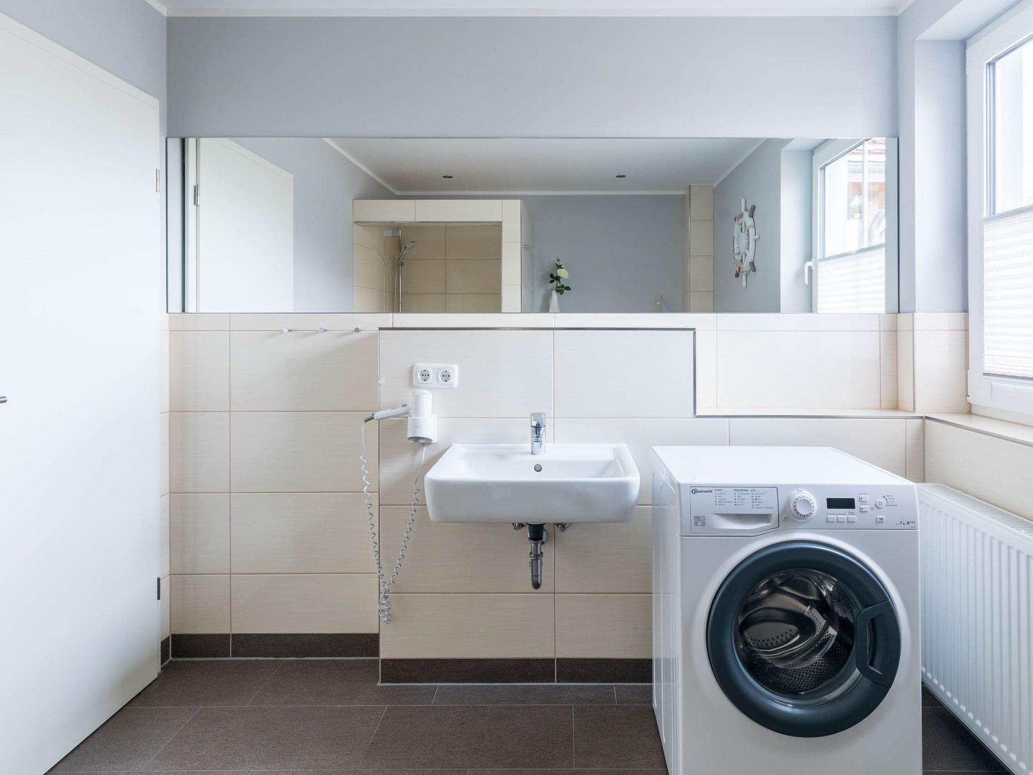 Im modernen Bad mit Tageslicht finden Sie eine barrierefreie Dusche, Waschbecken, WC und auch eine Waschmaschine.