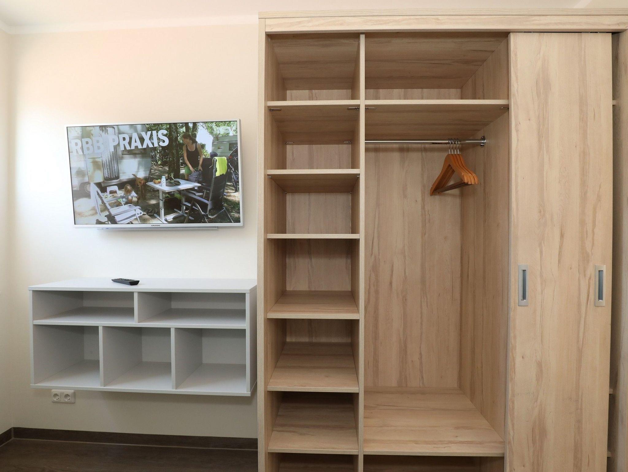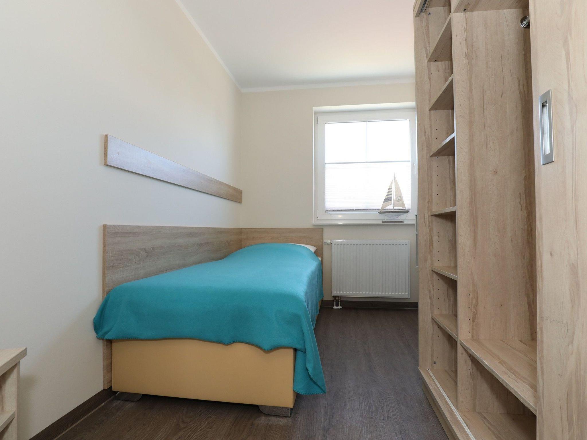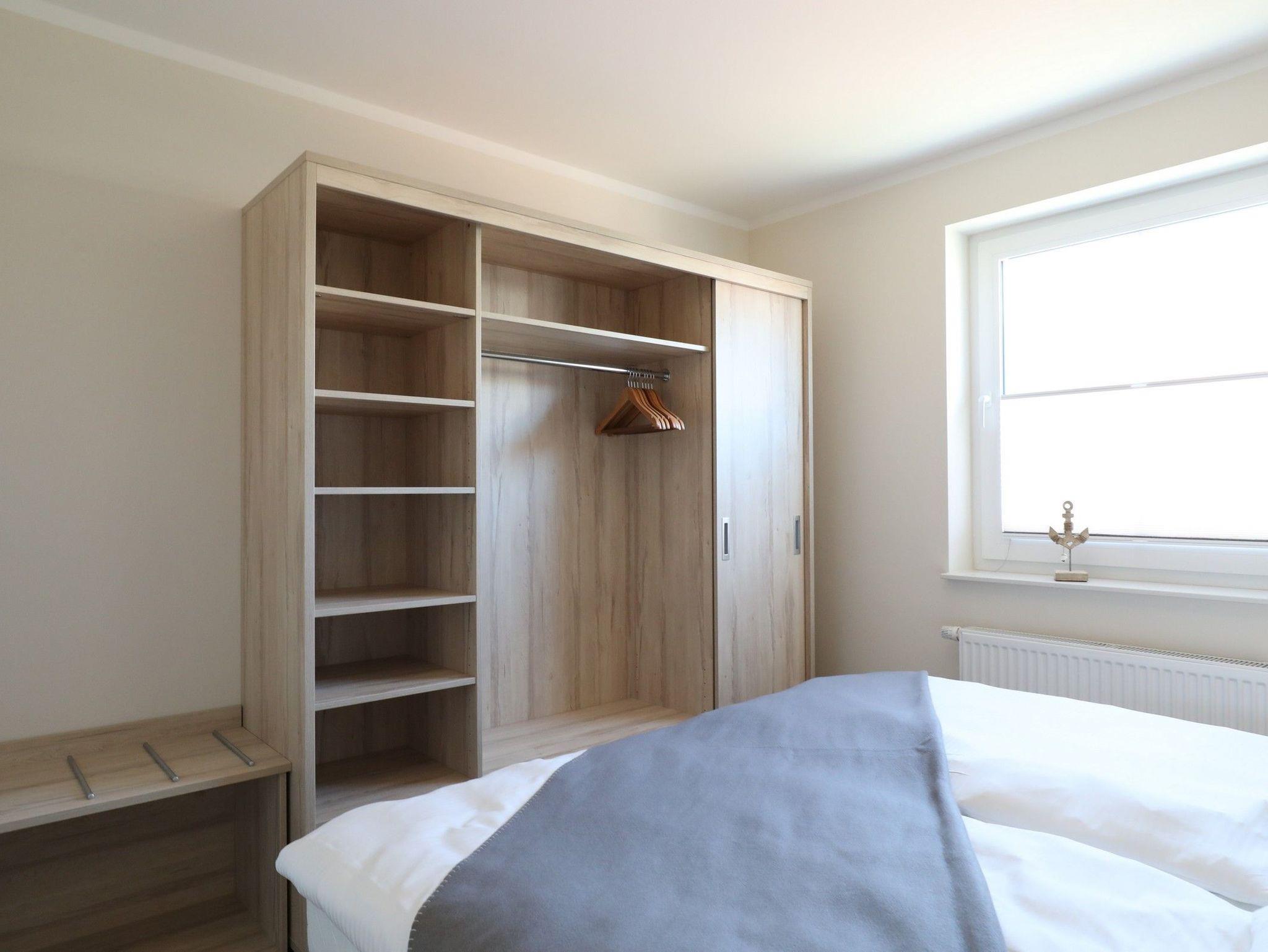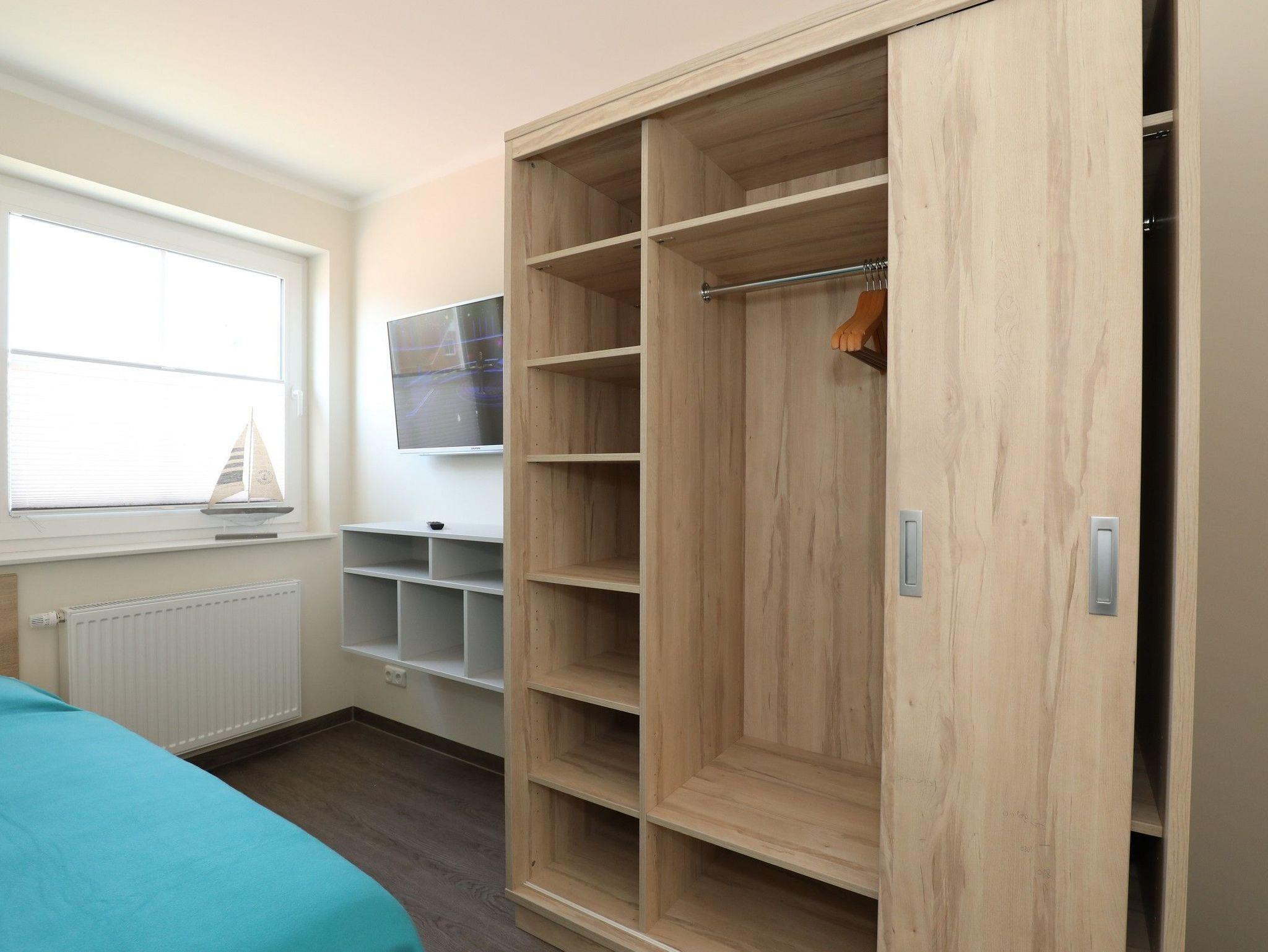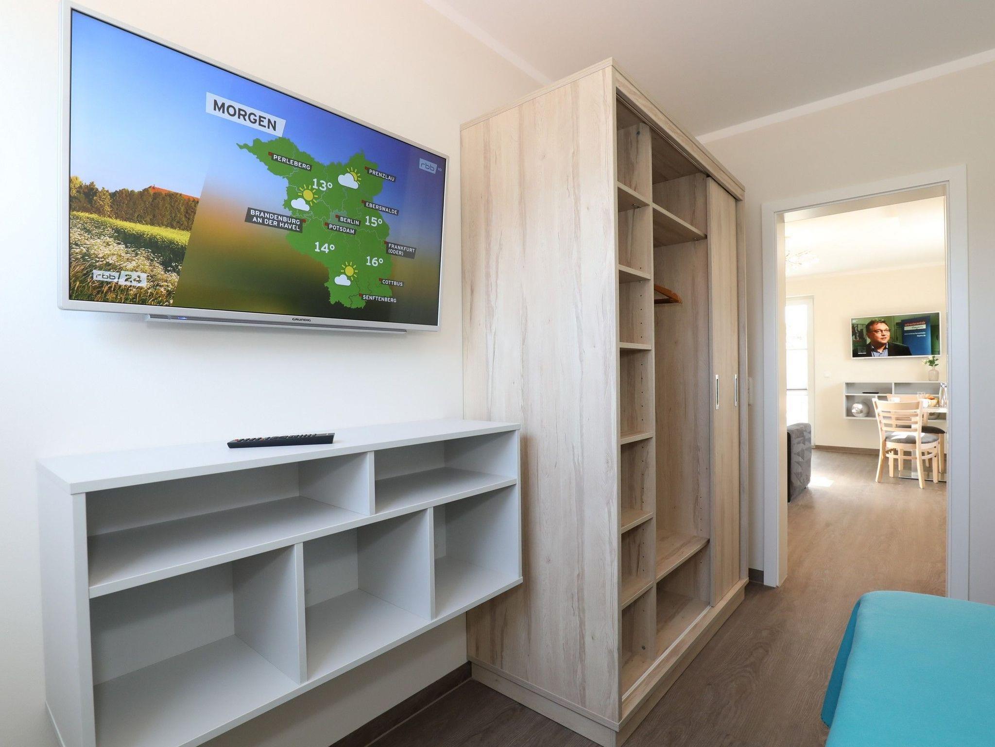 Das große Schlafzimmer ist mit einem Doppelbett, das Gäste-/ Kinderzimmer mit einem Einzelbett ausgestattet. Beide Zimmer bieten außerdem einen geräumigen Kleiderschrank sowie einen modernen Flatscreen-TV an der Wand.