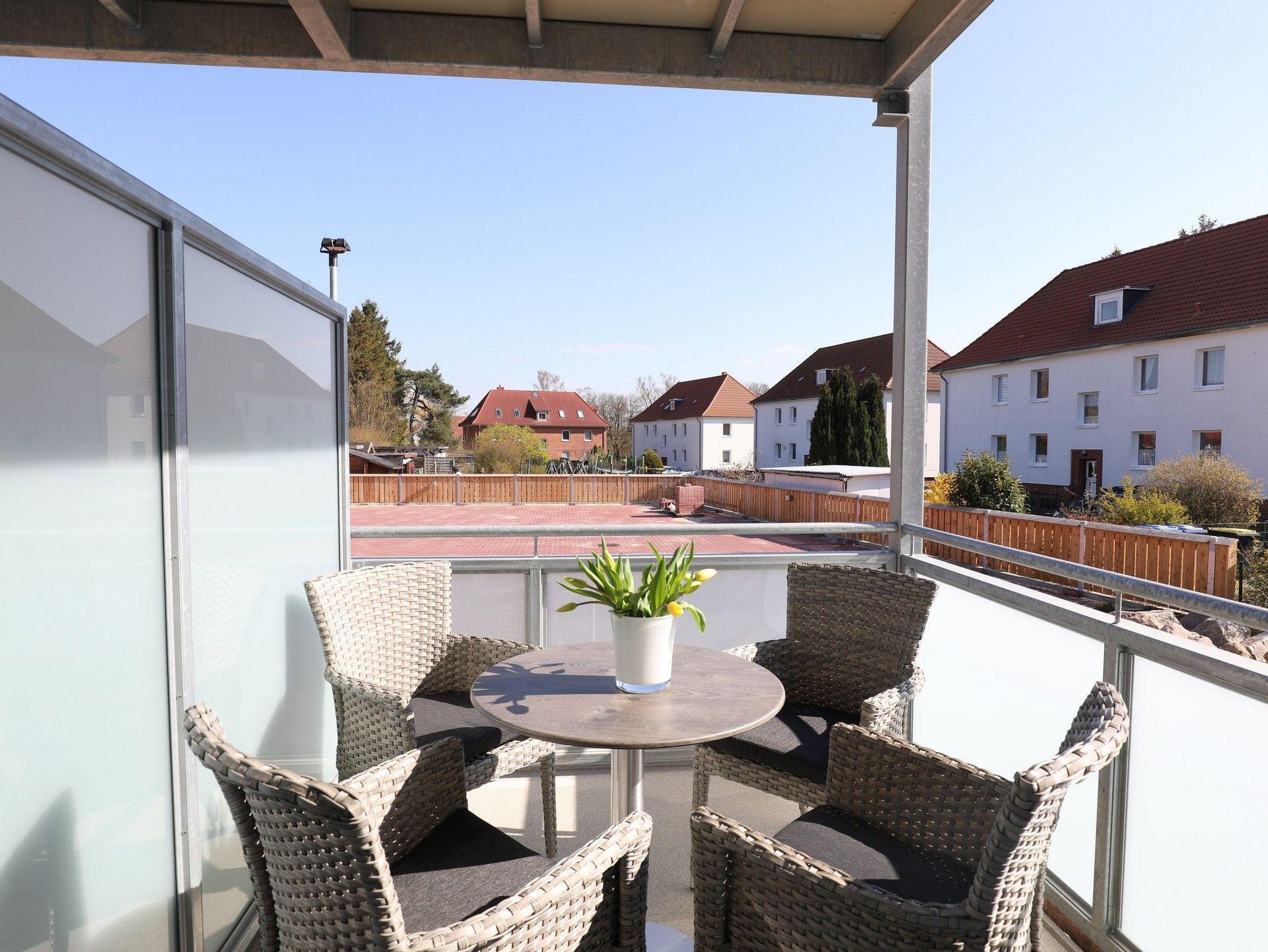 Das bequeme Ecksofa offenen Wohn- und Essbereich mit passenden Hockern lädt zum gemütlichen Beisammensein oder zum Entspannen beim Fernsehen ein. Auf dem möblierten, überdachten Südost-Balkon (zum Hinterhaus), welchen Sie ebenfalls vom Wohnzimmer aus erreichen, können Sie den Abend bei einem Glas Wein ausklingen lassen.