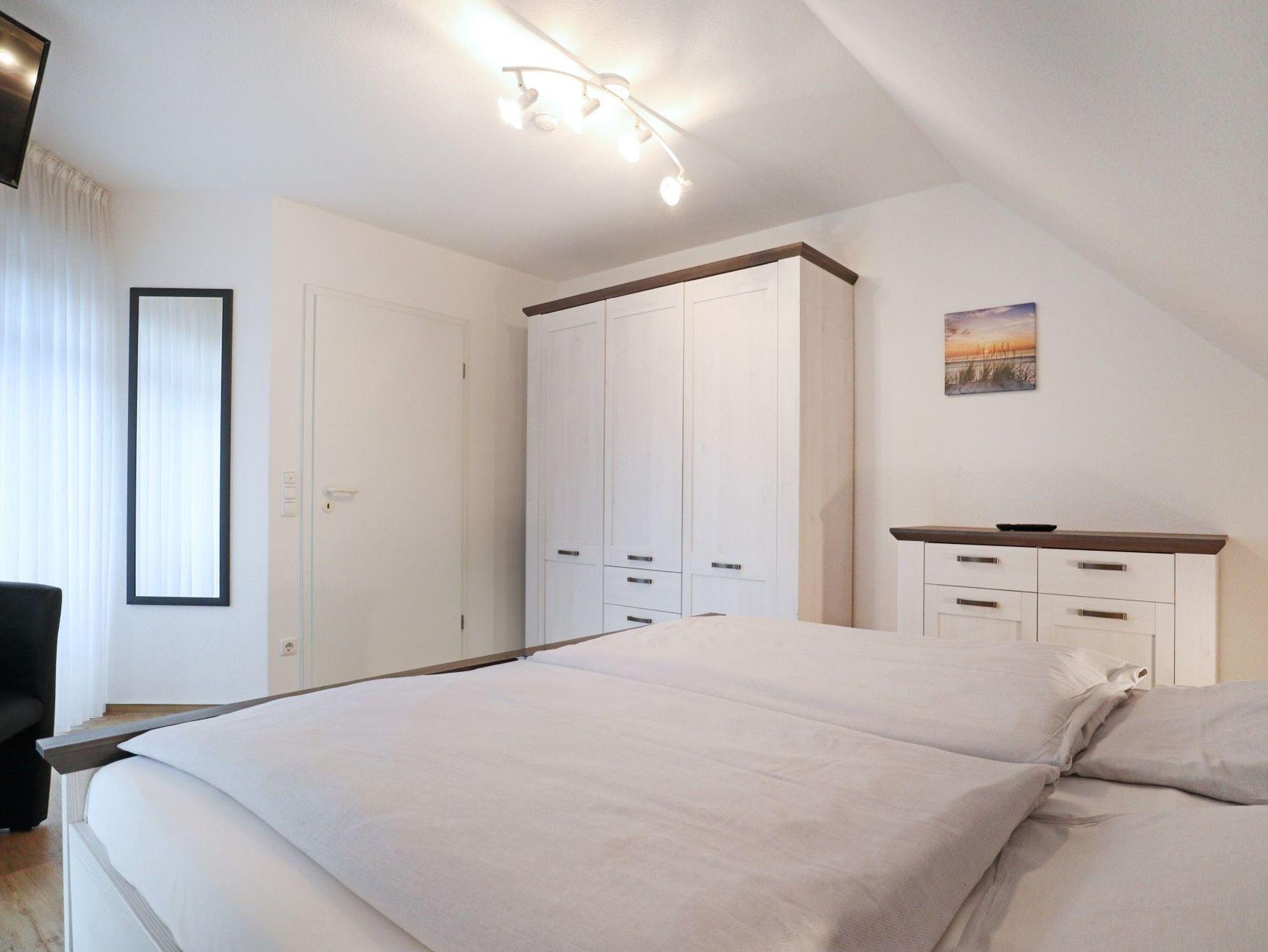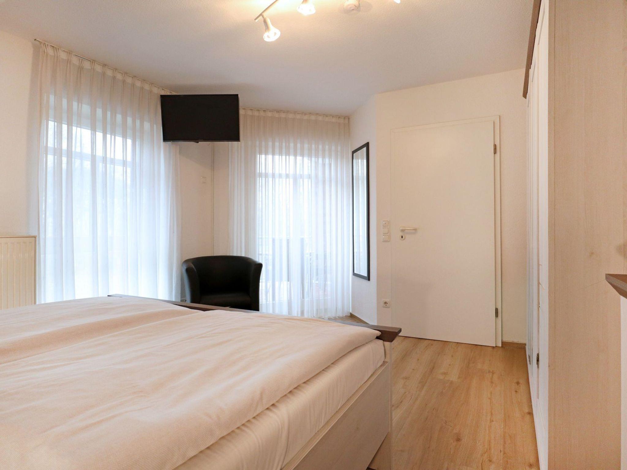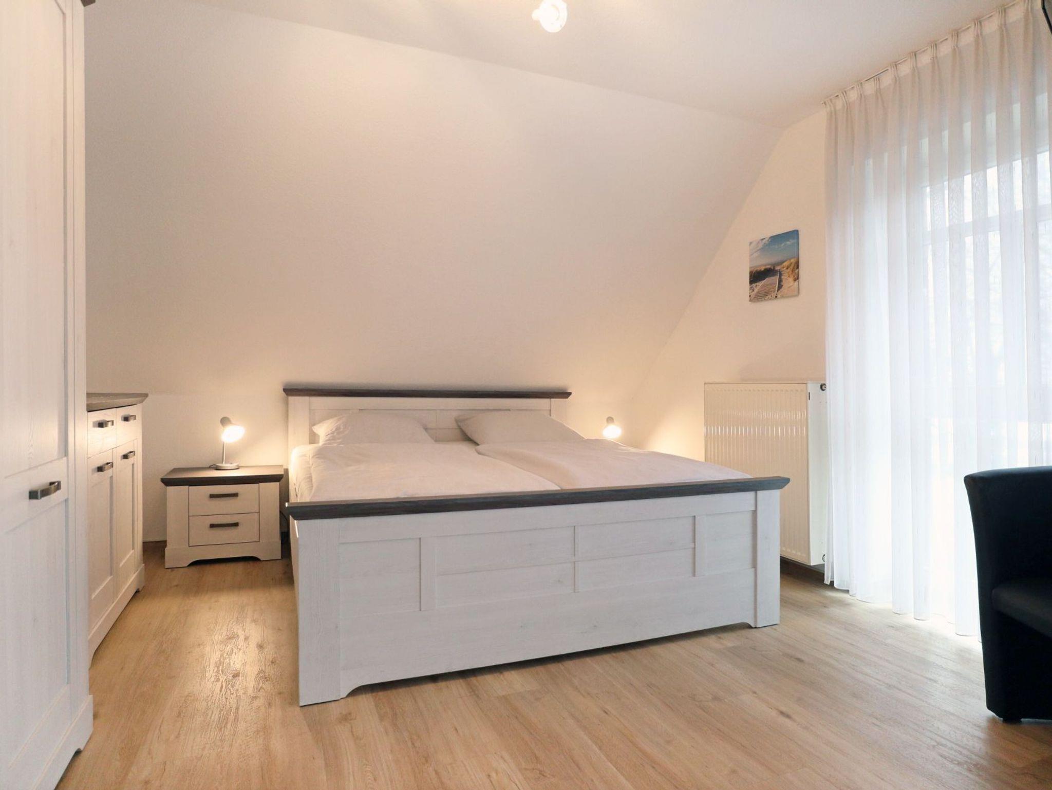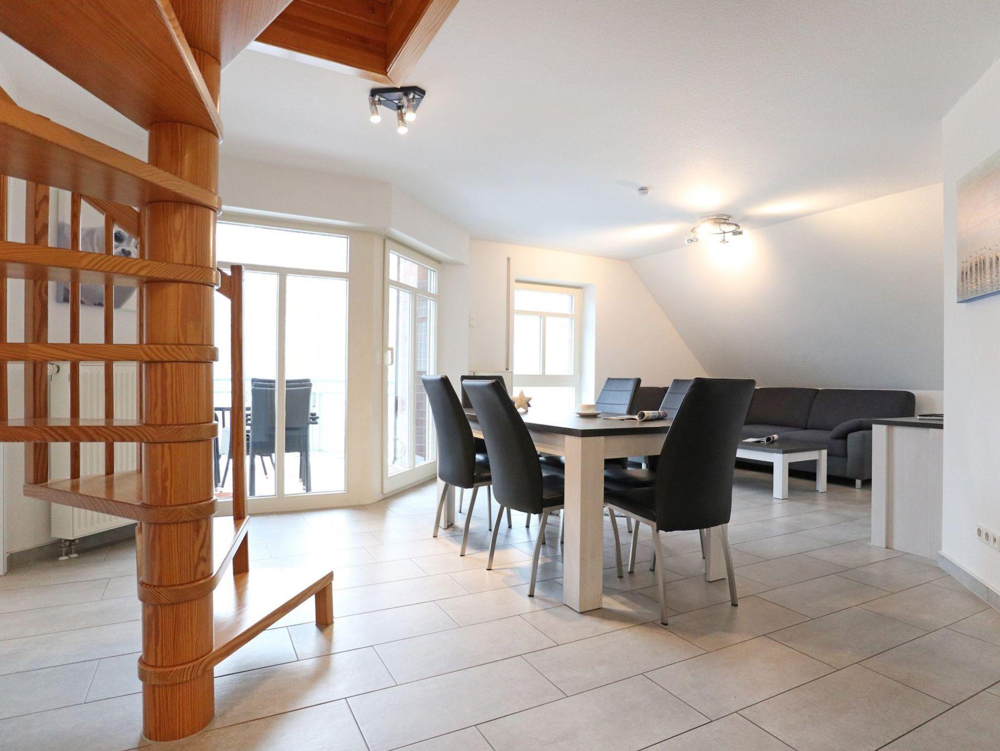 Diese tolle 4 -Zimmer Meerblick Maisonettenwohnung mit zwei Balkonen und zwei Bädern, befindet sich im 2.Obergeschoss des Hauses. Mit einer großzügigen Wohnfläche von 90qm ist die Ferienwohnung für eine Belegung mit max. 6 Personen geeignet. Im modern möblierten Wohn-Essbereich mit Balkonzugang, erwartet Sie ein bequemes Sofa mit Ruhesessel, ein Esstisch sowie Fernseher, Musikanlage und gebührenfreies WLAN sind ebenfalls vorhanden. Ideal für die Eigenversorgung ist die integrierte, voll ausgestattete Wohnküche mit: Ceranfeldherd, Backofen, Mikrowelle, Dunstabzug, Kühlschrank mit integr. Frostfach, Geschirrspüler, Toaster, Kaffeemaschine, Wasserkocher usw. Ihre Mahlzeiten nehmen Sie am Esstisch zu sich, oder Sie genießen den saisonal möblierten Balkon in nördliche Ausrichtung. Zudem befinden sich auf der unteren Wohnebene zwei separate Schlafzimmer. Das erste Schlafzimmer ist sehr geräumig und verfügt über ein Doppelbett, Kleiderschrank, Kommode, Sitzgelegenheit, Fernseher. Im zweiten Schlafzimmer erwartet Sie ein Doppelbett, Kleiderschrank, Schreibplatz. Auch ein Tageslichtbad mit Wanne, Dusche, Waschtisch, WC befindet sich auf dieser Ebene.