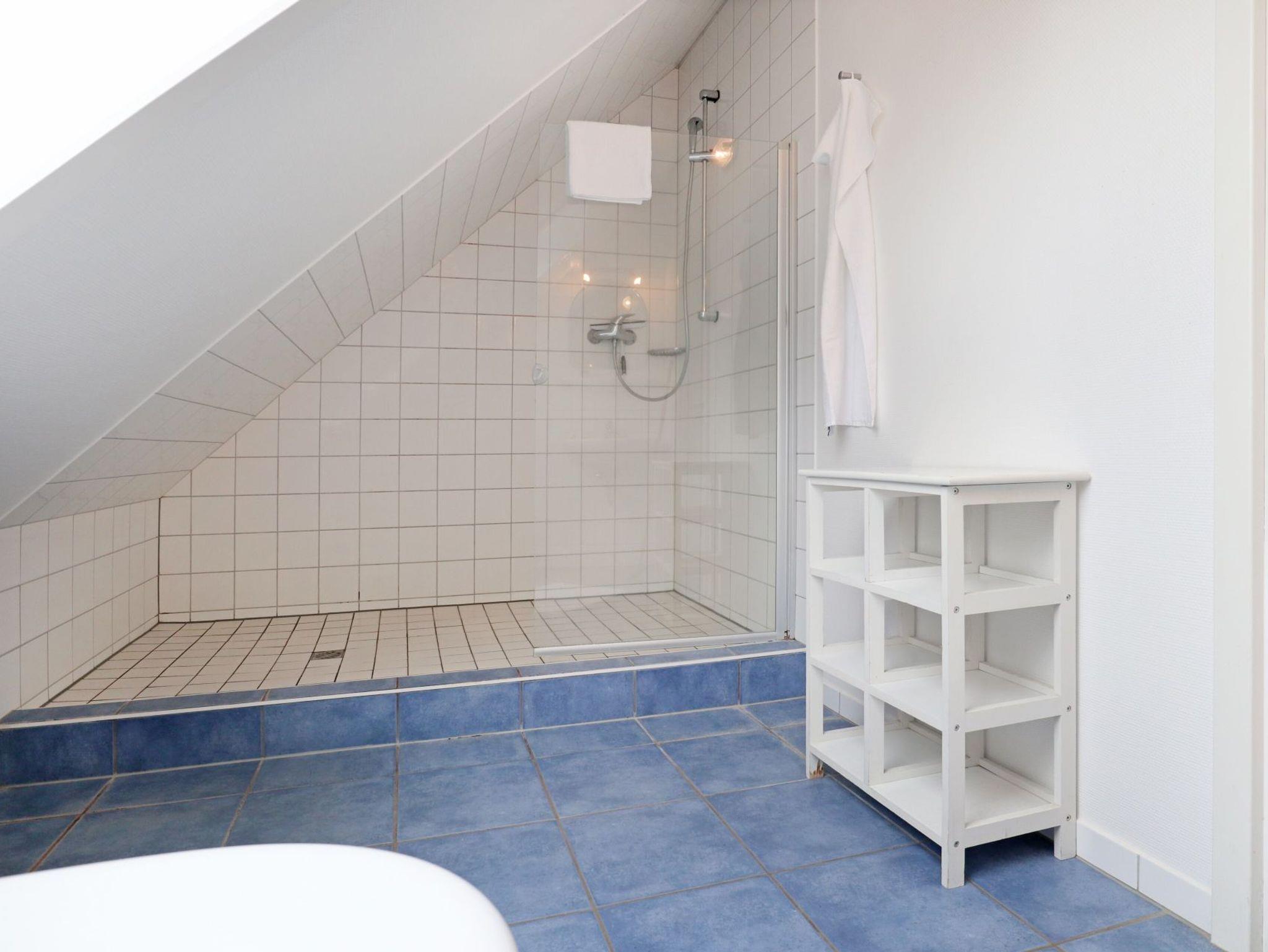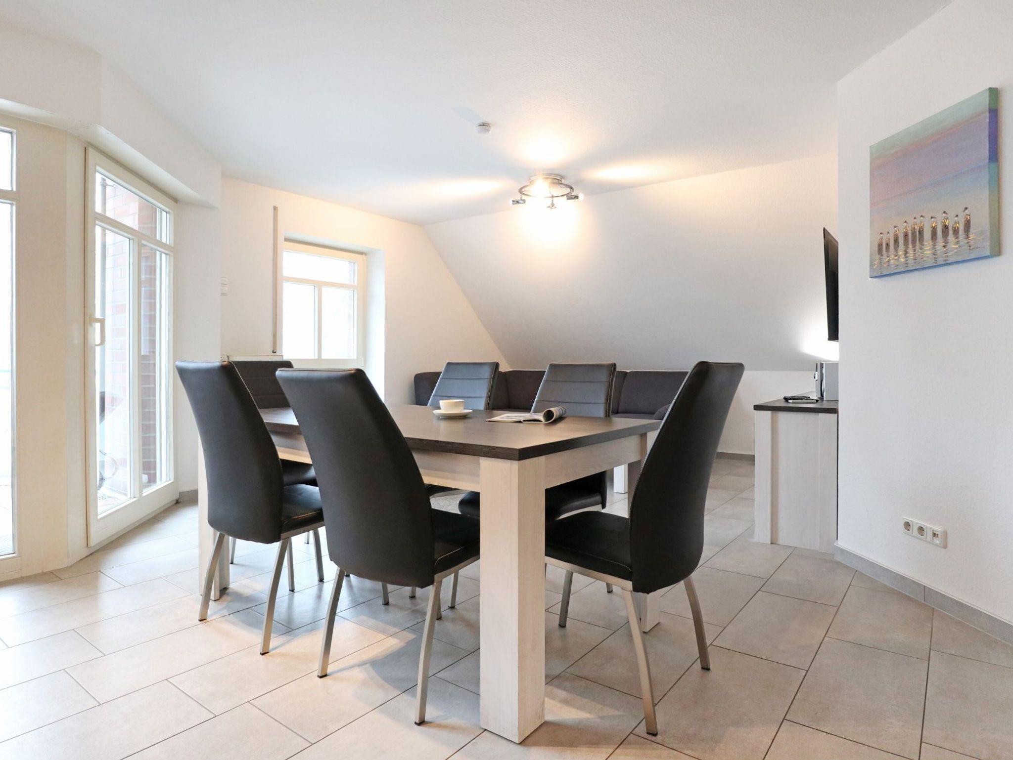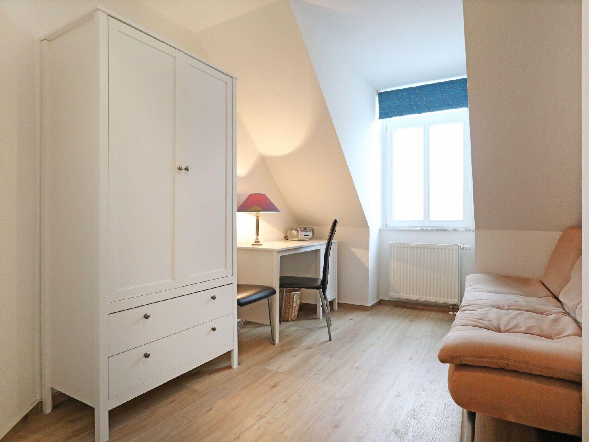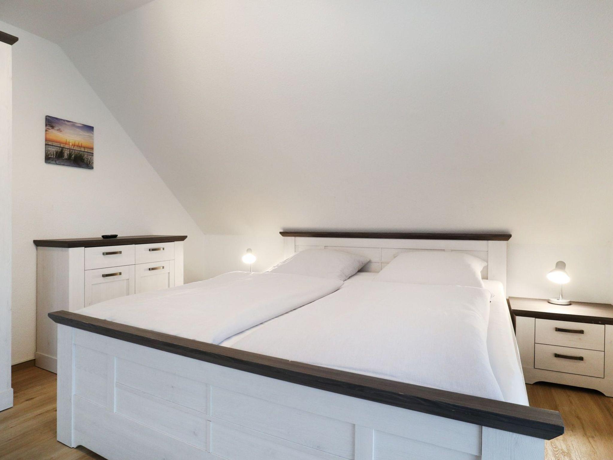 Diese tolle 4 -Zimmer Meerblick Maisonettenwohnung mit zwei Balkonen und zwei Bädern, befindet sich im 2.Obergeschoss des Hauses. Mit einer großzügigen Wohnfläche von 90qm ist die Ferienwohnung für eine Belegung mit max. 6 Personen geeignet. Im modern möblierten Wohn-Essbereich mit Balkonzugang, erwartet Sie ein bequemes Sofa mit Ruhesessel, ein Esstisch sowie Fernseher, Musikanlage und gebührenfreies WLAN sind ebenfalls vorhanden. Ideal für die Eigenversorgung ist die integrierte, voll ausgestattete Wohnküche mit: Ceranfeldherd, Backofen, Mikrowelle, Dunstabzug, Kühlschrank mit integr. Frostfach, Geschirrspüler, Toaster, Kaffeemaschine, Wasserkocher usw. Ihre Mahlzeiten nehmen Sie am Esstisch zu sich, oder Sie genießen den saisonal möblierten Balkon in nördliche Ausrichtung. Zudem befinden sich auf der unteren Wohnebene zwei separate Schlafzimmer. Das erste Schlafzimmer ist sehr geräumig und verfügt über ein Doppelbett, Kleiderschrank, Kommode, Sitzgelegenheit, Fernseher. Im zweiten Schlafzimmer erwartet Sie ein Doppelbett, Kleiderschrank, Schreibplatz. Auch ein Tageslichtbad mit Wanne, Dusche, Waschtisch, WC befindet sich auf dieser Ebene.
