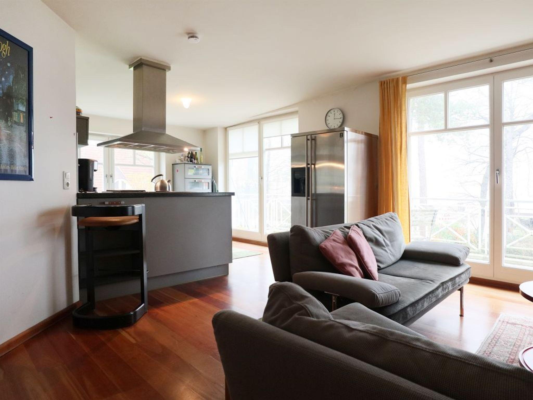 Diese Meerblick Ferienwohnung befindet sich im 1. Obergeschoss des Hauses. Die Wohnfläche von ca. 73qm kann mit max. 4 Personen bewohnt werden. Der offene Wohn-Essbereich mit Kaminofen, ist sehr komfortabel mit einer Sofagarnitur sowie einem großen Esstisch möbliert. Fernseher und Musikanlage sind ebenfalls vorhanden. Die offene Wohnküche ist voll ausgestattet und ermöglicht die Eigenversorgung: Herd, Backofen, Dunstabzug, amerikanischer Kühlschrank mit Eiswürfel Zubereiter, Kaffeemaschine, Toaster usw. ermöglichen die Herstellung von Urlaubsmahlzeiten. Das Domizil bietet Ihnen einen saisonal möblierten Balkon in nördliche Ausrichtung zur Ostsee.