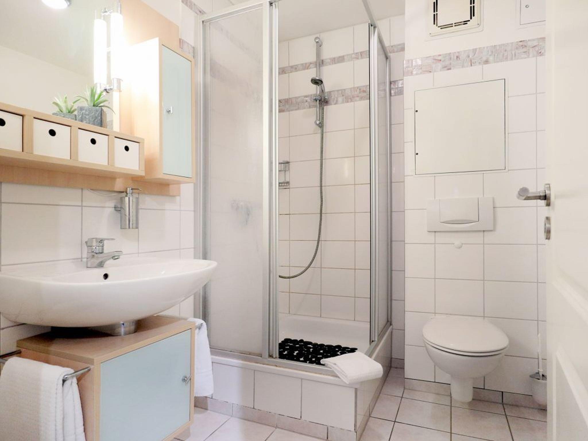 Zur Wohnung gehört ist ein hell gefliestes Duschbad mit Waschtisch und WC.