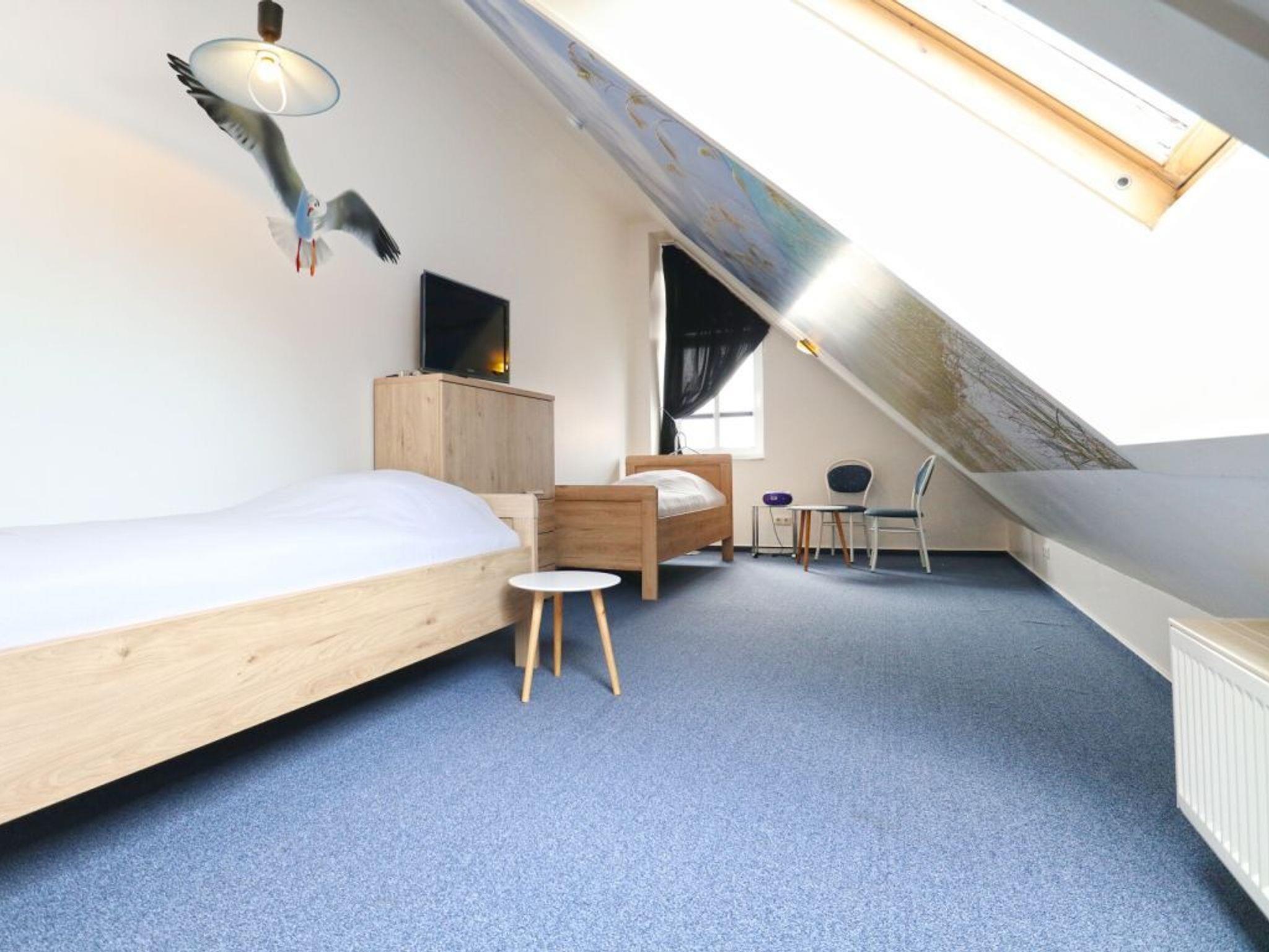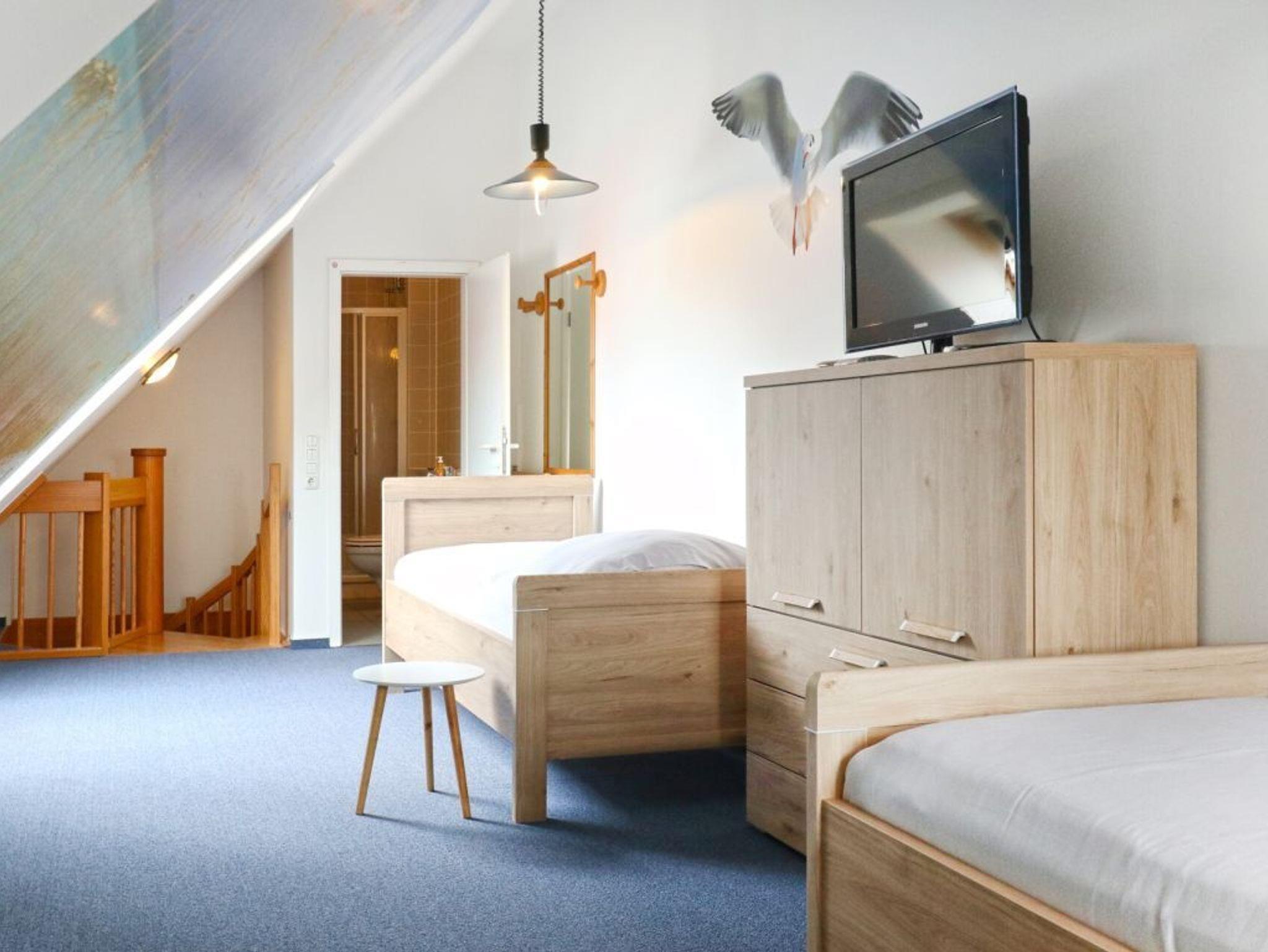 Zudem bietet die untere Wohnetage ein separates Schlafzimmer mit Doppelbett und Kleiderschrank. Auch ein Duschbad mit Waschtisch und WC ist hier vorhanden. Über eine Wendeltreppe erreichen Sie die Maisonetten Etage mit einem weiteren Schlafbereich, welcher mit zwei Einzelbetten, Kommode und Fernseher eingerichtet ist.