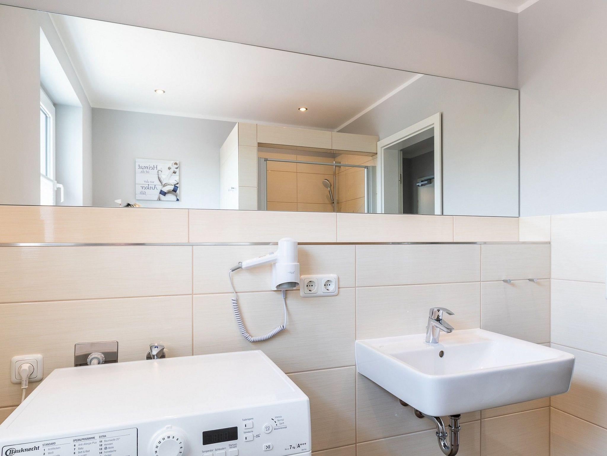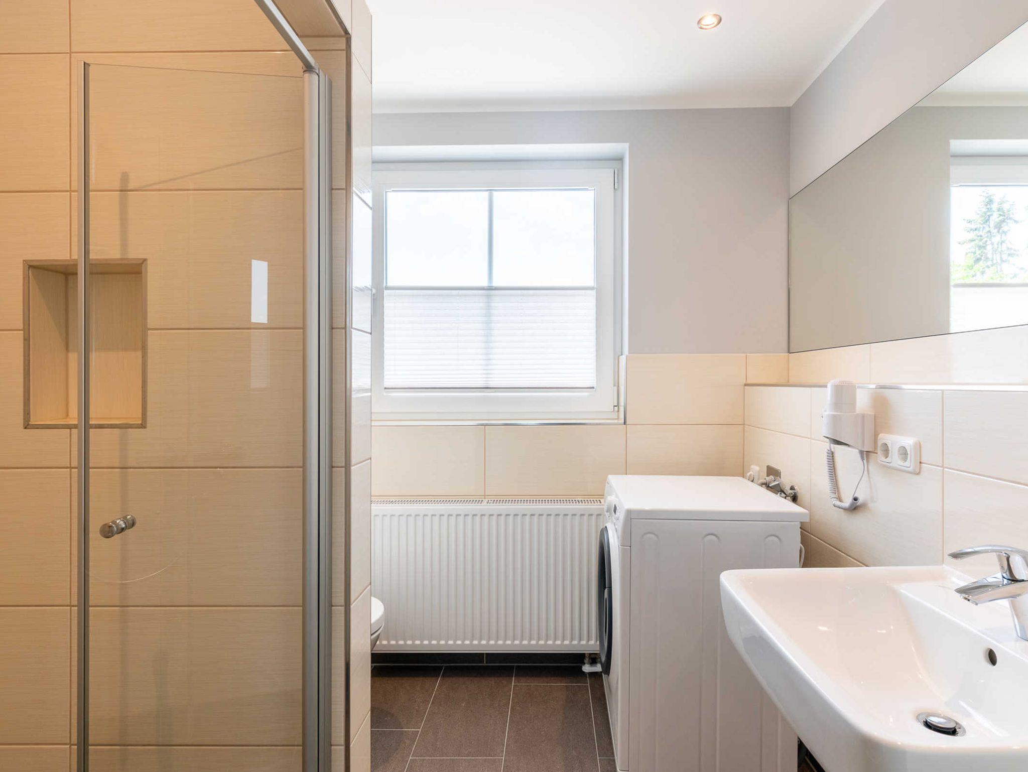 Das moderne Bad mit Tageslicht bietet eine barrierefreie Dusche, Waschbecken, WC und auch eine Waschmaschine.