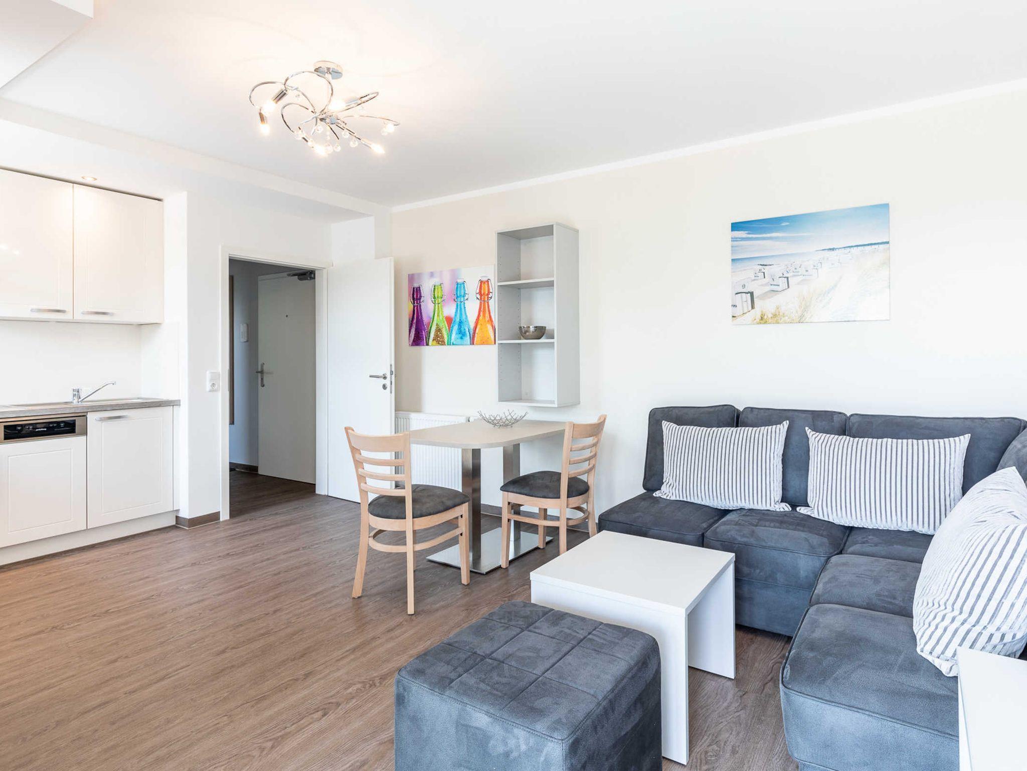 Die 2-Zimmer-Ferienwohnung im 1. Obergeschoss in Boltenhagen mit verbundenem Wohn- und Essbereich ist ideal für einen Ostseeurlaub zu Zweit.