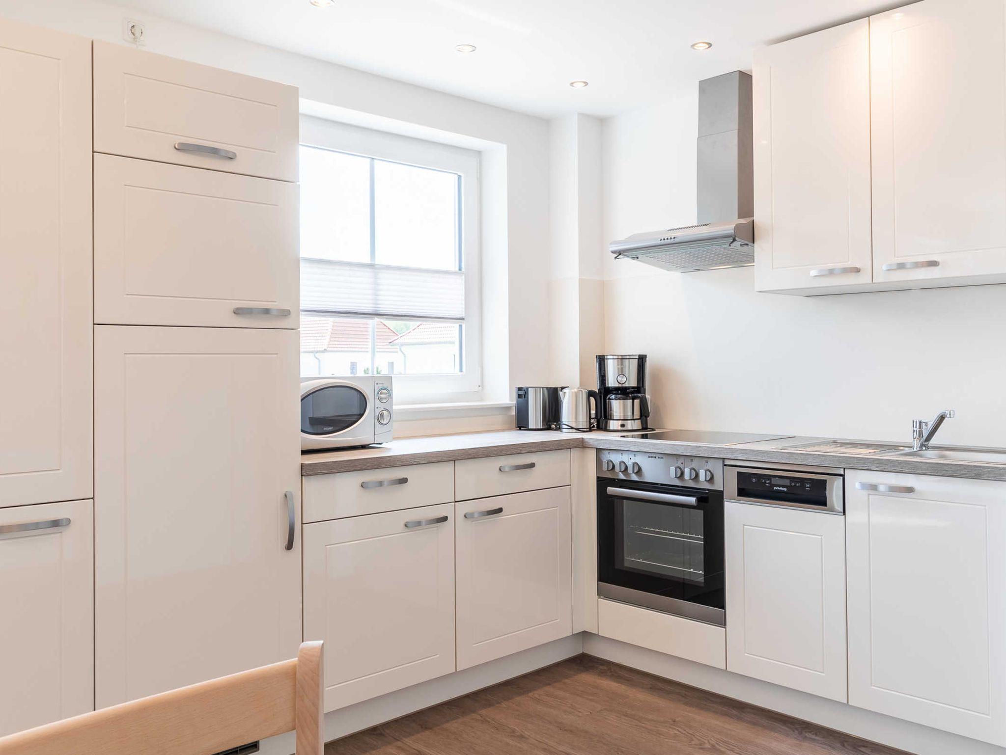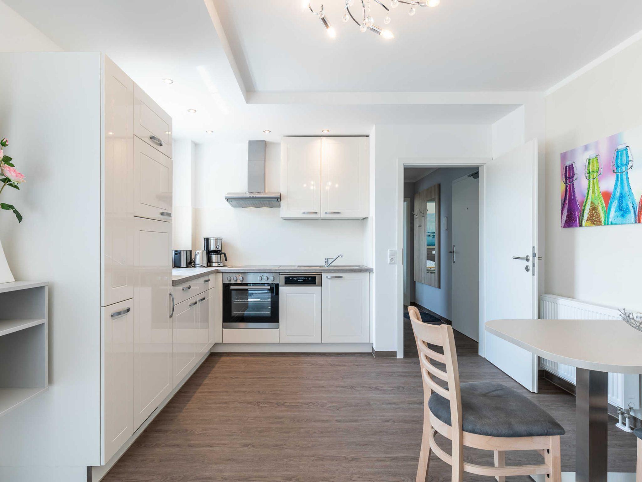 Zur gut ausgestatteten offenen Küche gehört auch schöner ein Essbereich für 2 Personen.