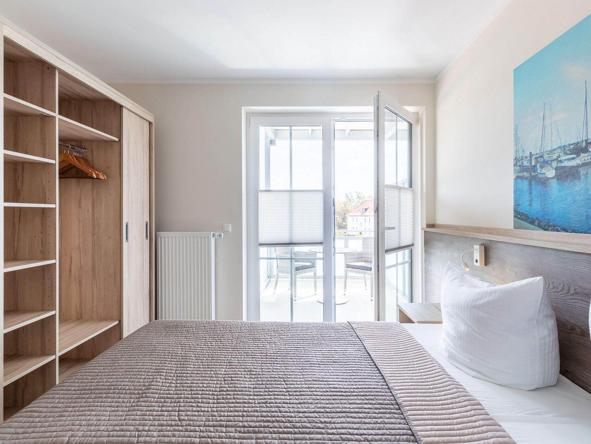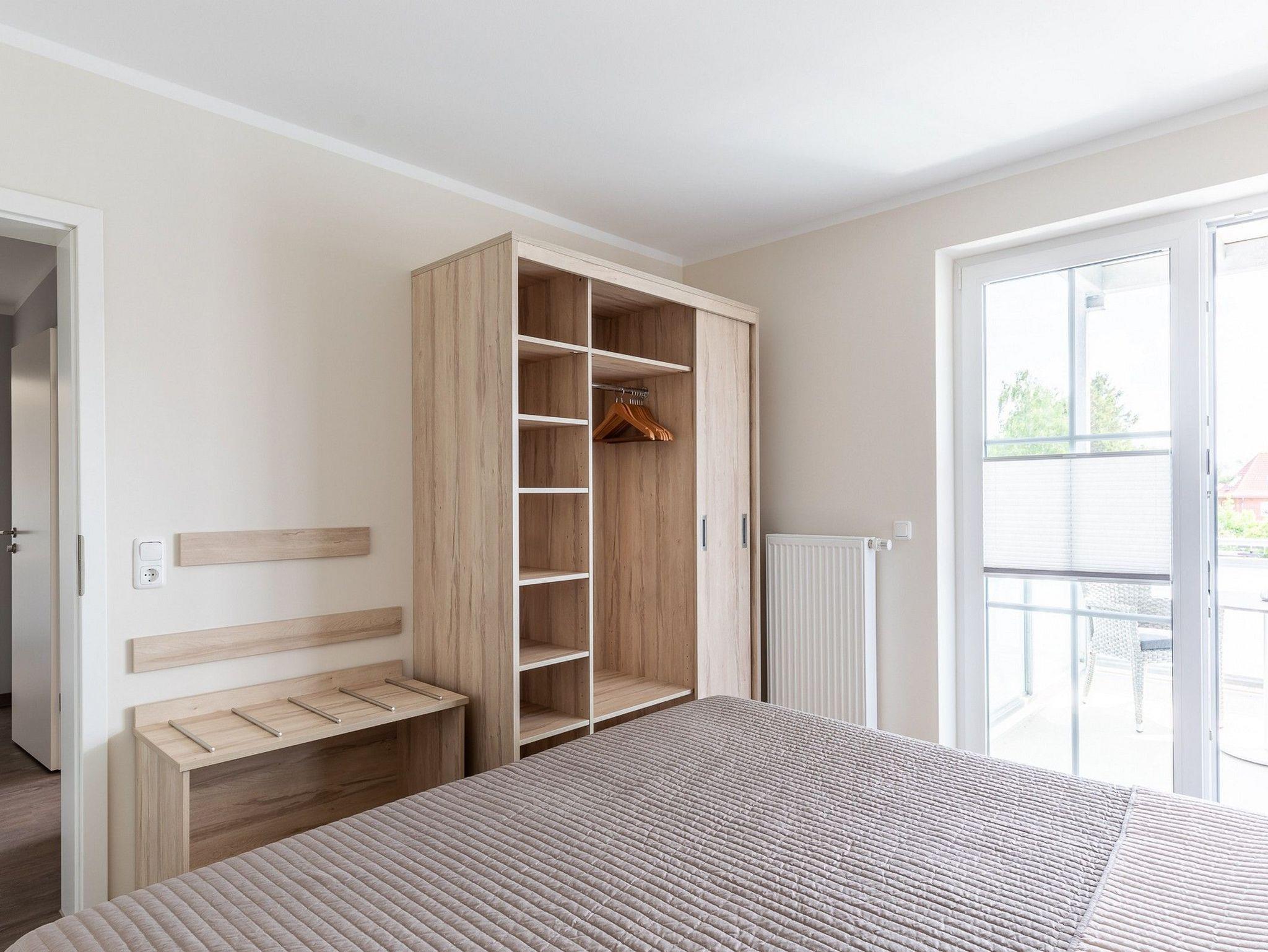 Das Schlafzimmer ist mit einem Doppelbett und einem geräumigen Kleiderschrank ausgestattet. Von hier aus erreichen Sie den zweiten Balkon.