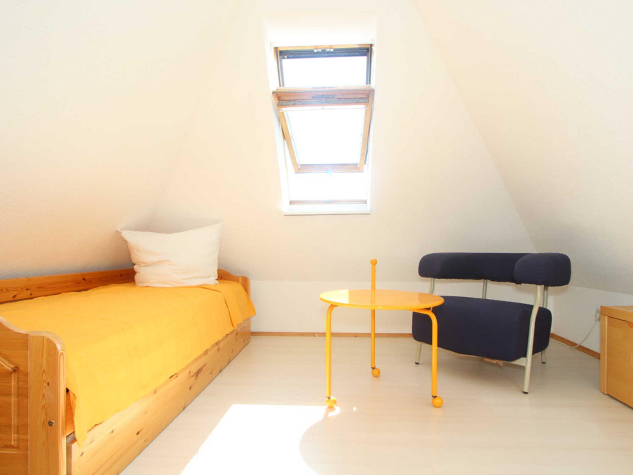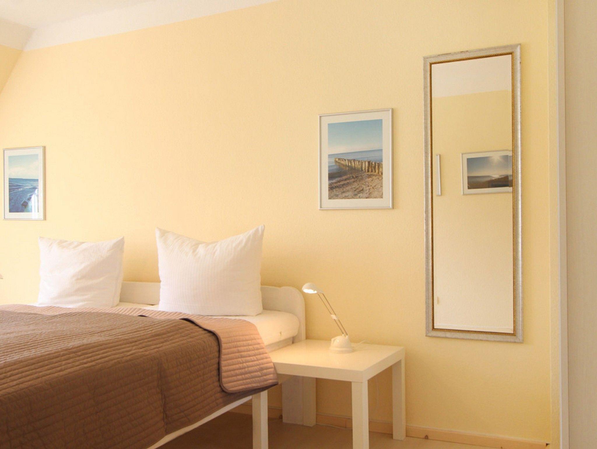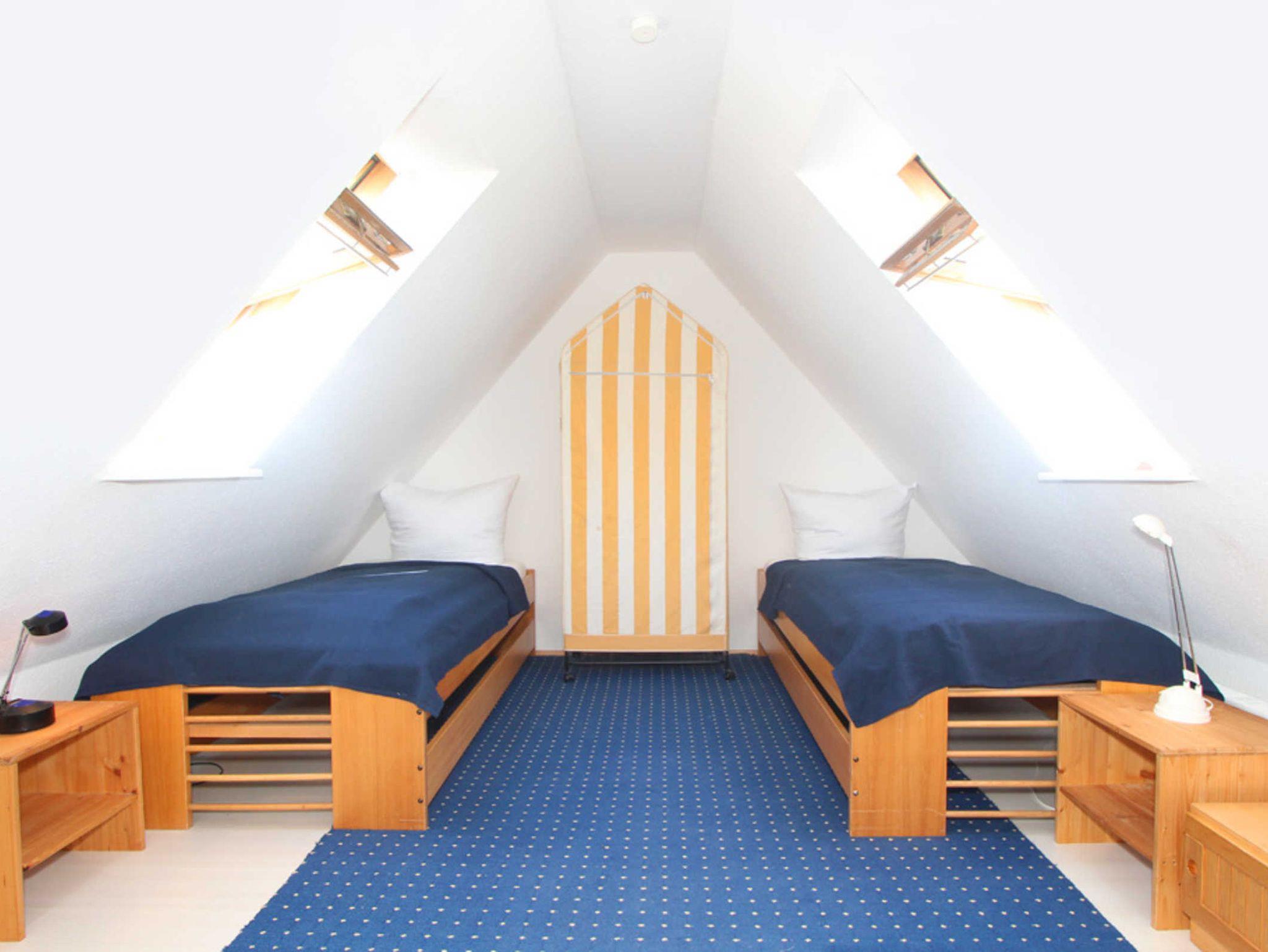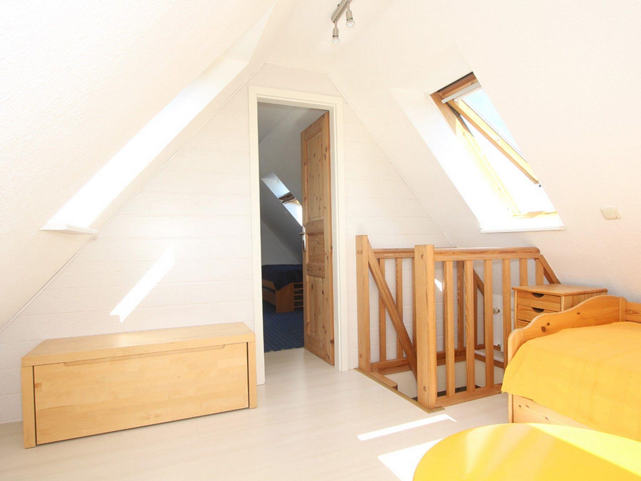 Ebenfalls besitzt die geräumige Ferienwohnung zwei separate Schlafzimmer, von denen das im unteren Bereich der Wohnung mit Doppelbett und das zweite - im Dachgeschoss - mit zwei Einzelbetten ausgestattet ist.