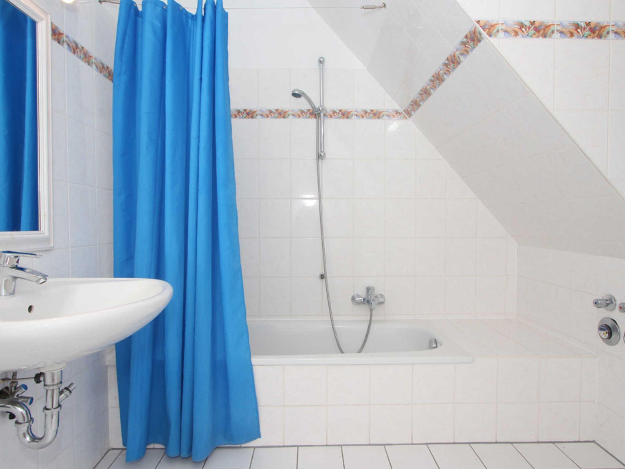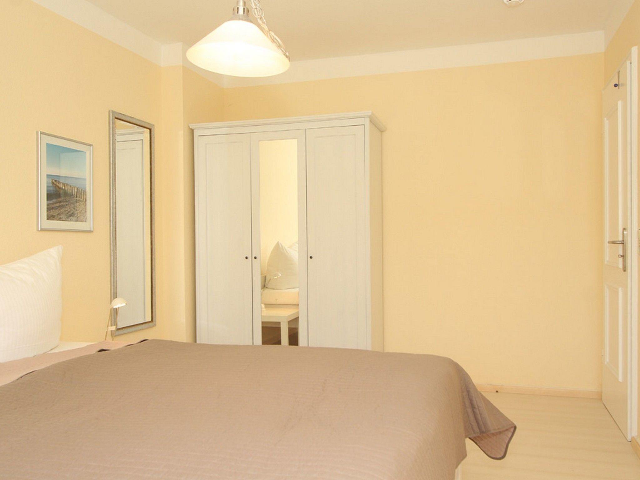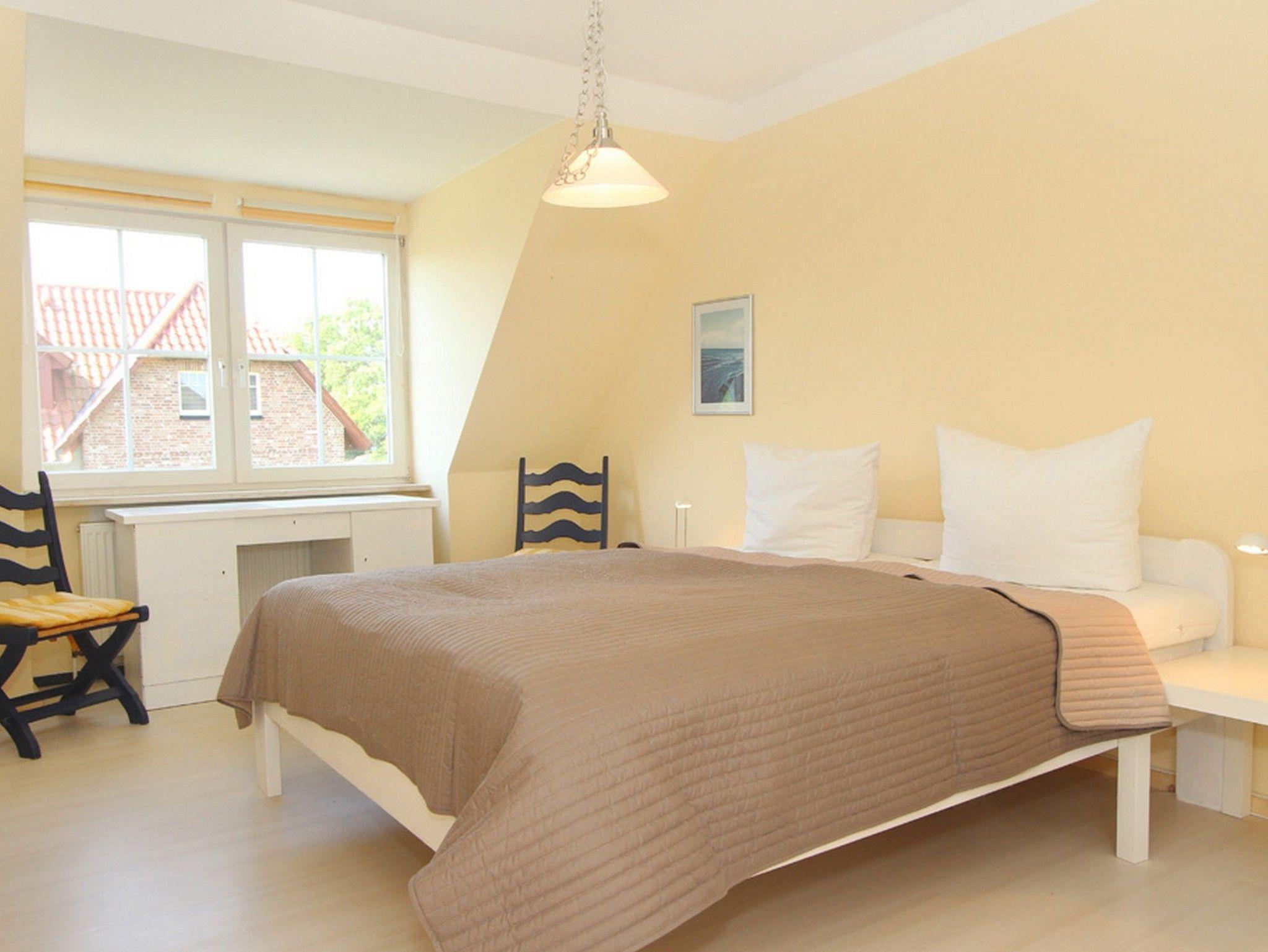 Ebenfalls besitzt die geräumige Ferienwohnung zwei separate Schlafzimmer, von denen das im unteren Bereich der Wohnung mit Doppelbett und das zweite - im Dachgeschoss - mit zwei Einzelbetten ausgestattet ist.