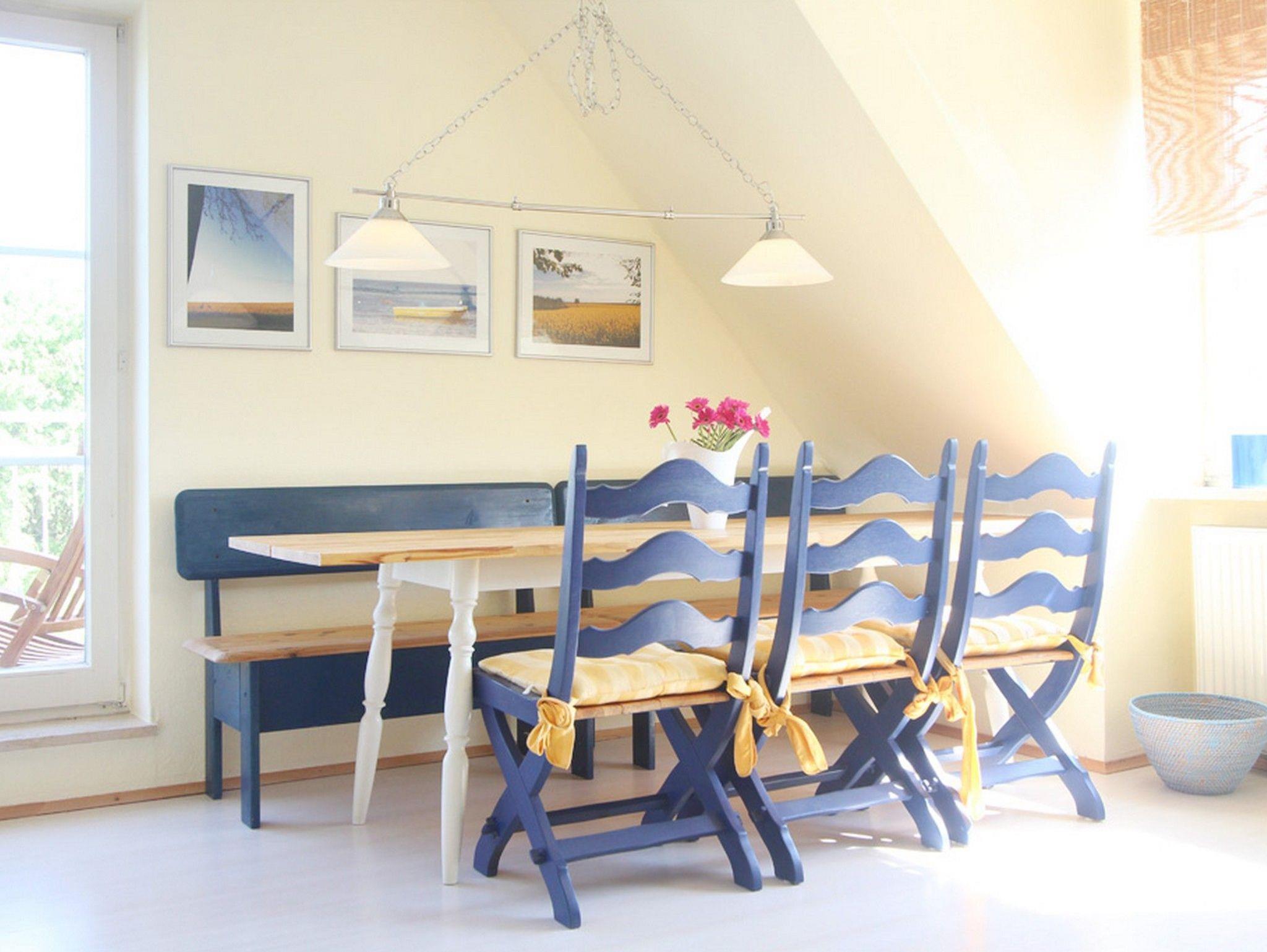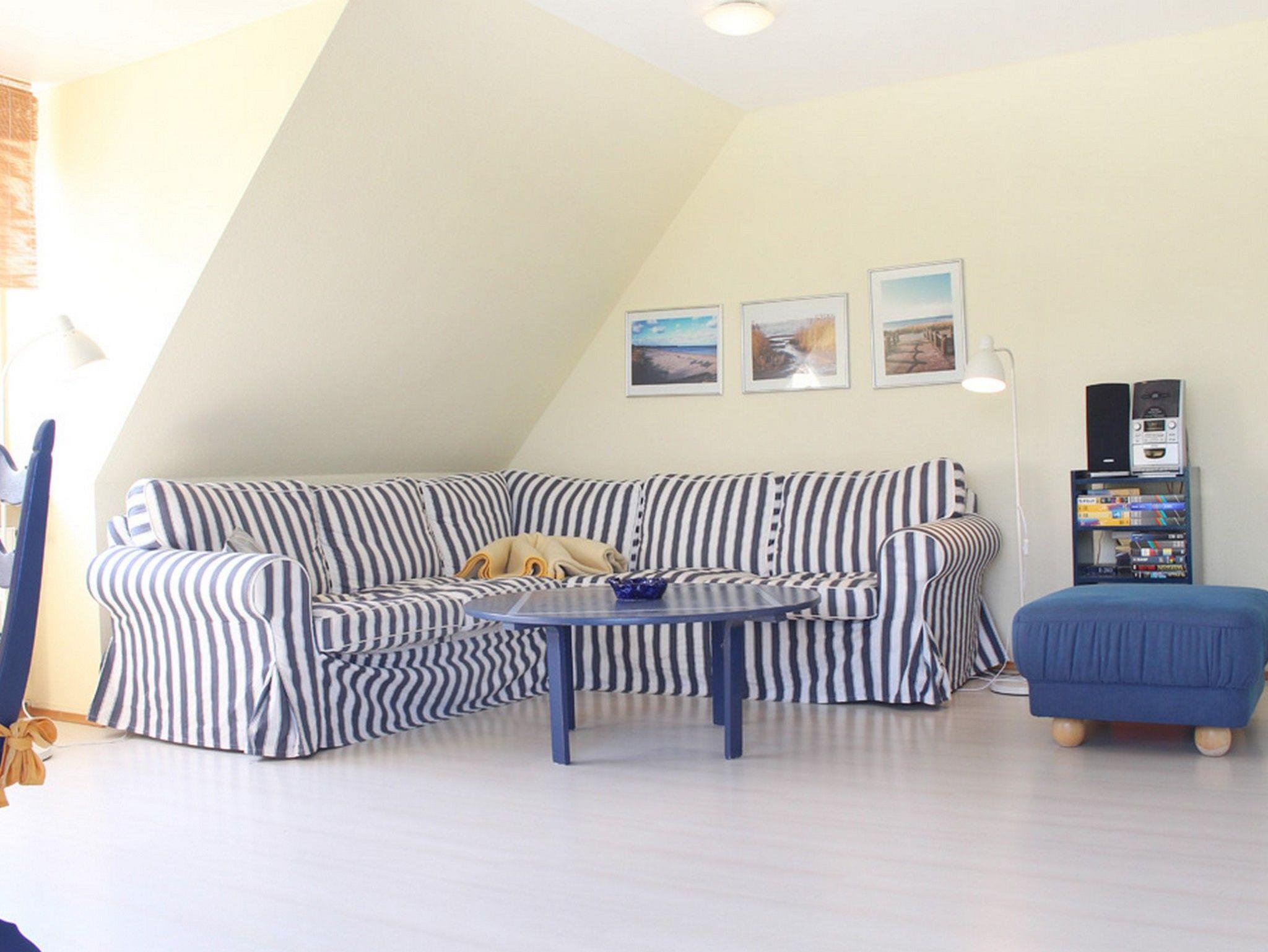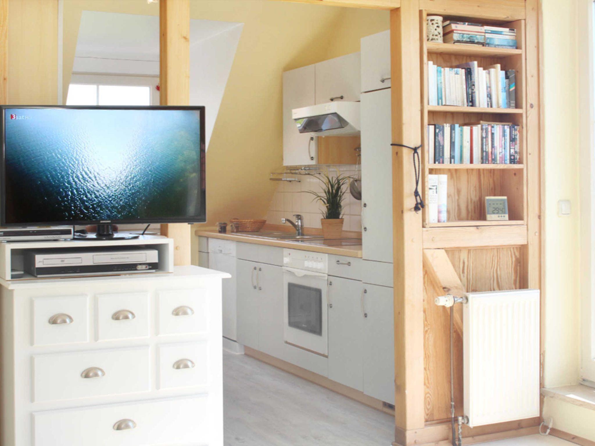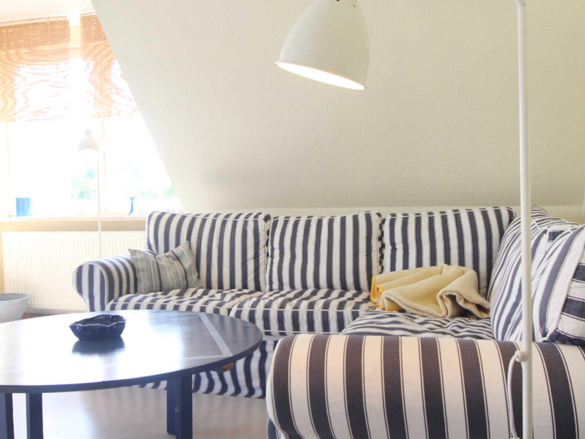 Ebenfalls besitzt die geräumige Ferienwohnung zwei separate Schlafzimmer, von denen das im unteren Bereich der Wohnung mit Doppelbett und das zweite - im Dachgeschoss - mit zwei Einzelbetten ausgestattet ist.