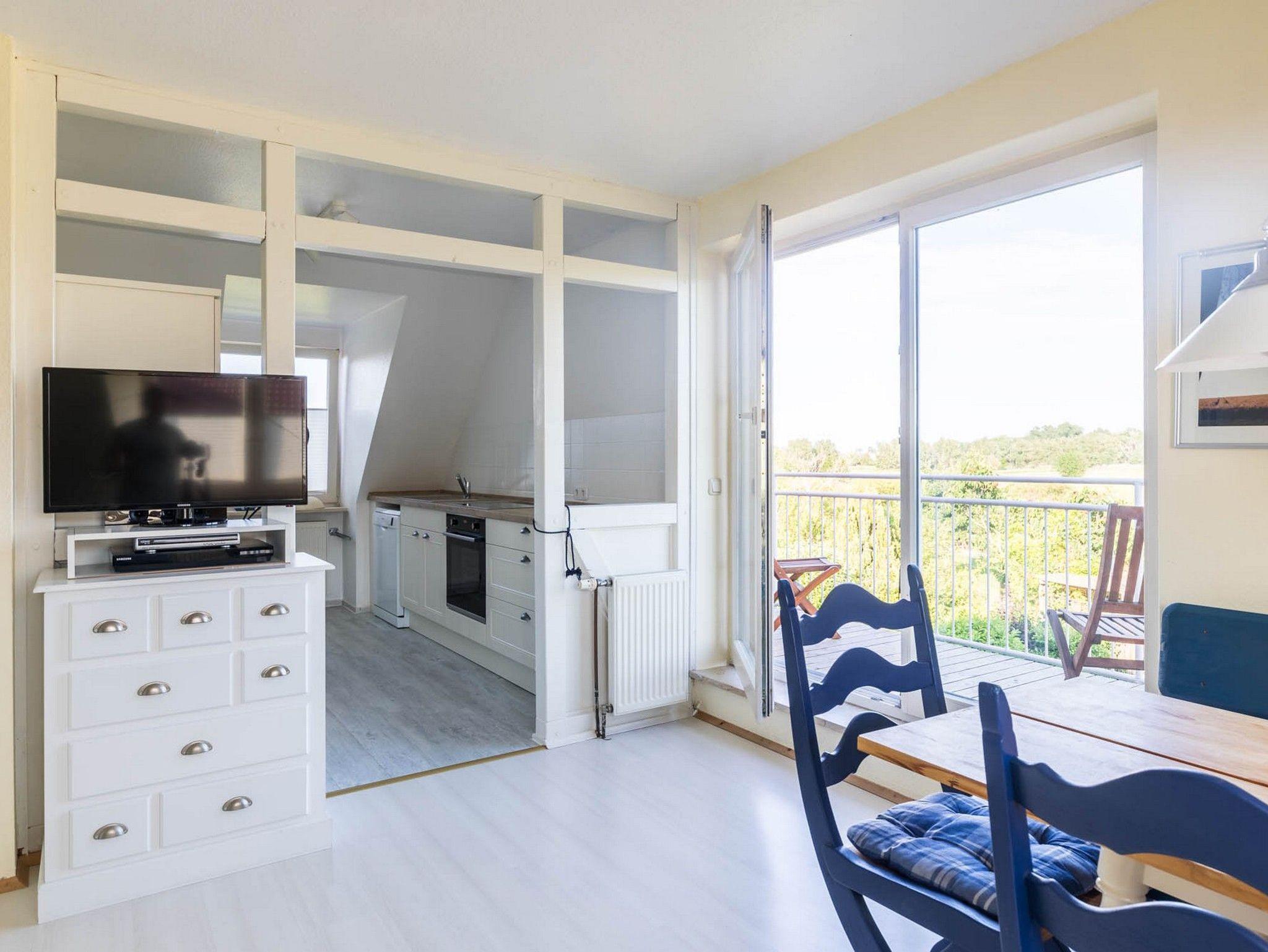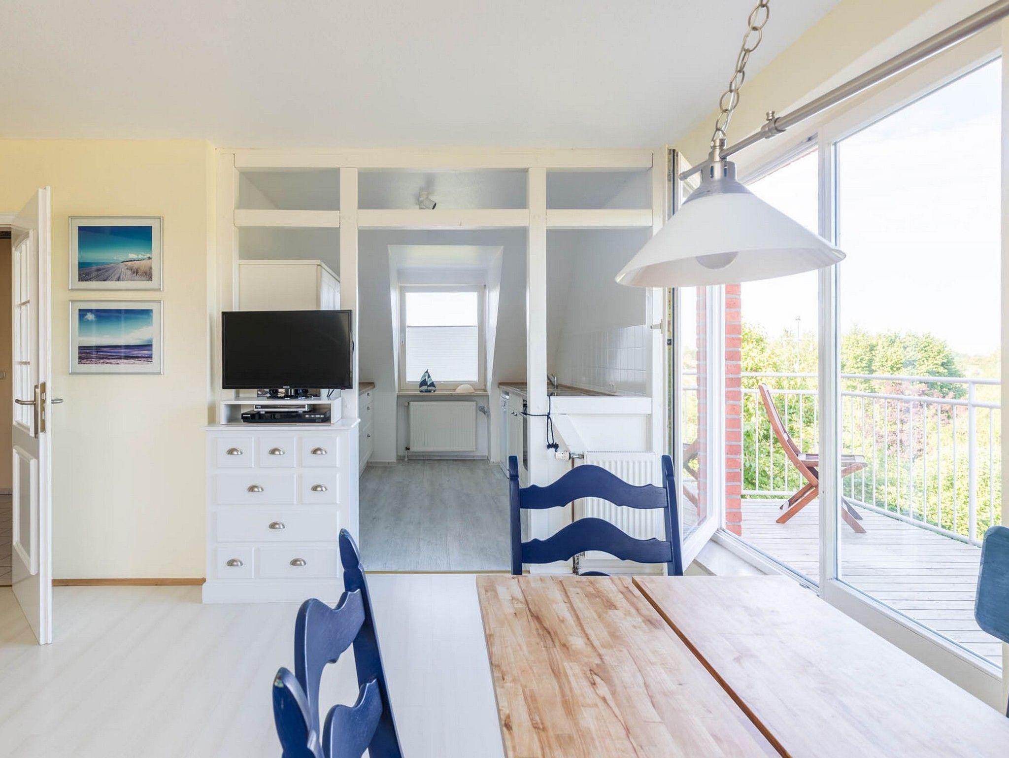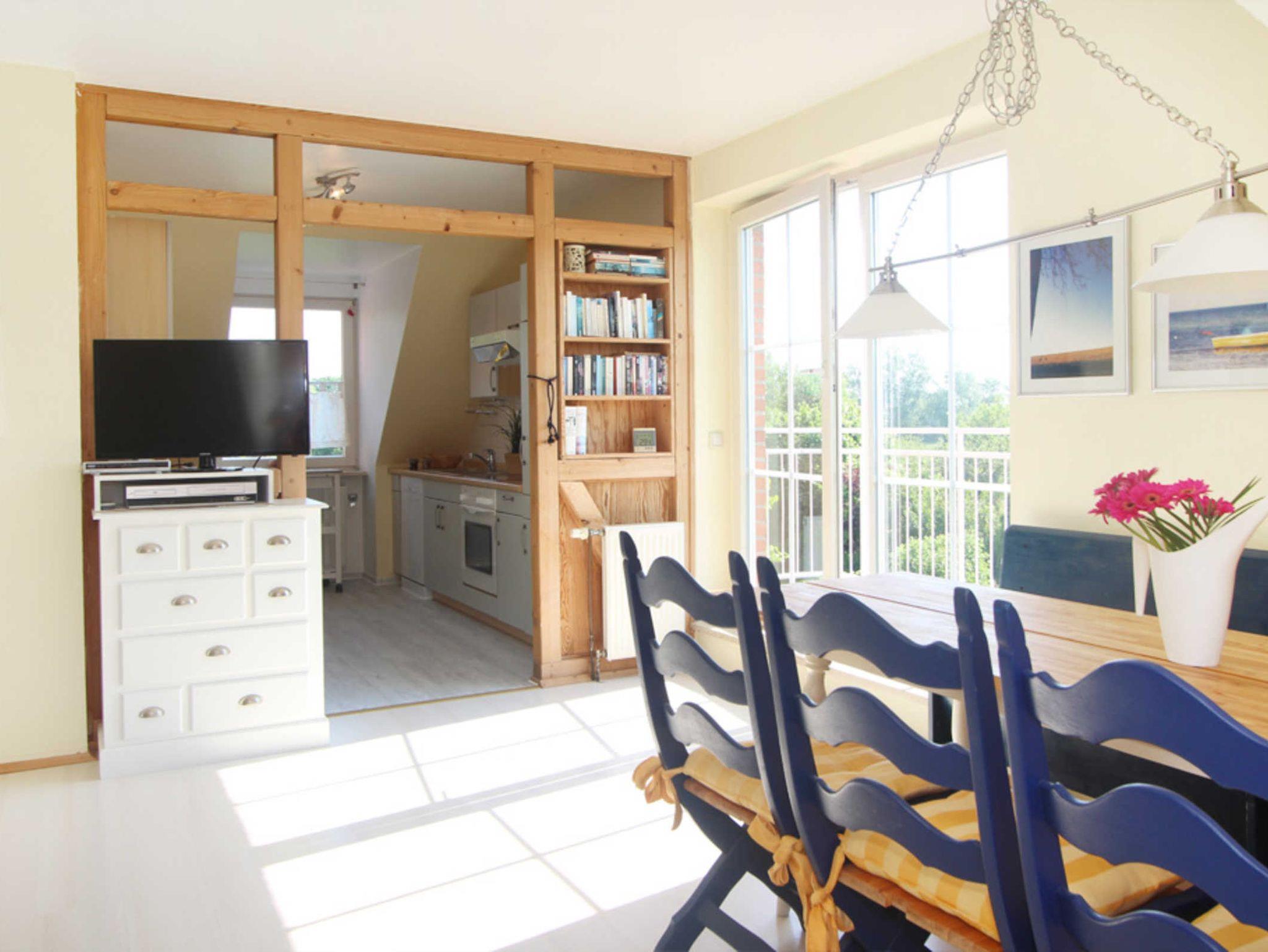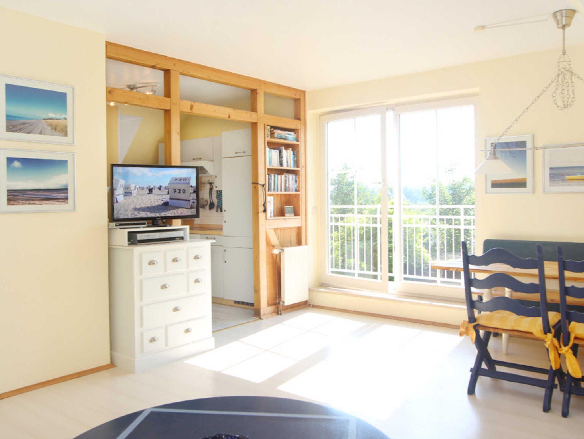 Im offenen Wohn-/Essbereich im im unteren Bereich gehören SAT-TV und Stereoanlage zur Grundausstattung. Von hier aus gelangen Sie auch auf den möblierten Balkon mit herrlichem Ausblick ins Grüne.