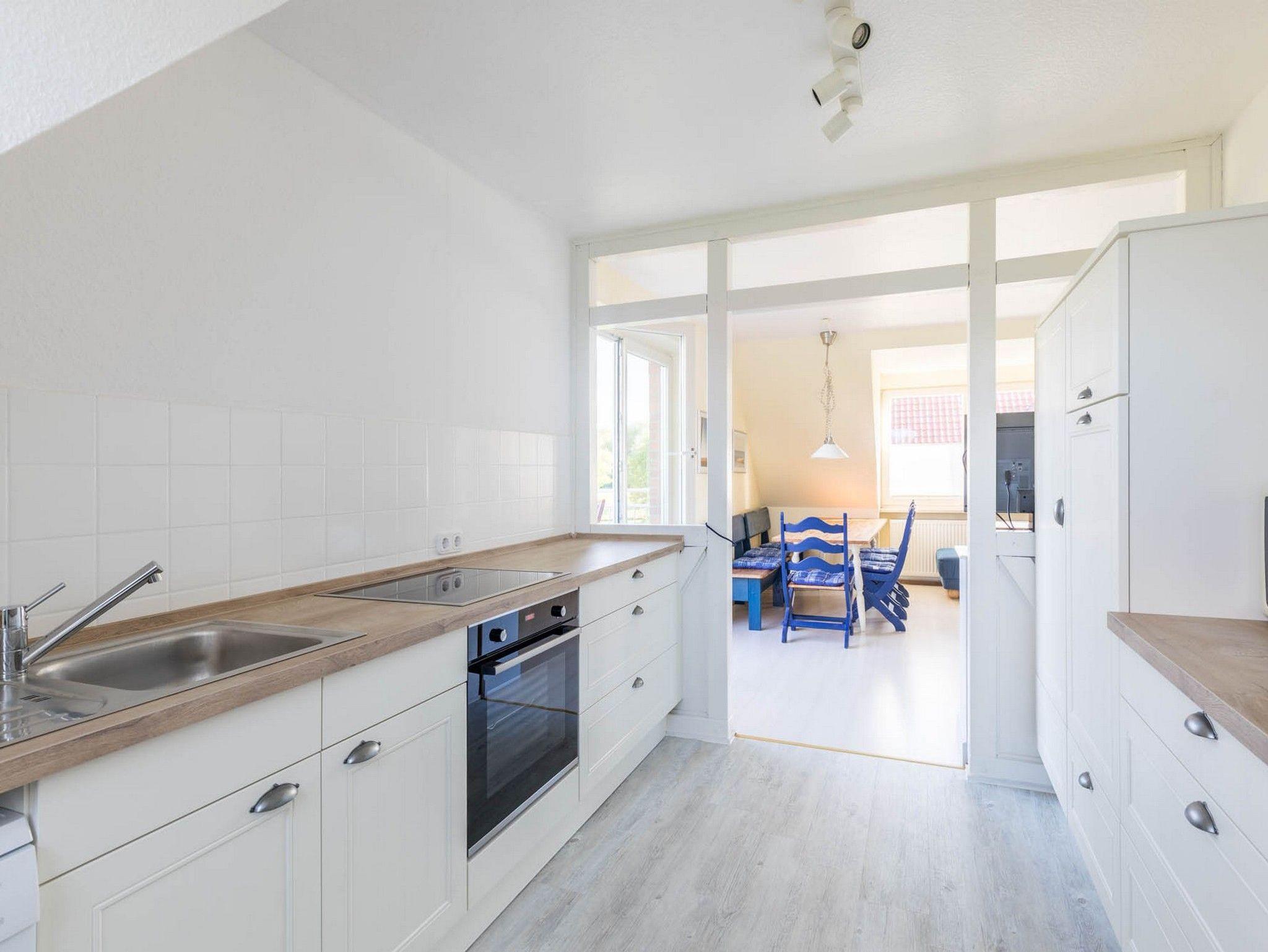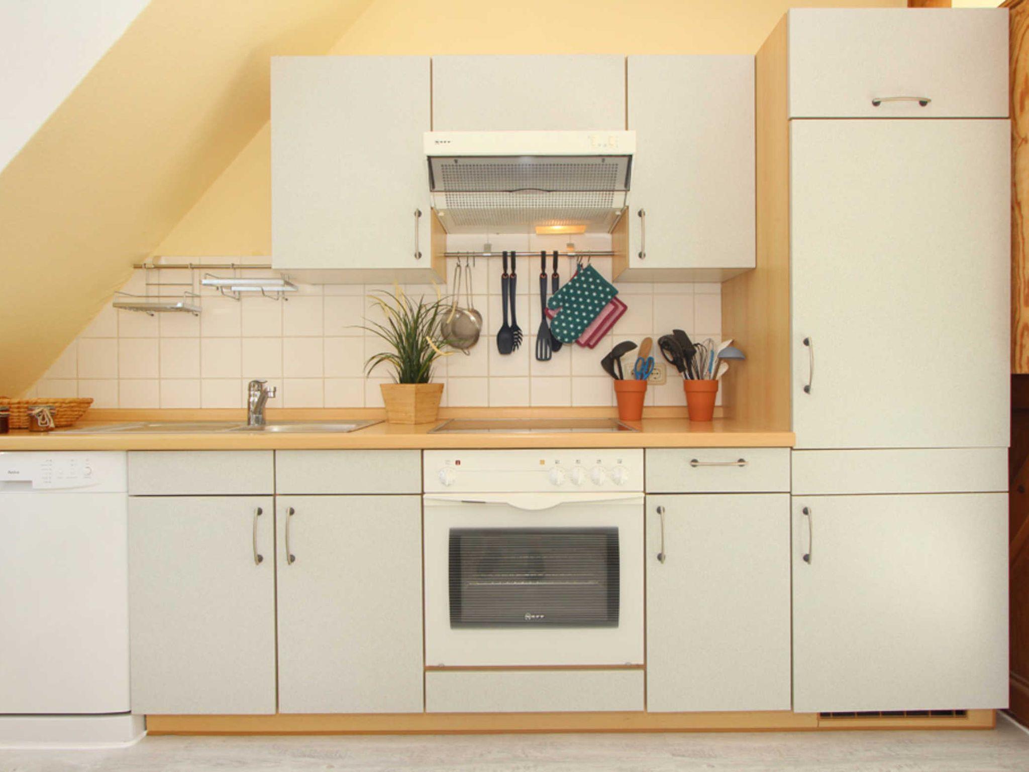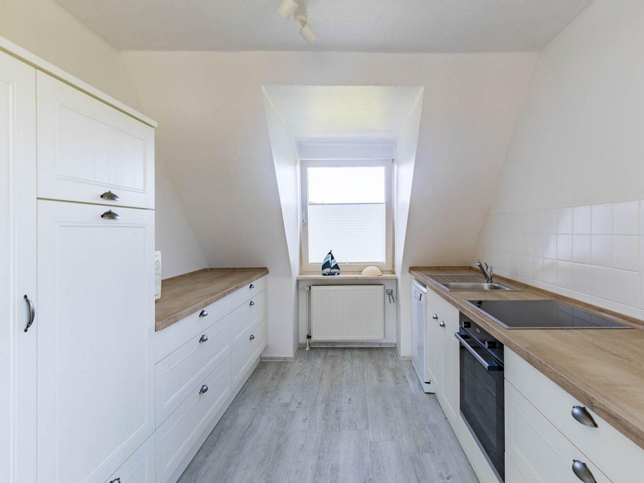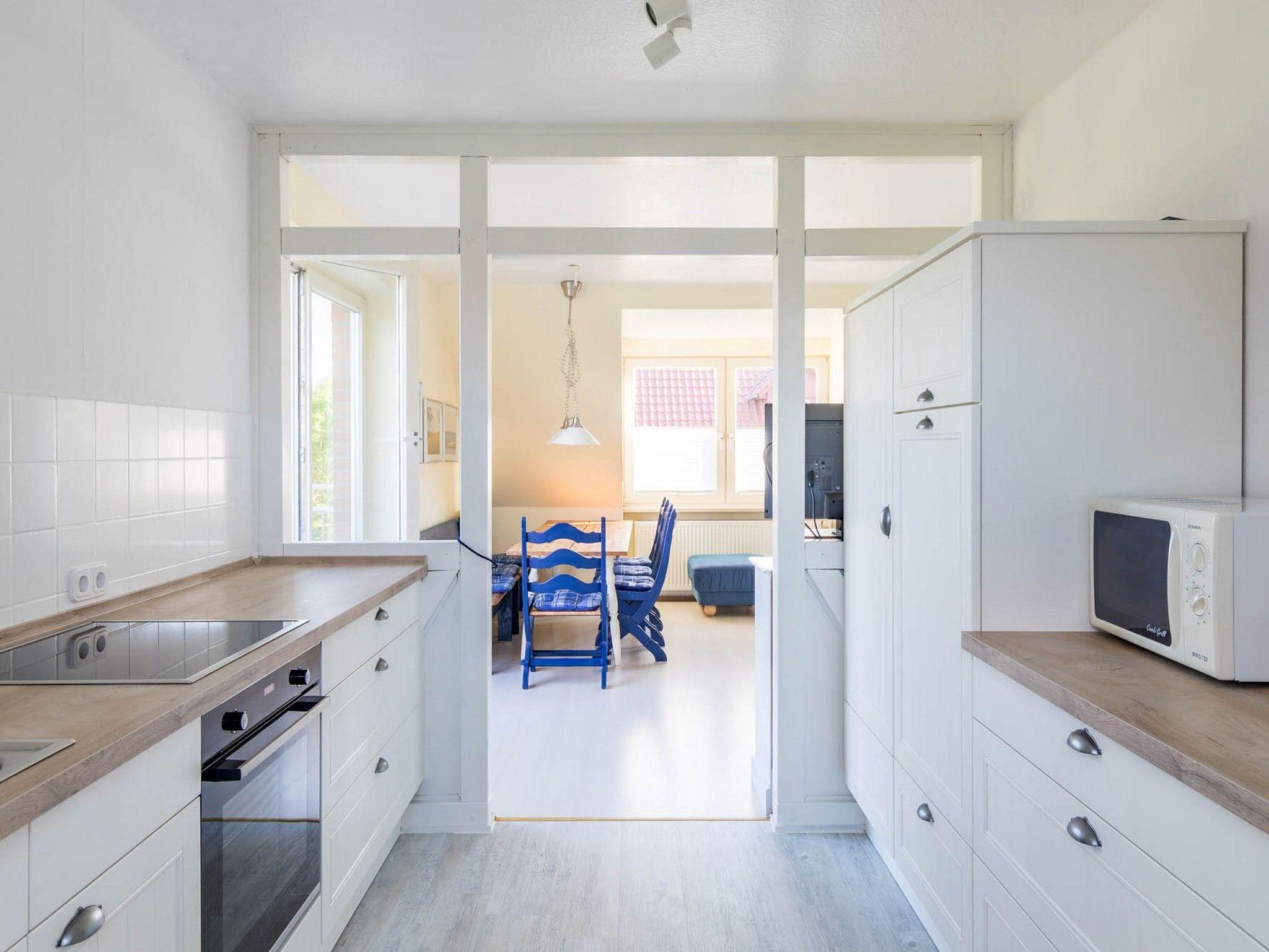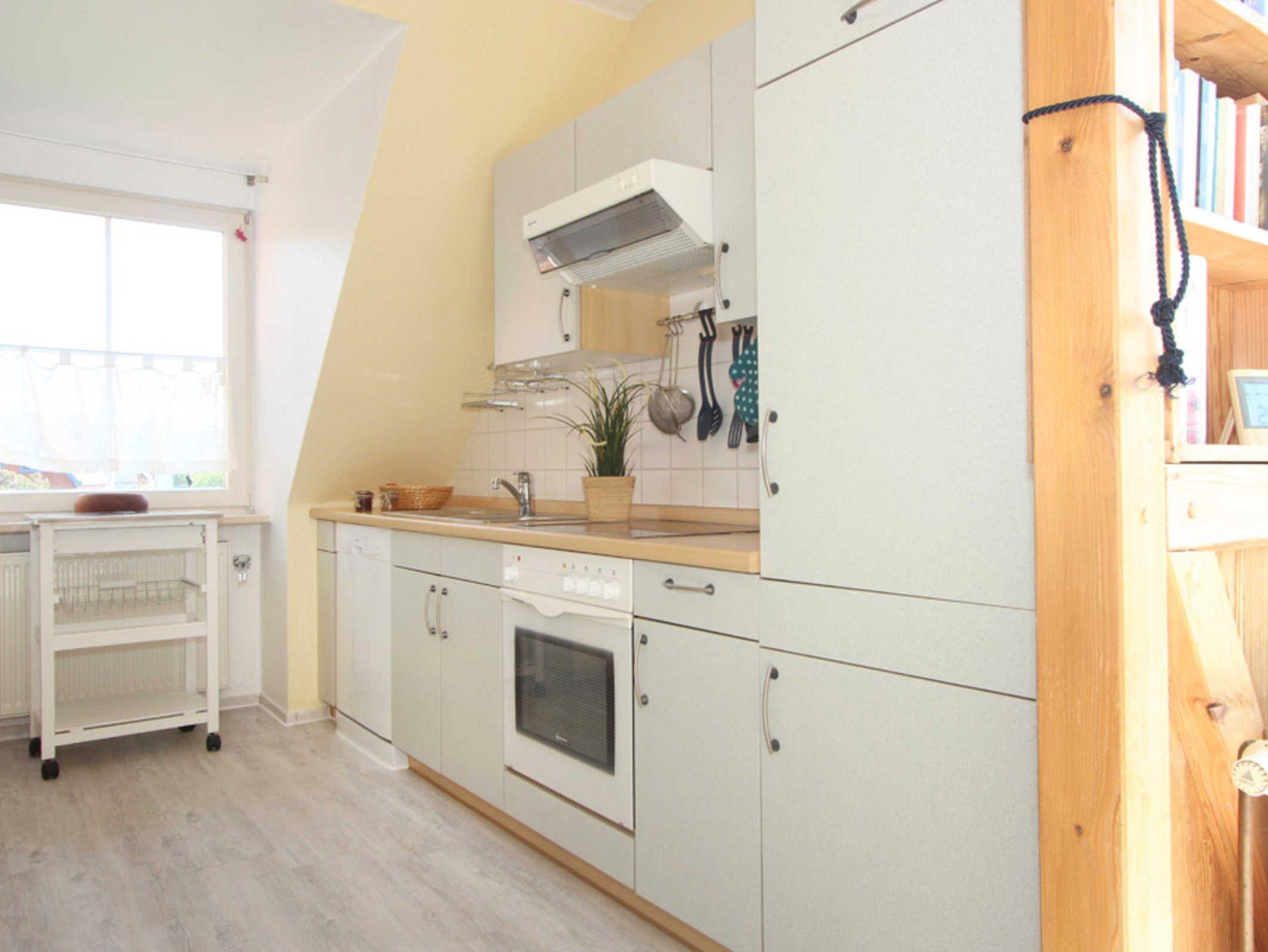 Die gut eingerichtete Küche lässt keinerlei Wünsche offen. Eine praktische Spülmaschine ist genauso vorhanden wie Mikrowelle oder Herd mit Induktionskochfeld und Backofen.