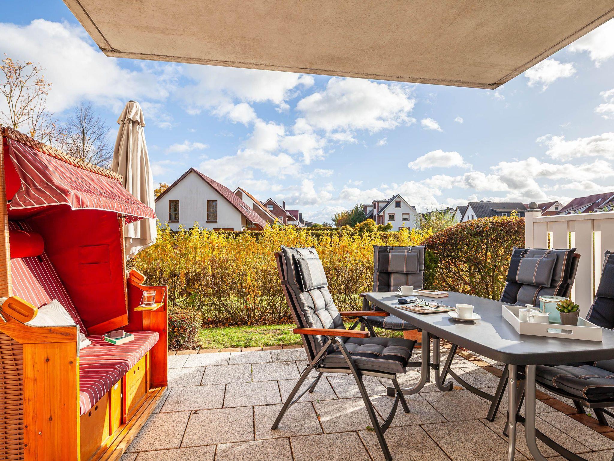 Gemütliche Ferienwohnung Strandidylle in Boltenhagen, nur 200 m vom Strand entfernt, ideal für erholsamen Urlaub mit Terrasse und Fahrradraum.