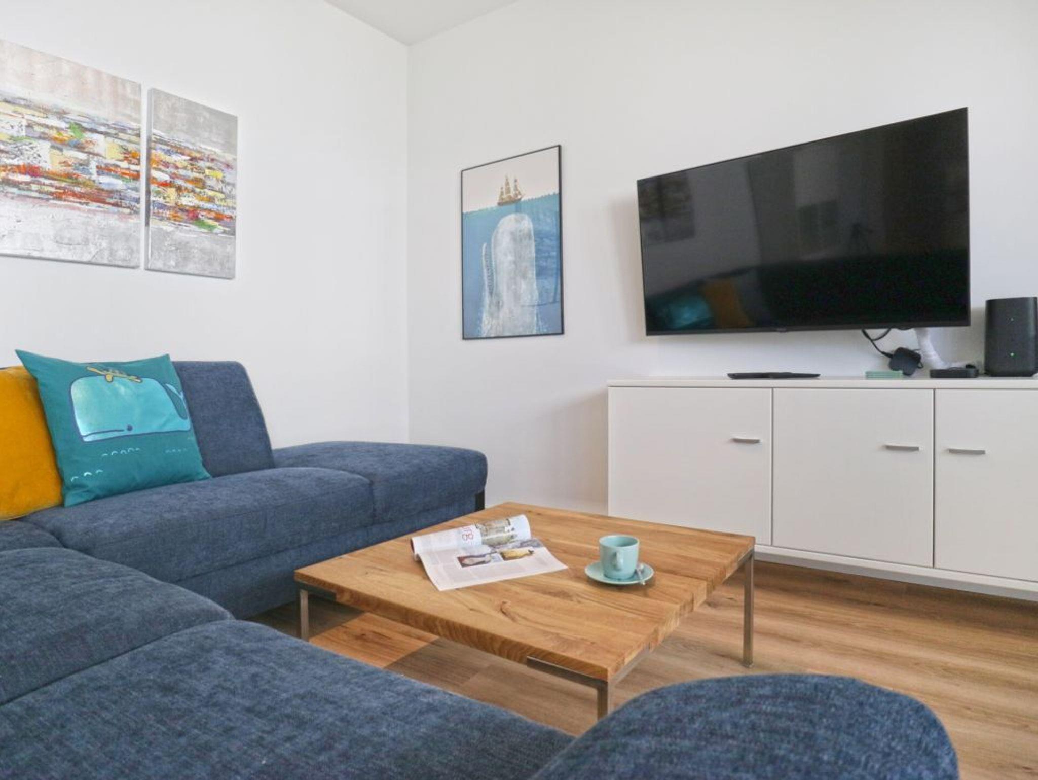 Der komfortabel möblierte Wohn-/Essbereich ist mit einem Komfortsofa, Beistelltisch, Fernseher und Musikanlage ausgestattet und lädt mit maritimen Deko-Elementen zur stilvollen Auszeit ein.