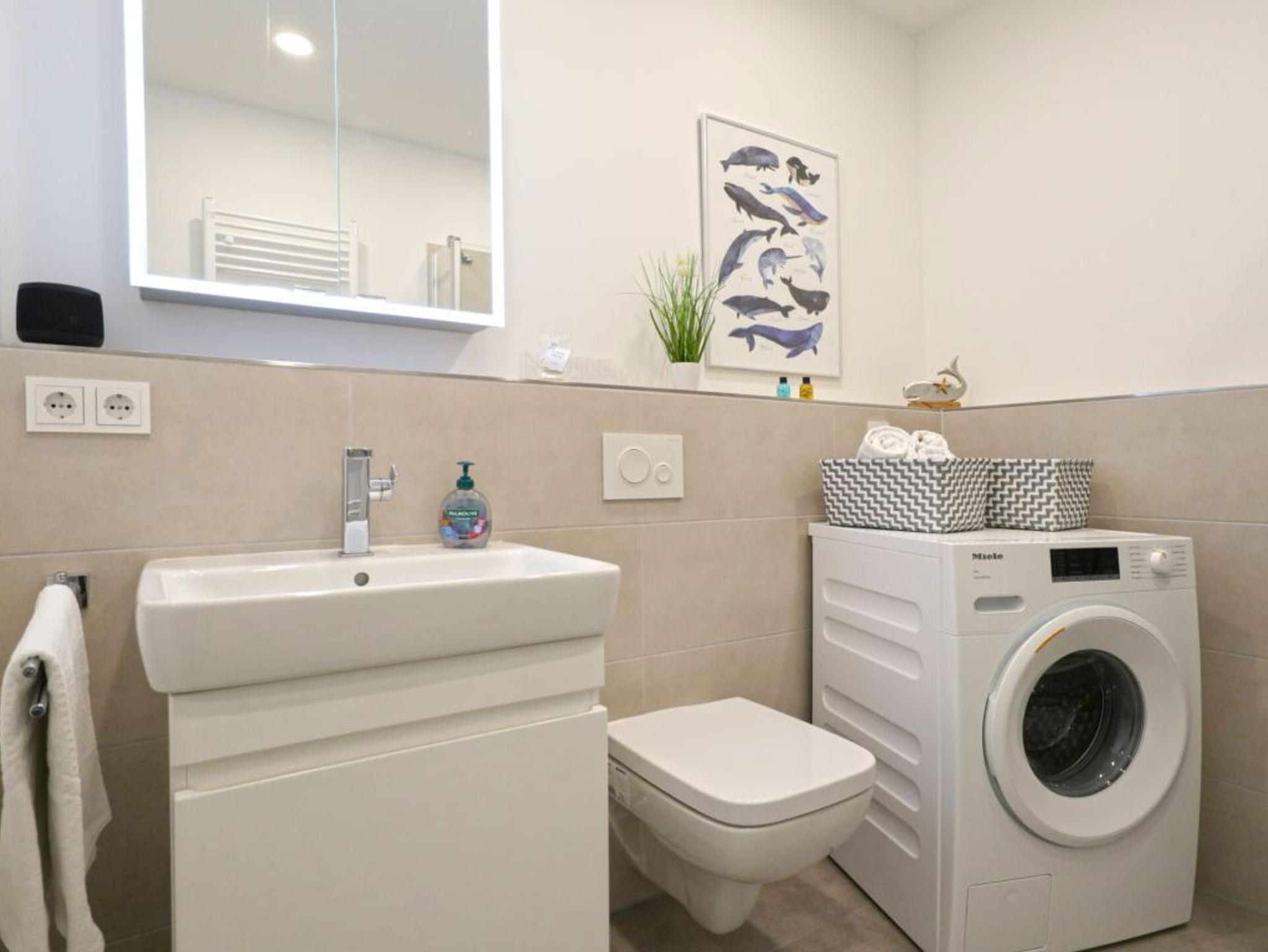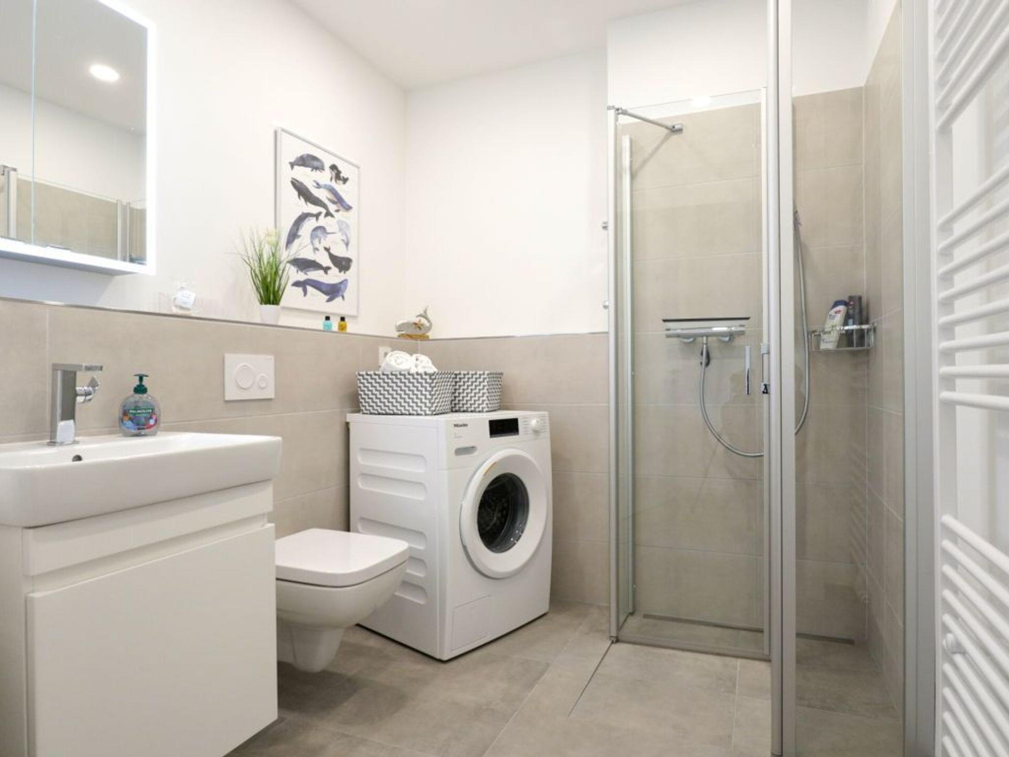 Zur Wohnung gehört ein modernes Badezimmer, in dem sich eine ebenerdige Dusche, Waschtisch, Waschtischunterschrank, WC sowie Handtuchheizung und eine Waschmaschine zur kostenfreien Nutzung befinden.