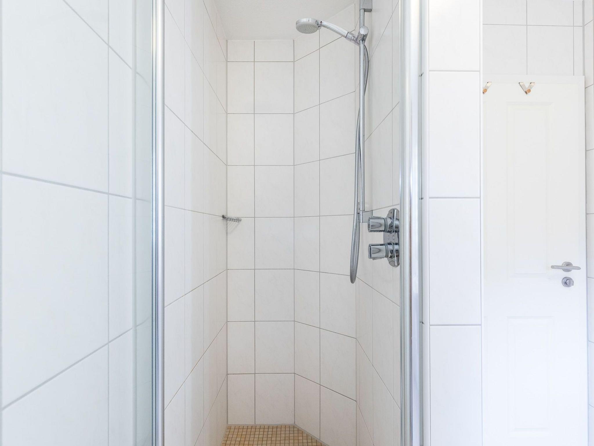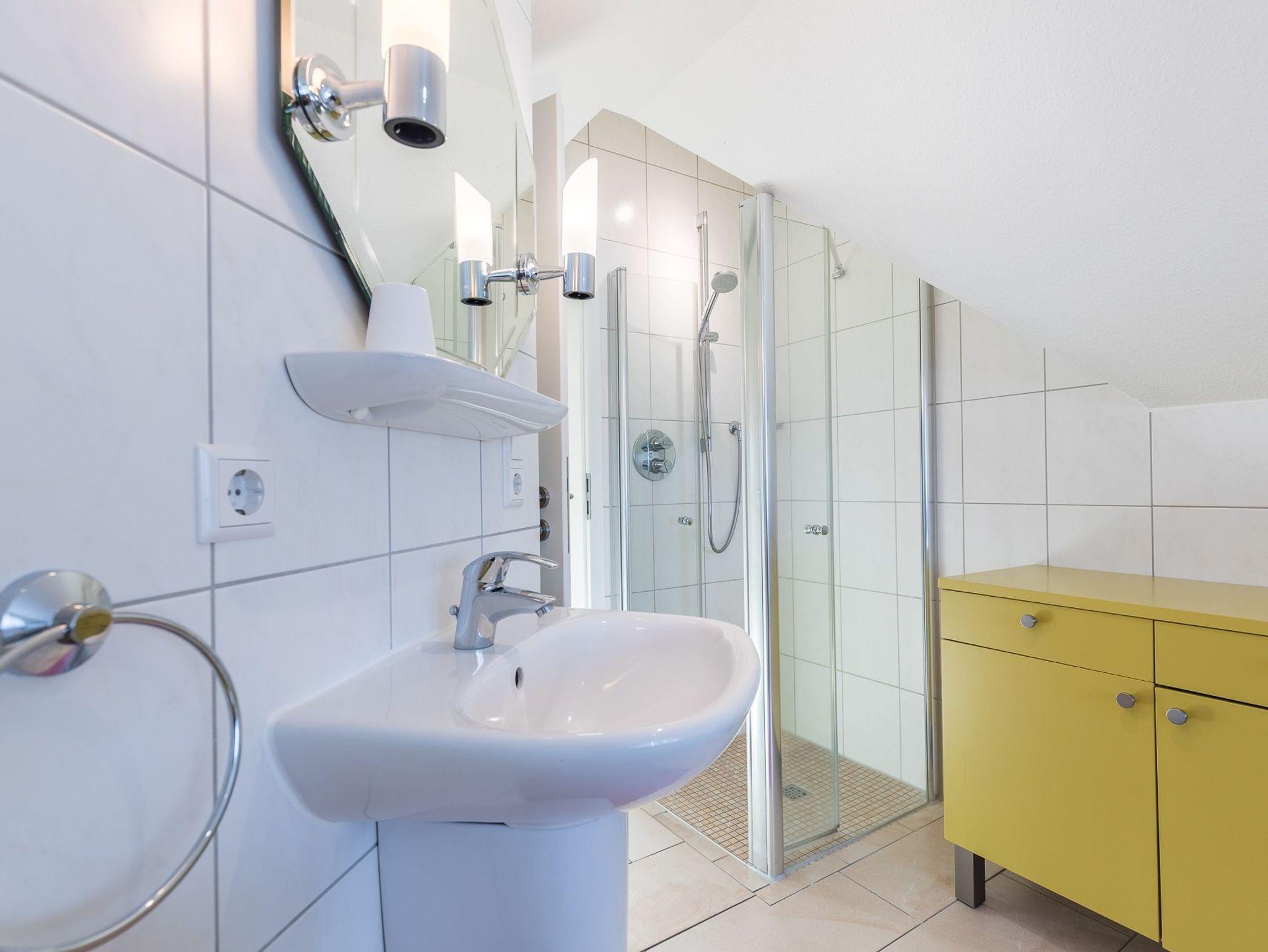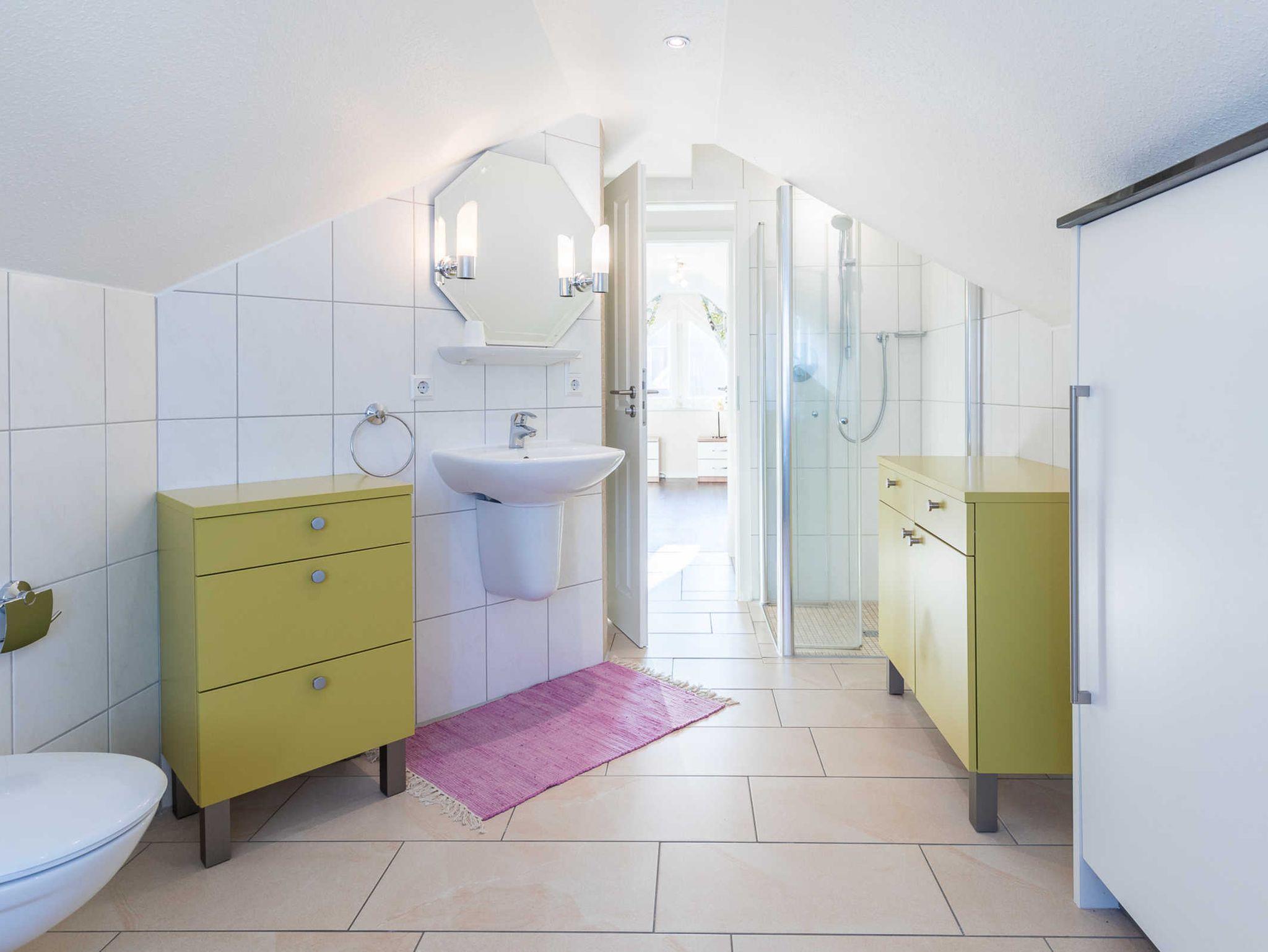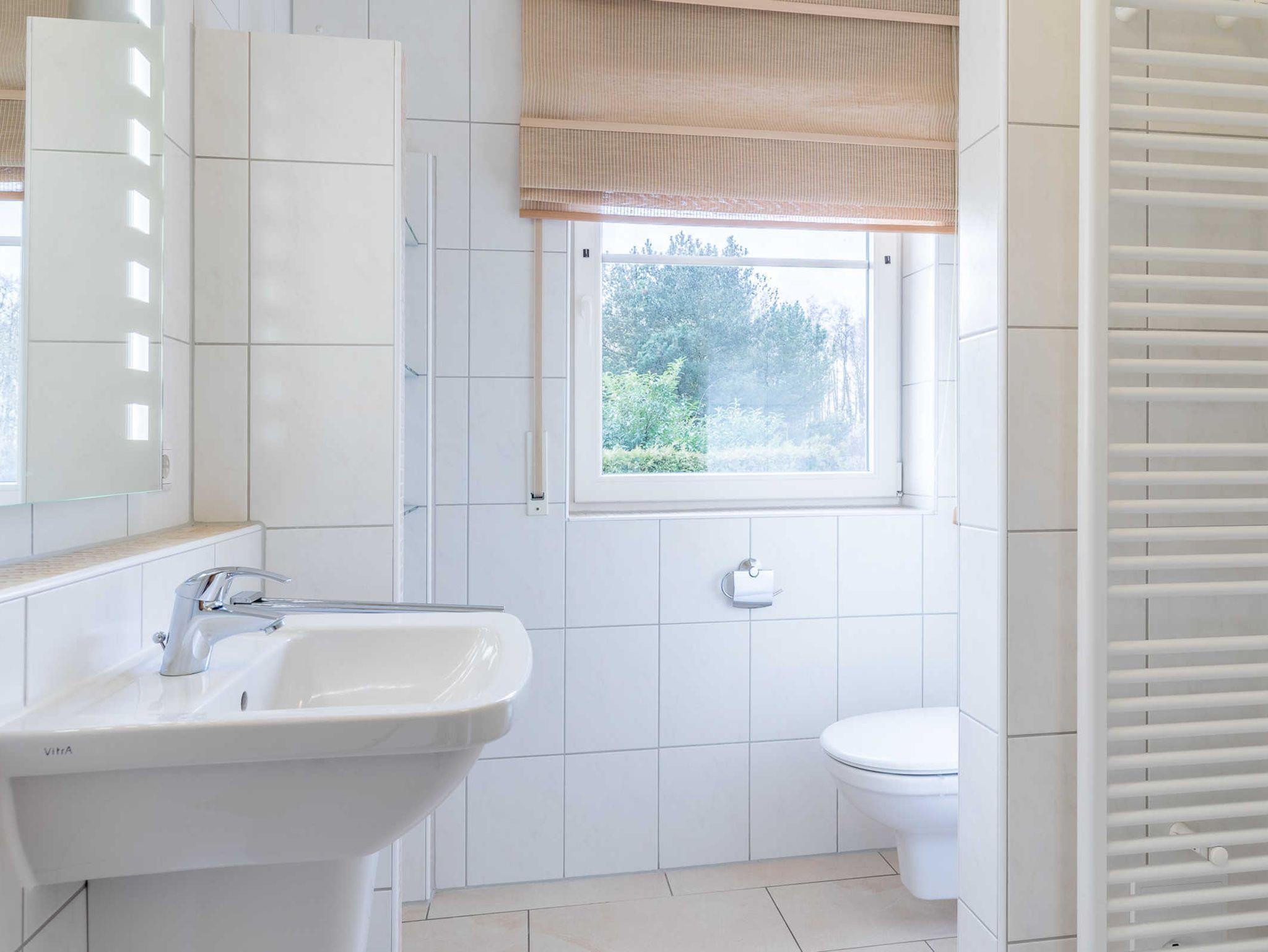 Weiterhin finden Sie auf dieser Ebene eines der zwei Bäder. Es ist hell und modern gefliest, verfügt über ein Fenster und bietet eine ebenerdige Dusche sowie WC und ein Waschbecken.