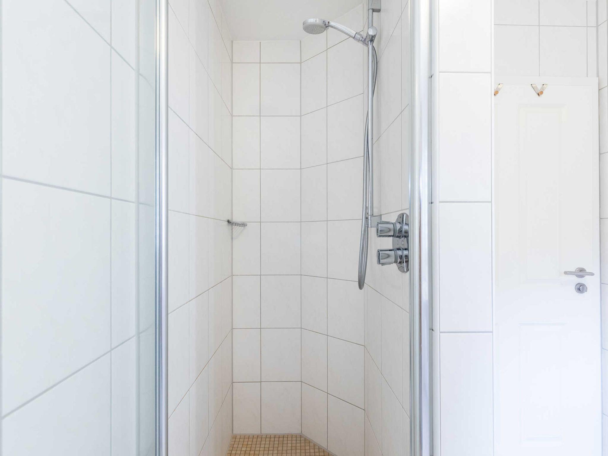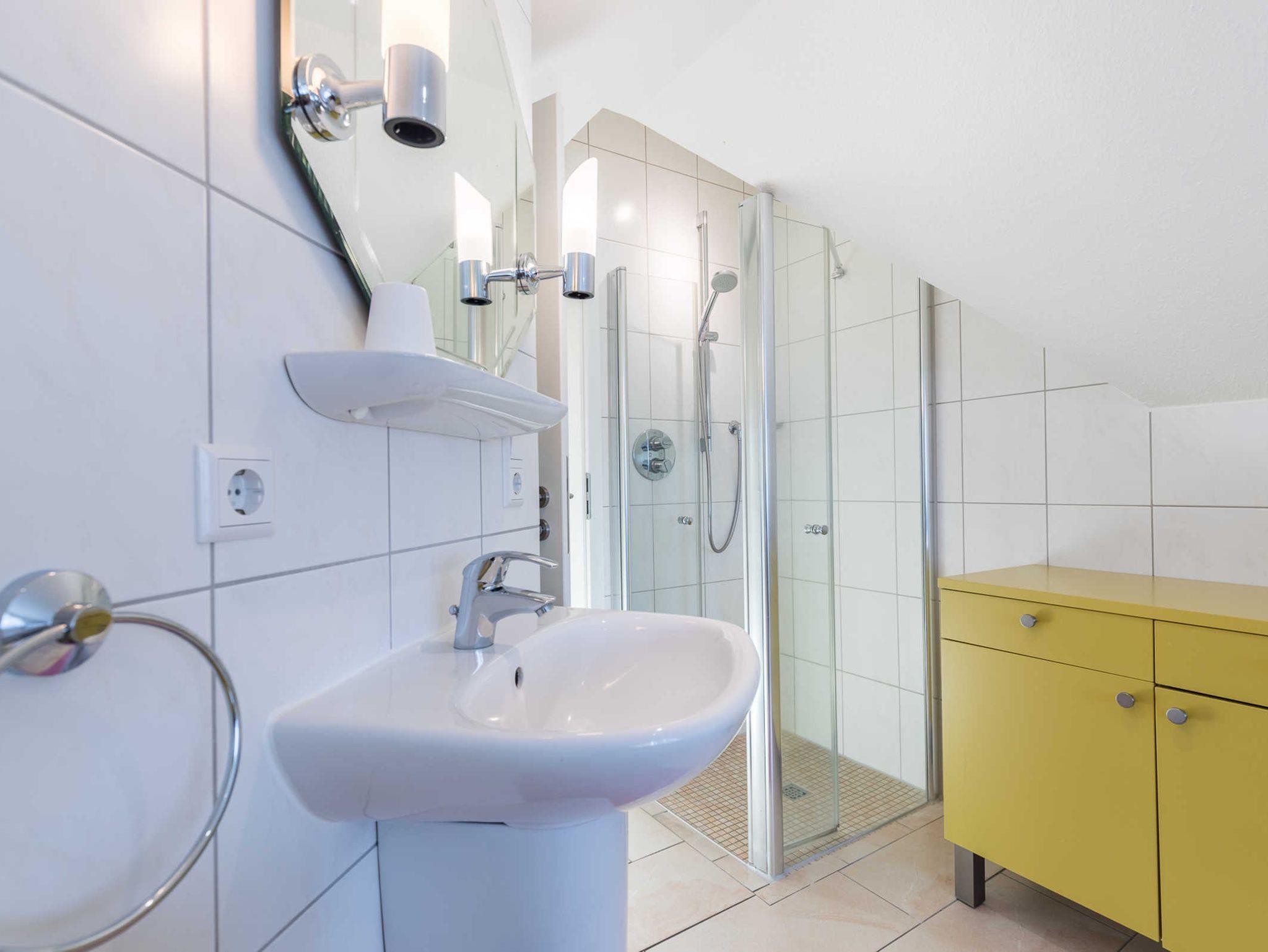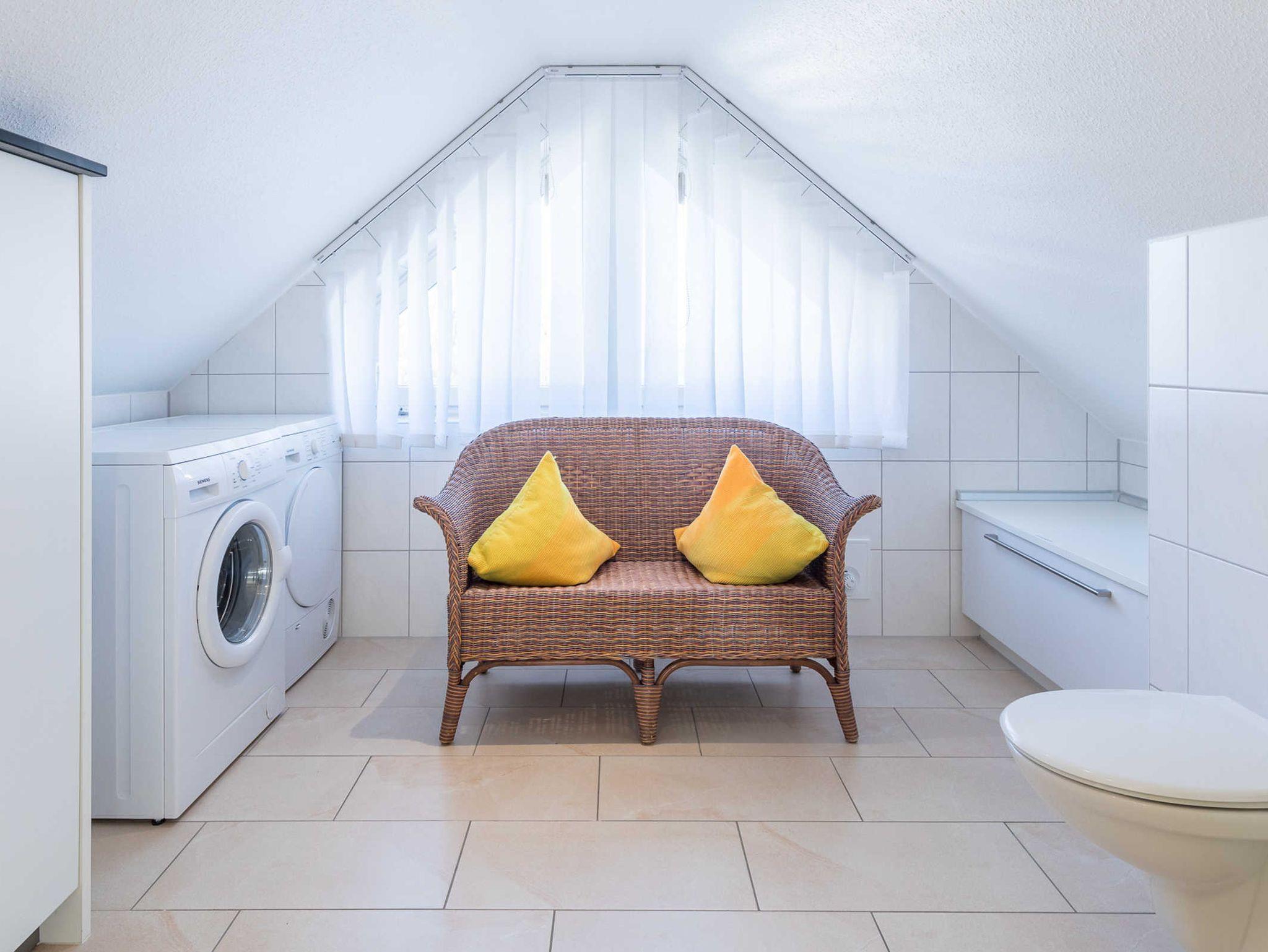 In dem zweiten, großzügigen und hellen Badezimmer finden Sie außer einer ebenfalls bodengleichen Dusche und WC auch eine Waschmaschine sowie einen Trockner vor (nutzbar gegen Münze).