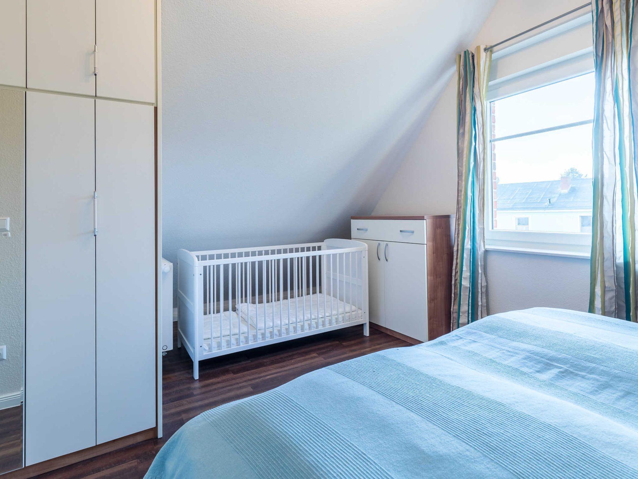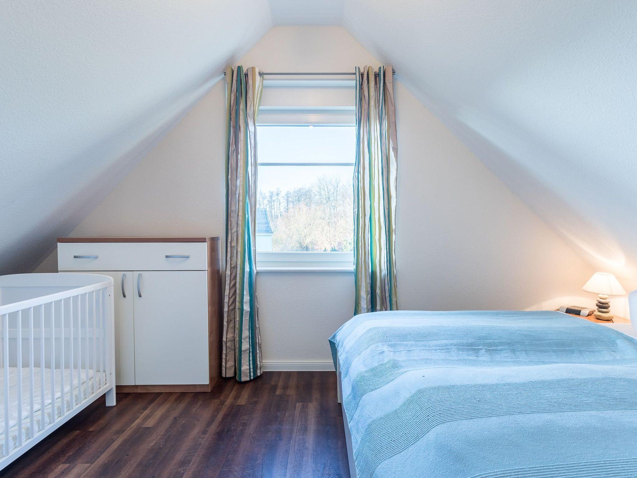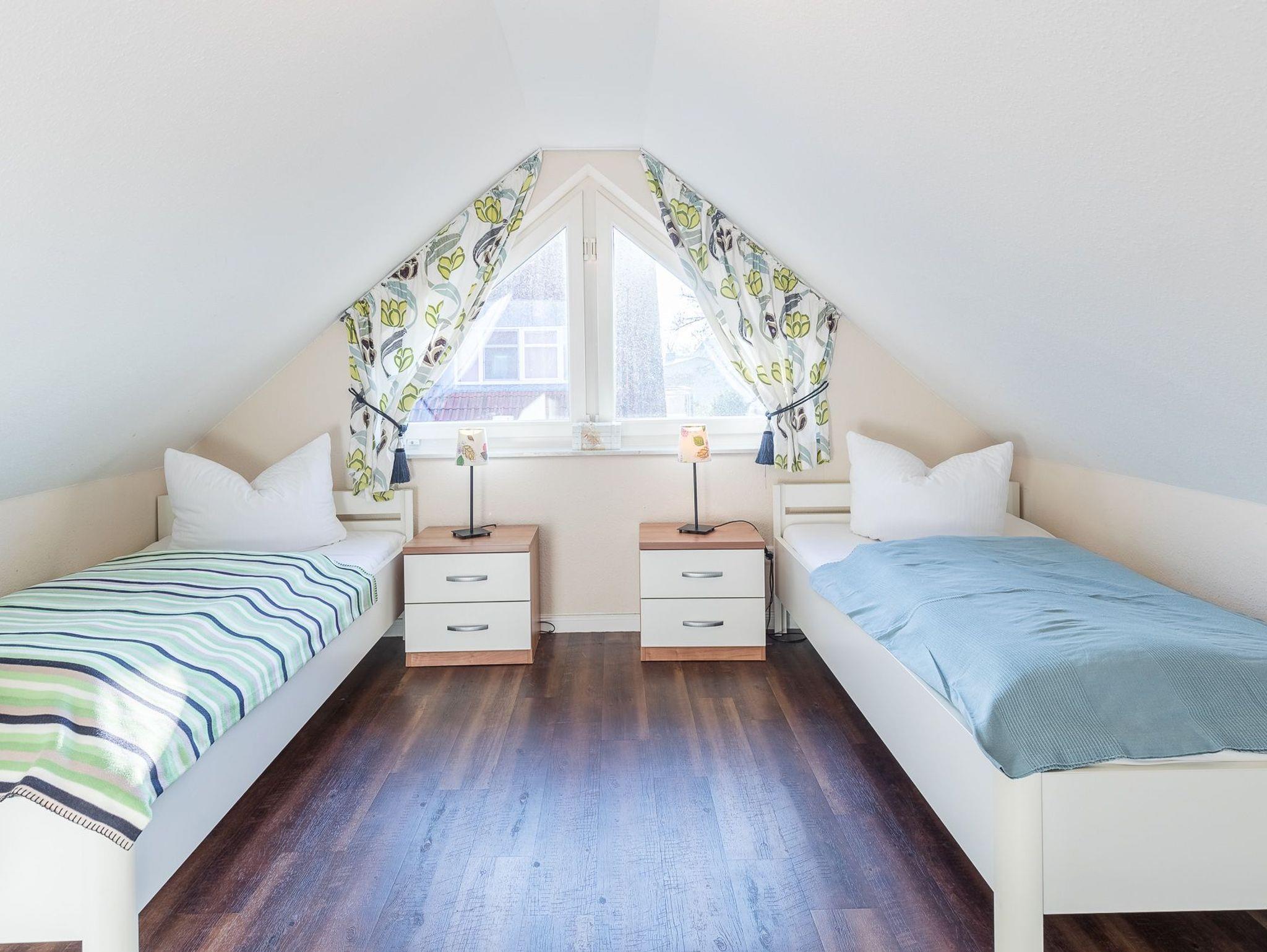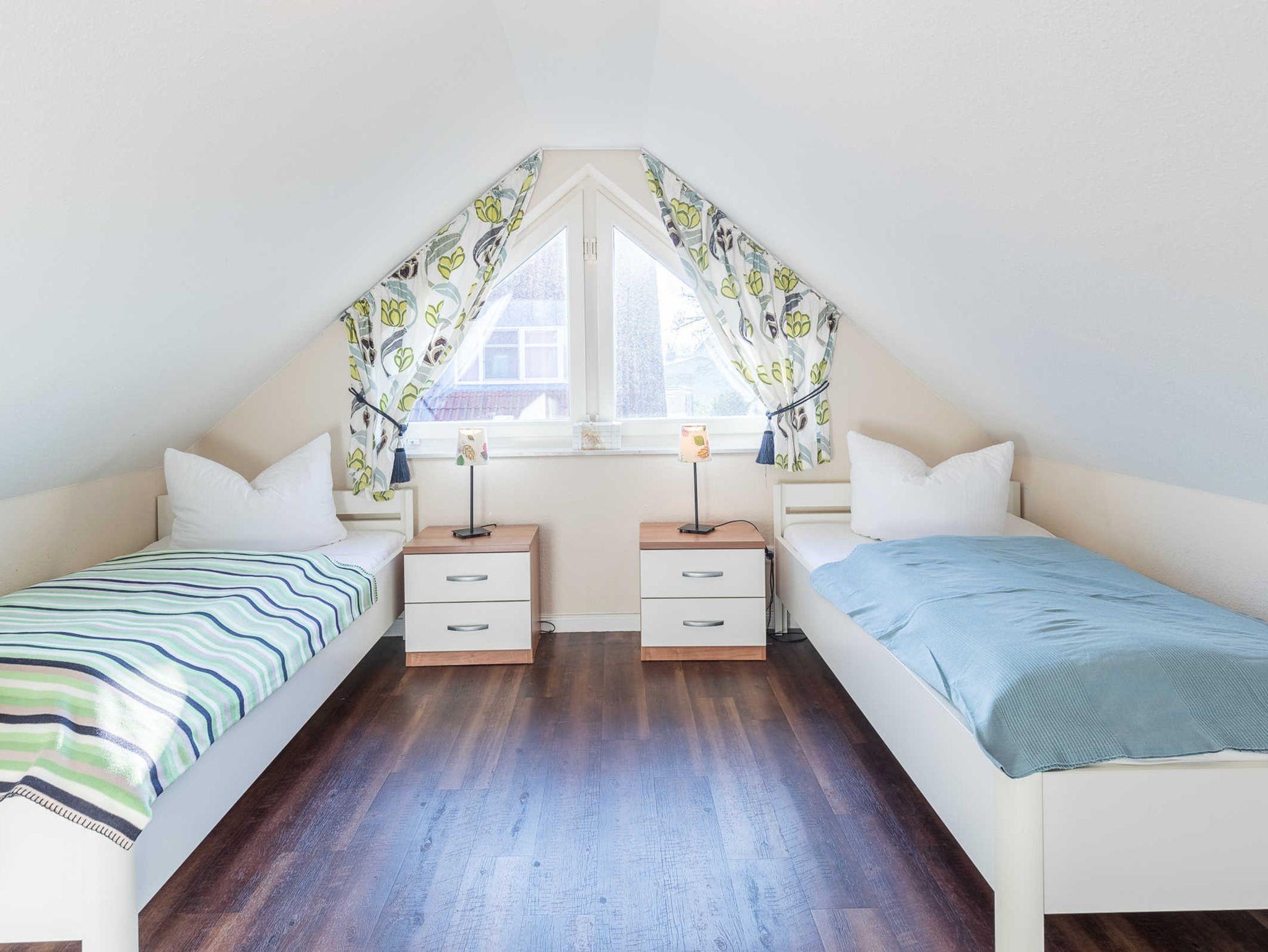 Im Gäste-/ Kinderzimmer gegenüber sorgen zwei Einzelbetten für einen erholsamen Schlaf. Für Ihre Garderobe gibt es hier 2 Kommoden. An den Gaubenfenstern befinden sich Gardinen und Rollos zum Abdunkeln.