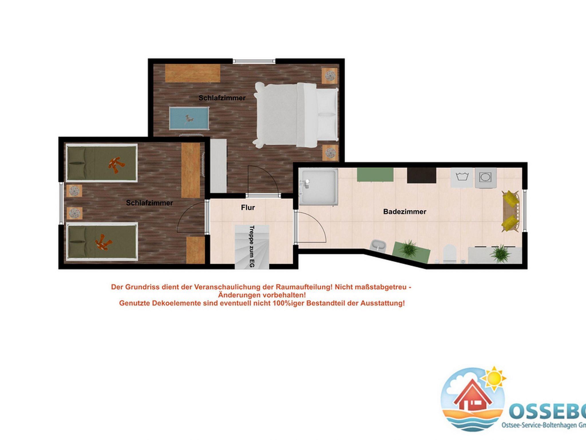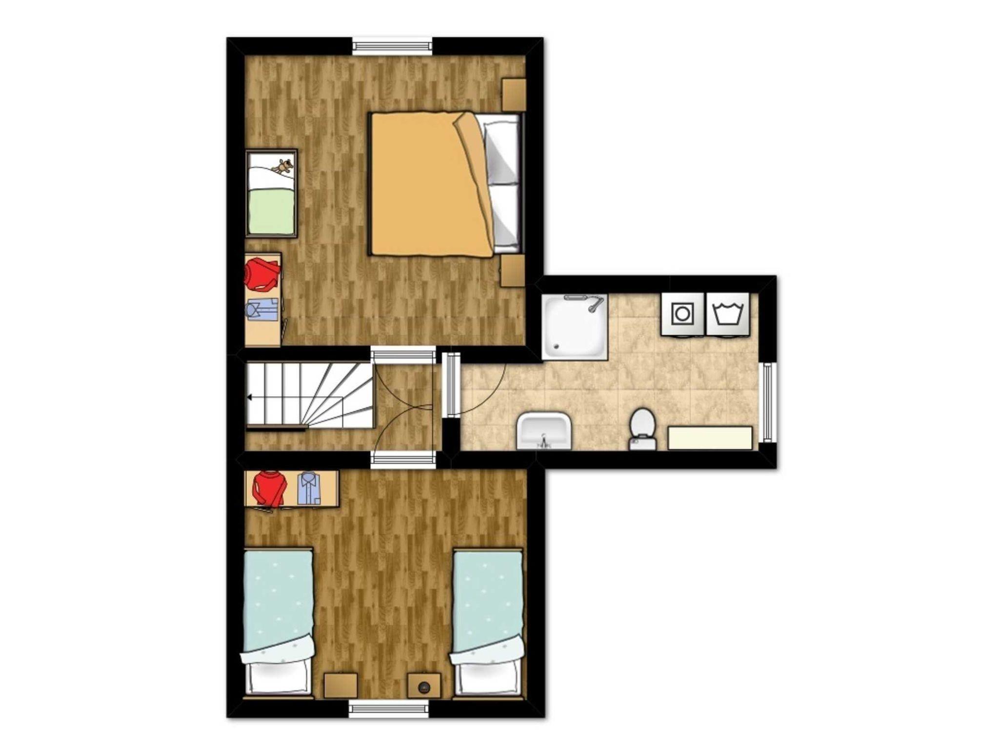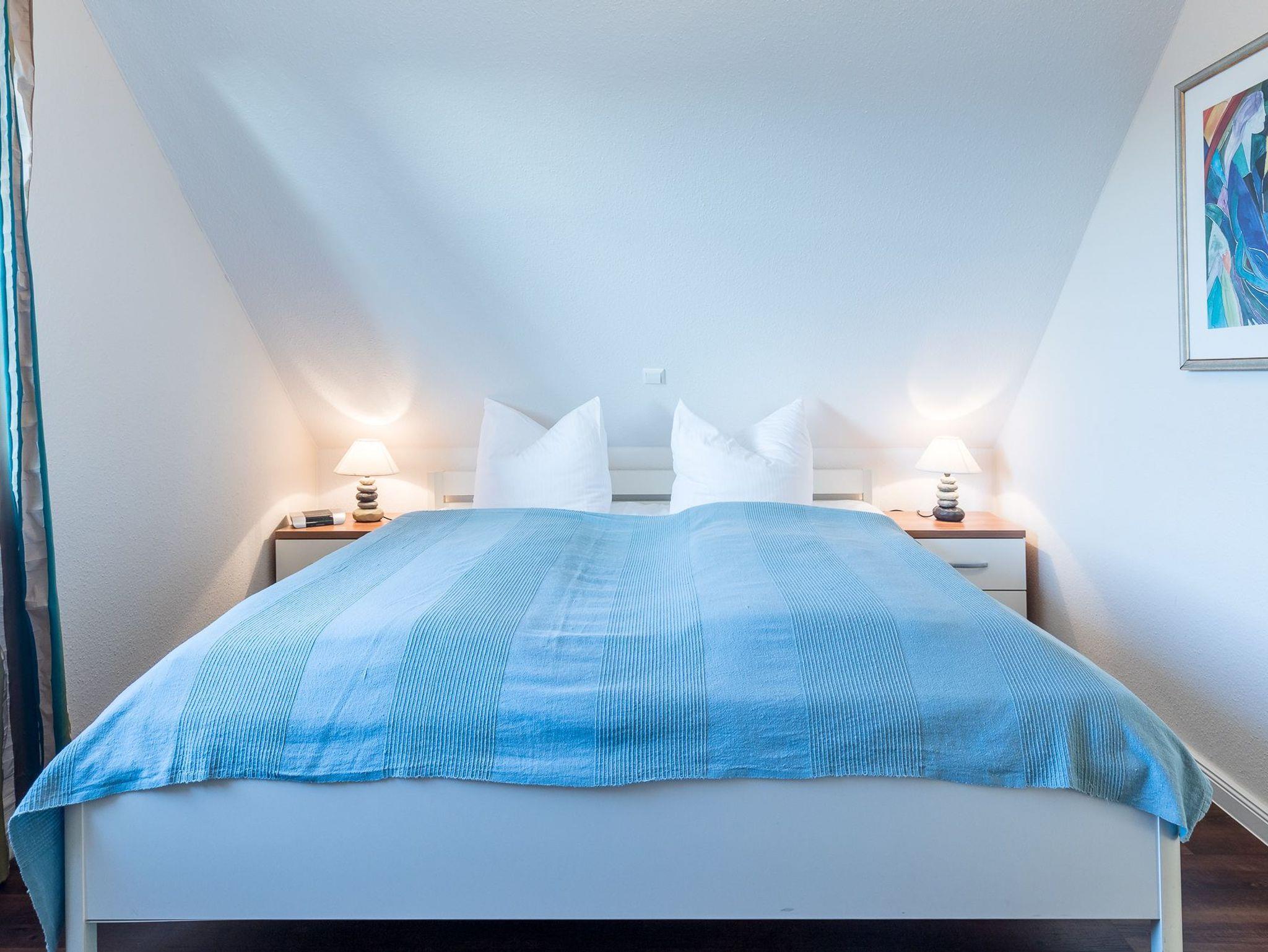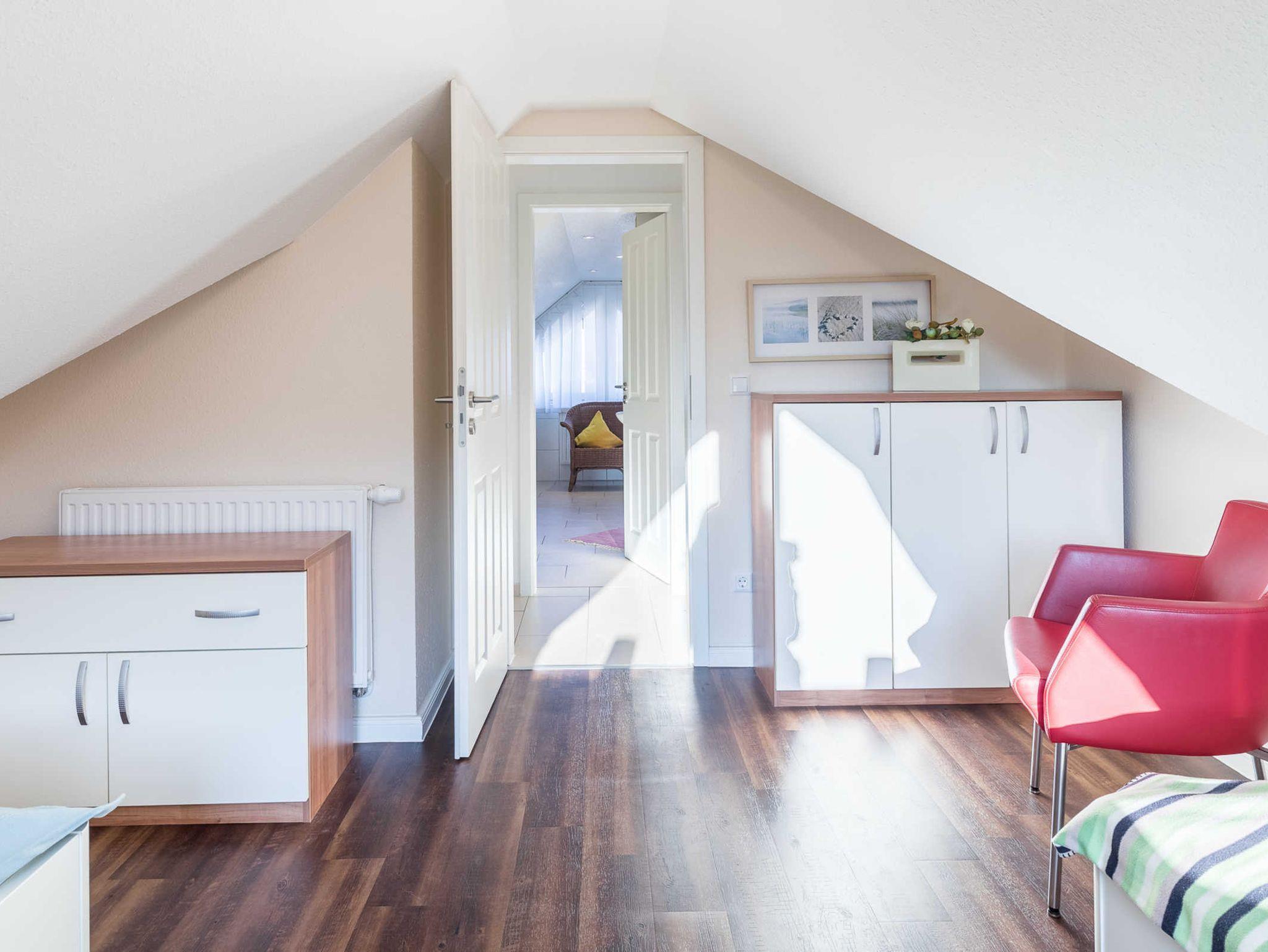 Im Gäste-/ Kinderzimmer gegenüber sorgen zwei Einzelbetten für einen erholsamen Schlaf. Für Ihre Garderobe gibt es hier 2 Kommoden. An den Gaubenfenstern befinden sich Gardinen und Rollos zum Abdunkeln.