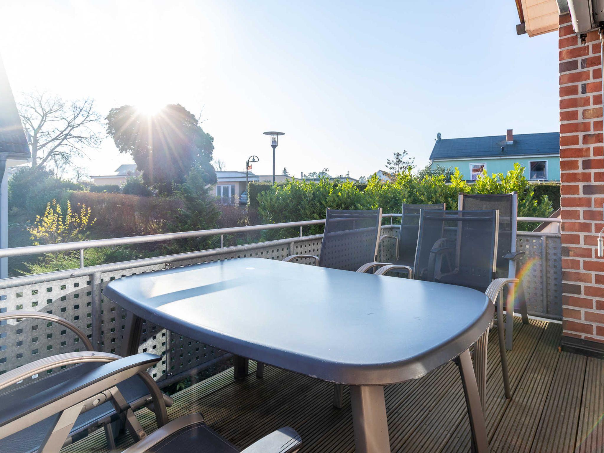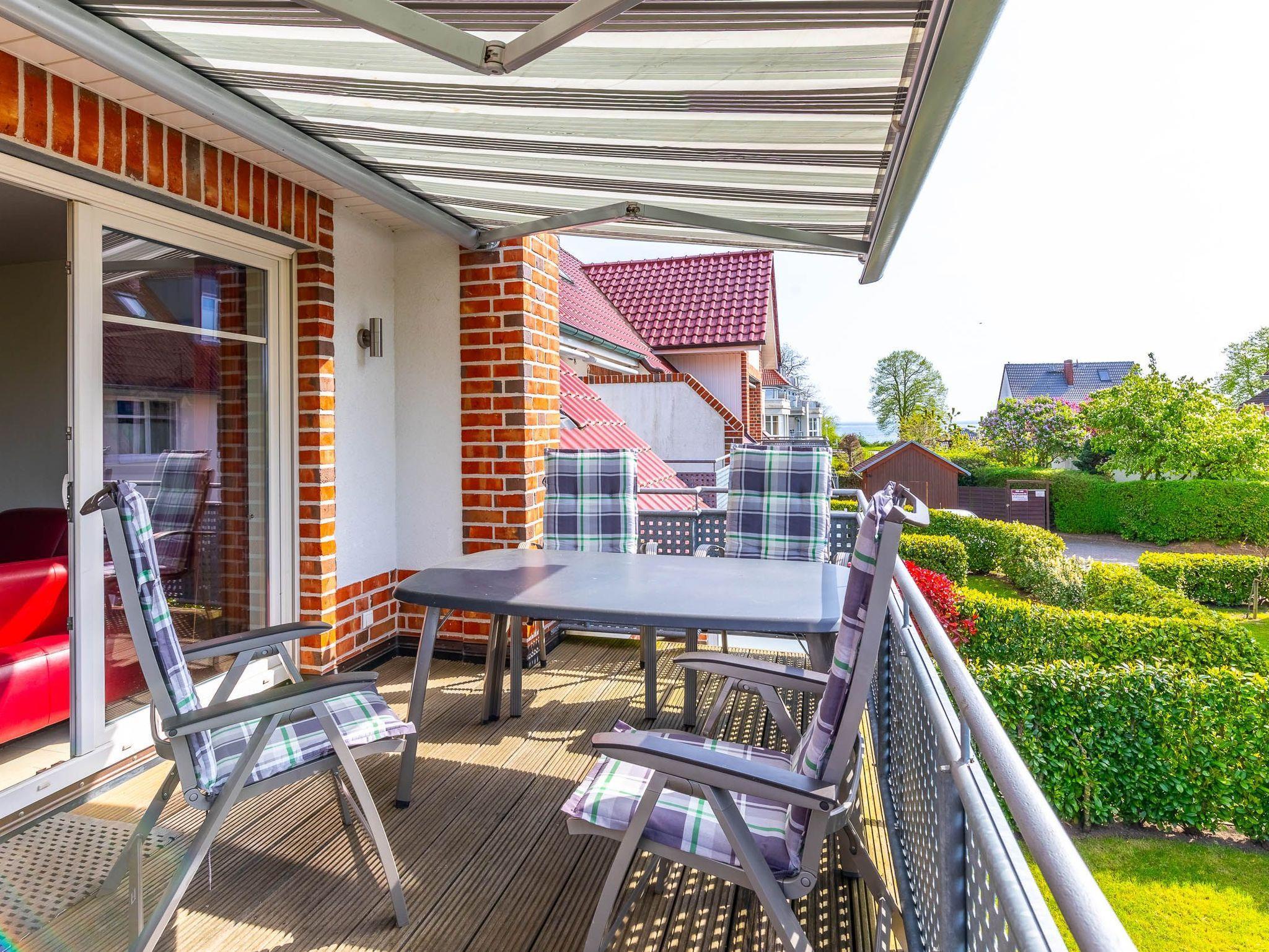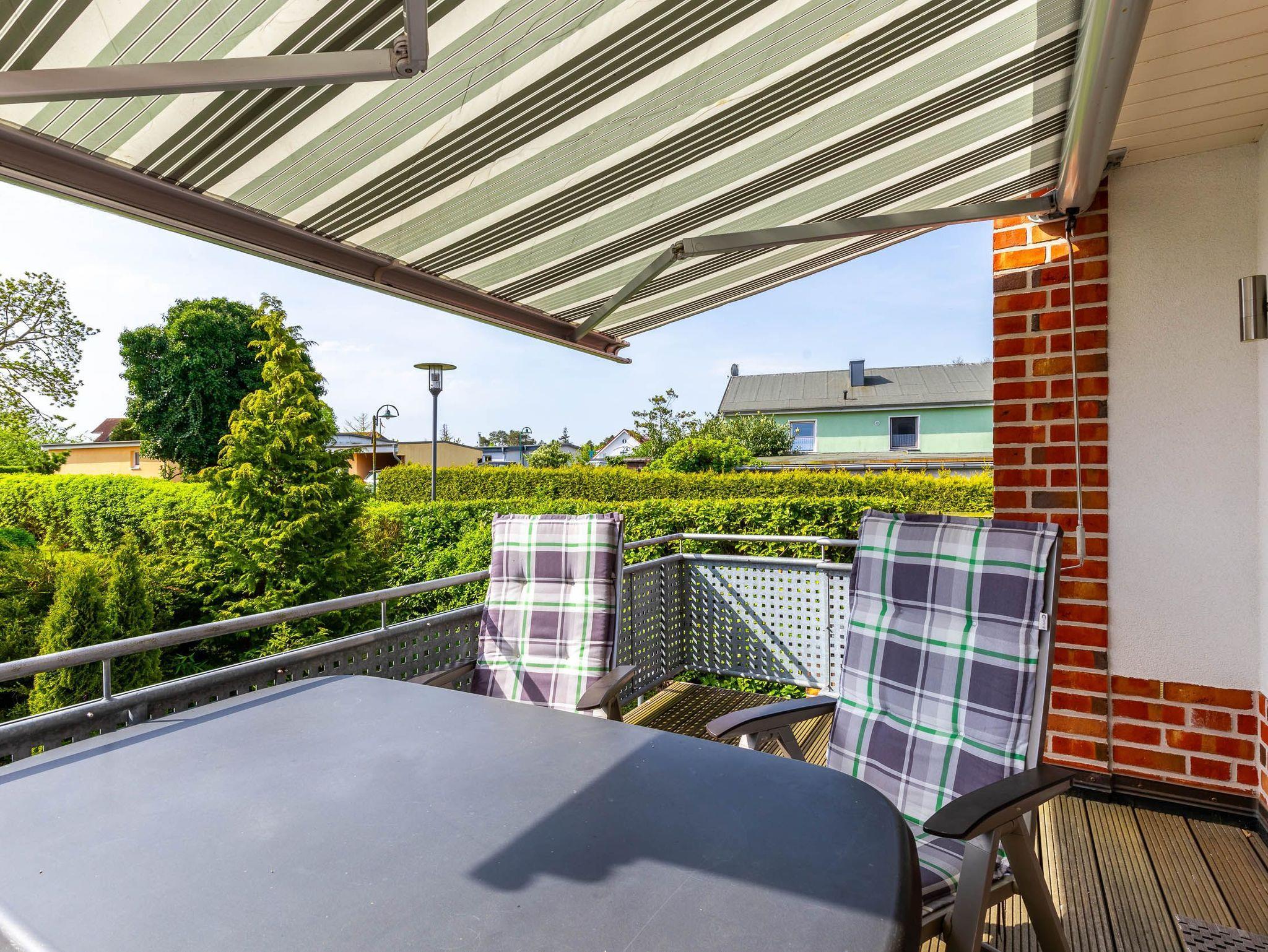 Auf dem angrenzenden möblierten Balkon mit Südostausrichtung, den Sie vom Wohnzimmer aus erreichen, finden Sie an sonnigen Tagen unter der Markise Schatten und Entspannung.